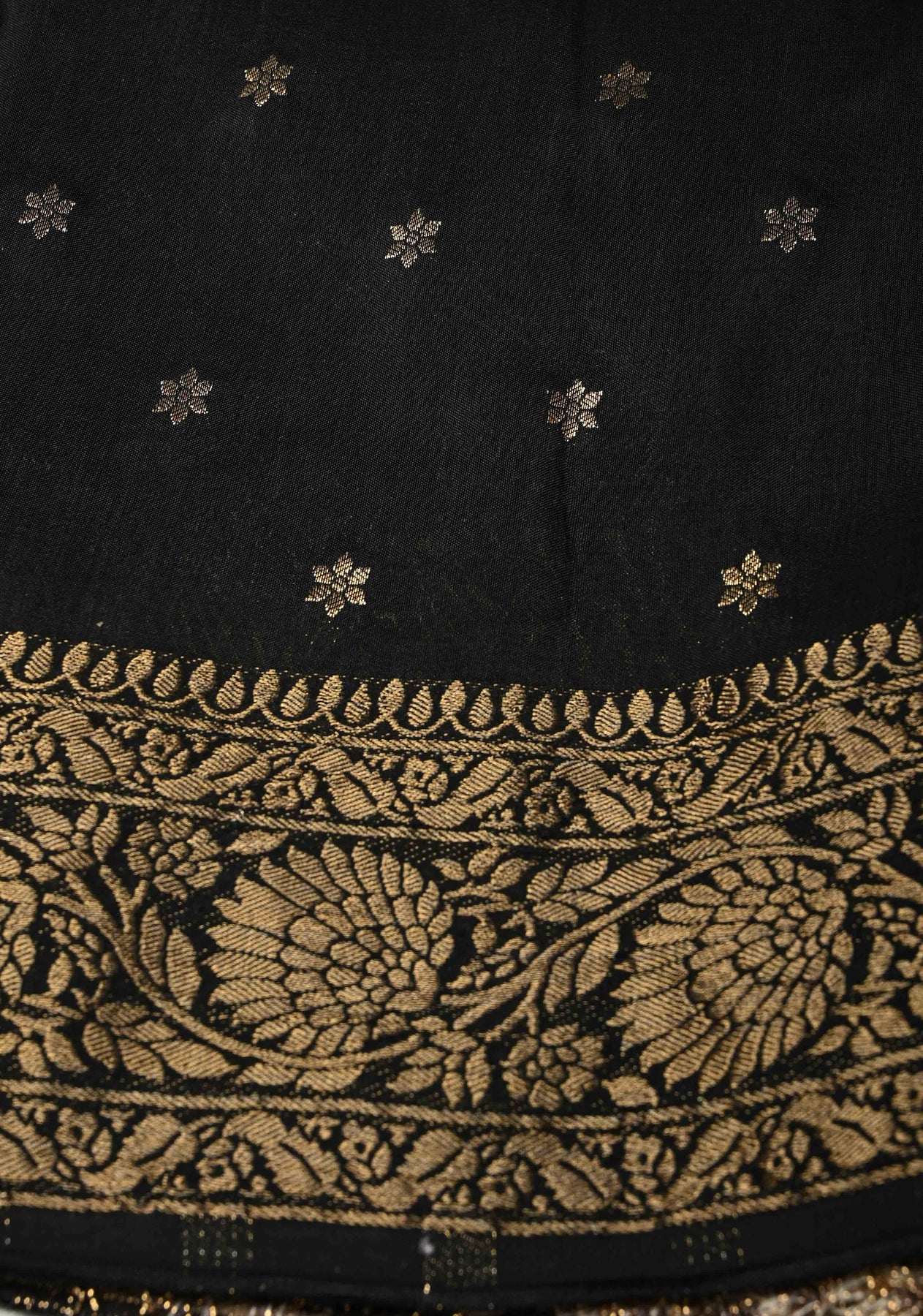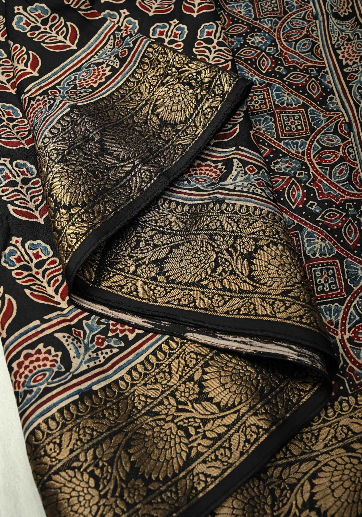 Black Dola Silk Saree with Hand Block Print and Fancy Zari Border