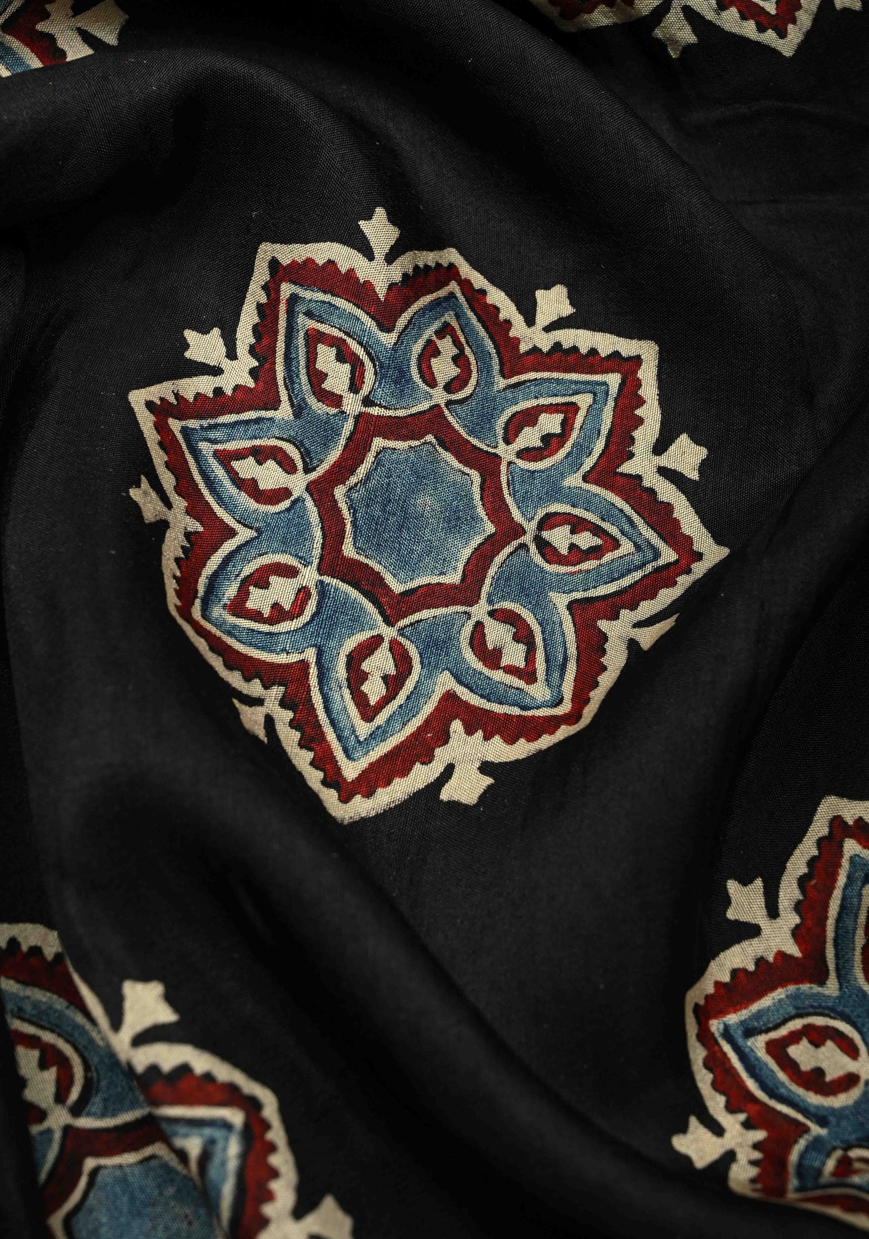 Black Dola Silk Saree with Mandala Hand Block Print and Fancy Zari Border