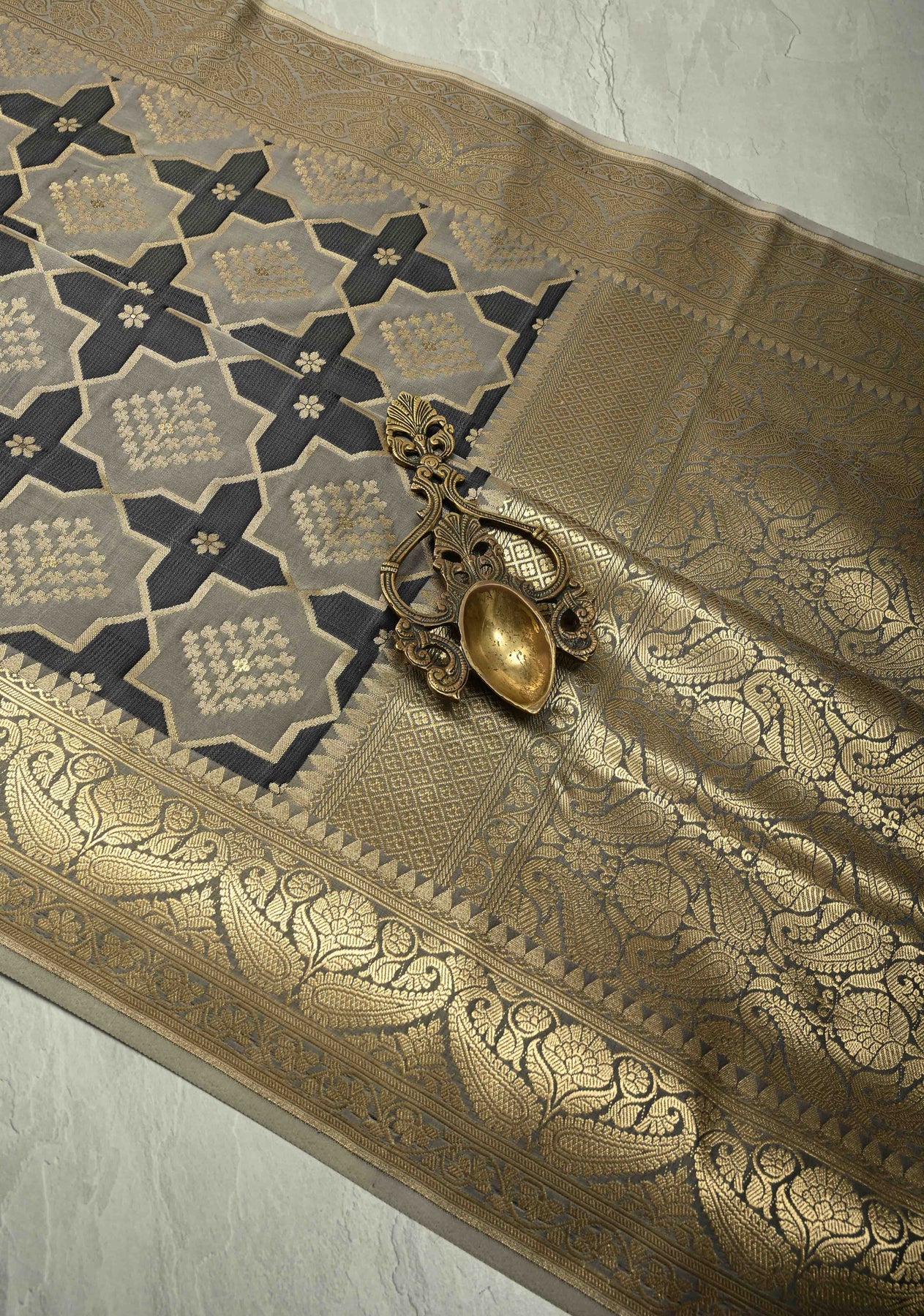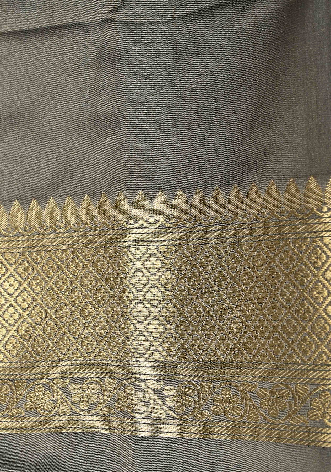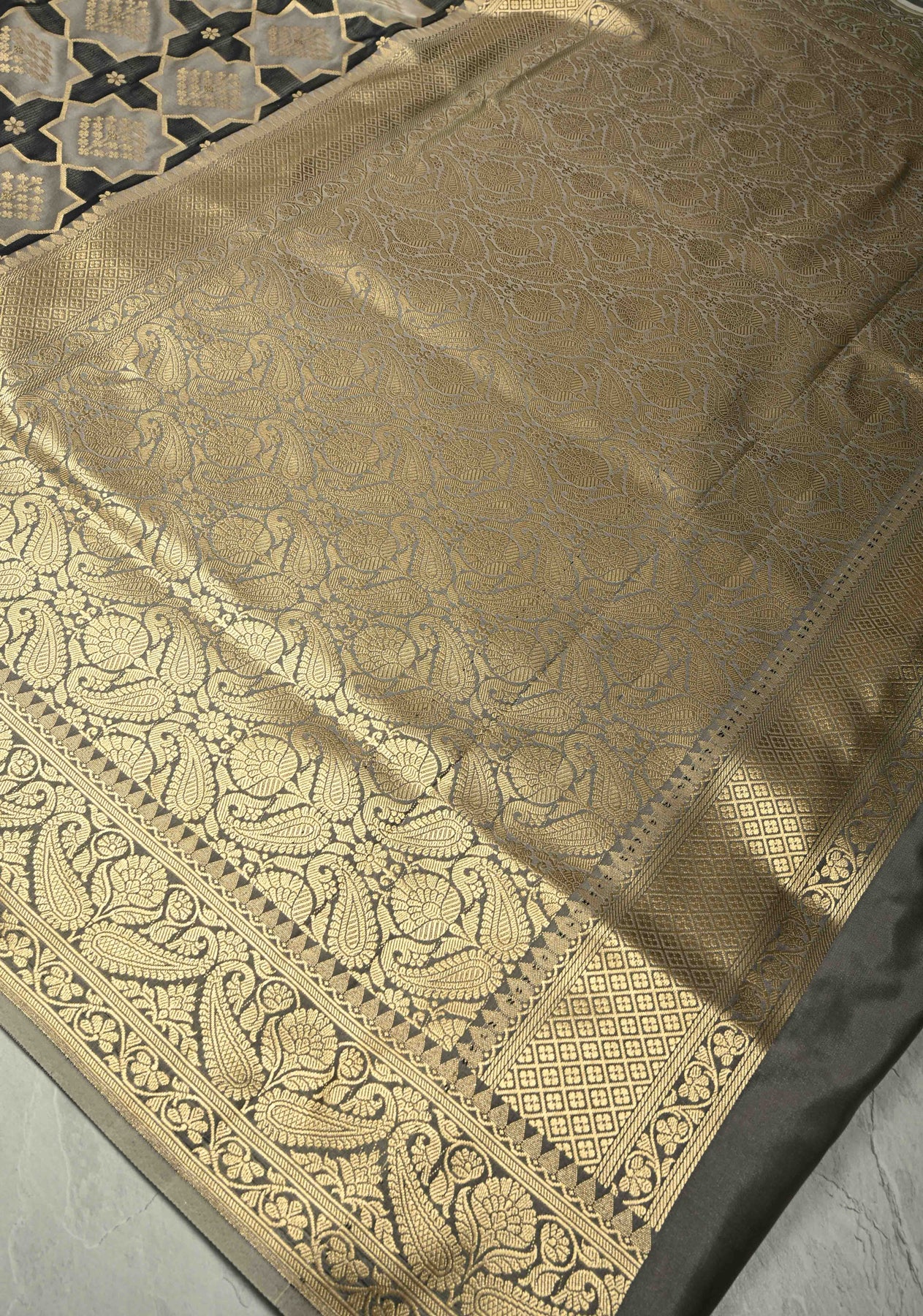 Bold, modern, and irresistibly elegant, this Black-Gray Banarasi Semi Mashru Silk Saree blends traditional Banarasi artistry with contemporary design. The rich semi mashru silk body features striking vertical stripes in black and gray, creating a sleek and elongated silhouette. Intricate geometric brocade motifs add depth and sophistication, giving the saree a refined designer appeal.