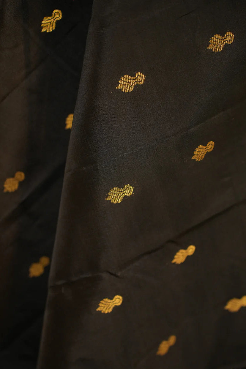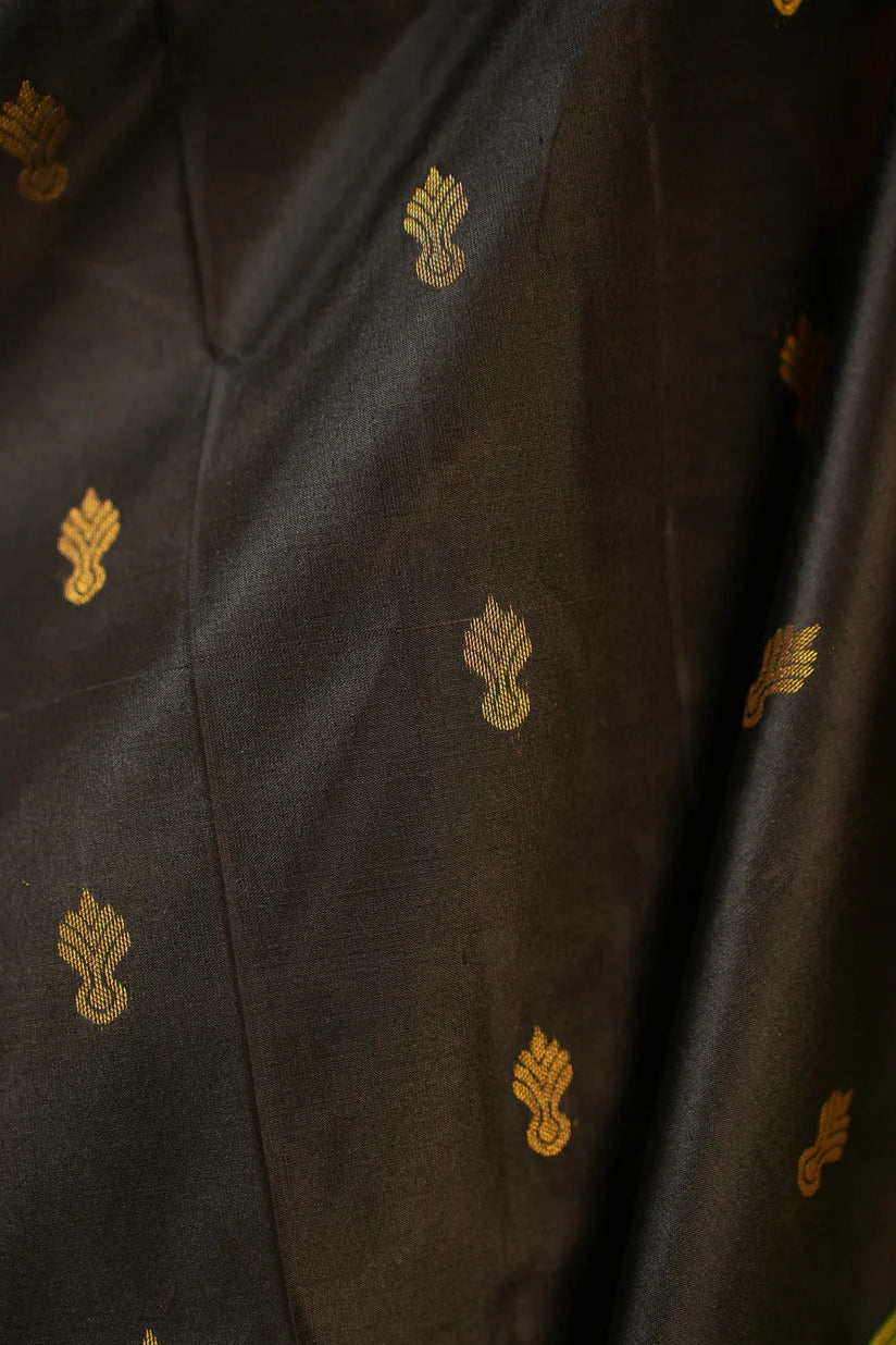 Black Kanjivaram Handloom Saree with Zari Buttas and Green Contrast Border | SILK MARK CERTIFIED