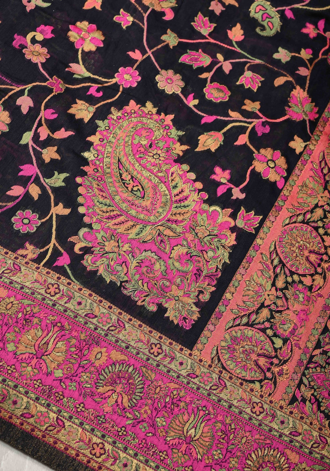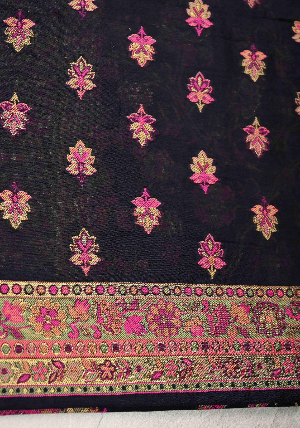 Gracefully designed, this Black Rayon Saree features a mesmerizing Meenakari floral jaal that beautifully covers the drape with vibrant, intricate detailing. The rayon fabric ensures effortless draping and comfort, making it perfect for both festive and casual wear. Adding to its charm is the traditional Kani design, inspired by Kashmiri artistry, along with striking koniya (corner) motifs that enhance the pallu and border for a refined finish. Elegant and timeless, this saree is a perfect choice for women who appreciate heritage craft with a modern touch.