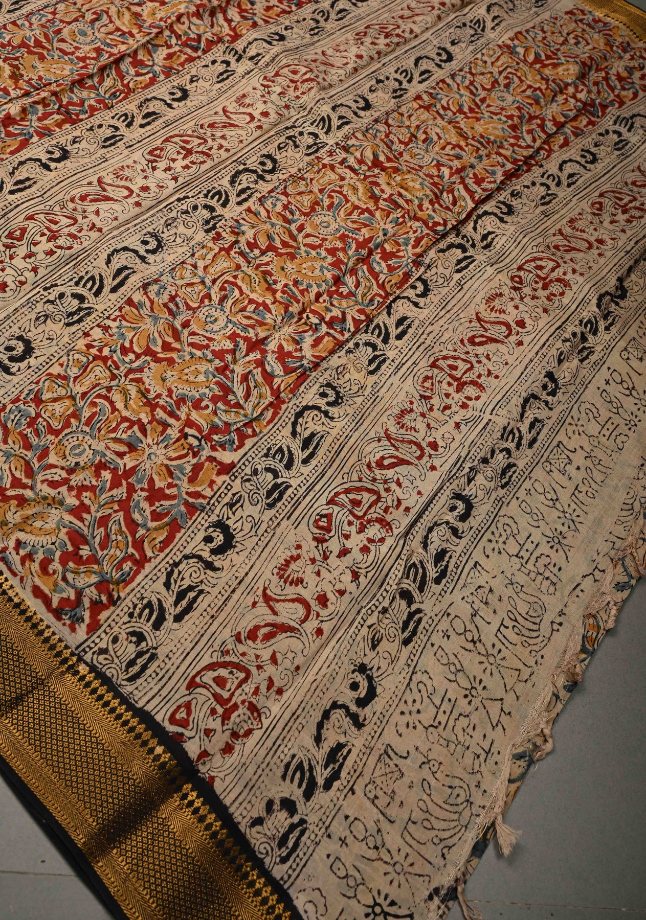 Bold, vibrant, and timeless, this Blood Red Kalamkari Hand Block Print Saree on Mangalagiri Cotton celebrates the tradition of Indian textile artistry. Crafted from Mangalagiri cotton, the saree is lightweight, breathable, and soft to the touch, offering comfort alongside elegance.