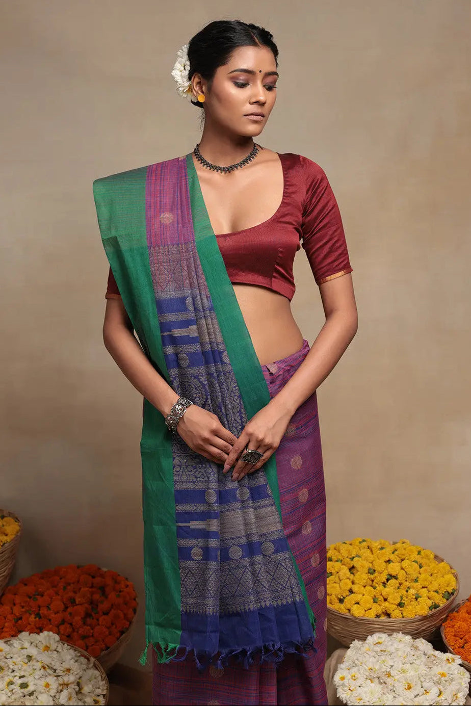 Experience the enchantment of our stunning blue and pink Handloom Pure Cotton Saree - a true fusion of traditional craftsmanship and contemporary design. Meticulously handwoven by skilled artisans, it exudes timeless elegance with its sophisticated black hue, complemented by captivating grey bootis and a duo-tone pattern. Lightweight and breathable, this saree ensures comfort while being a unique piece of art with intricate weaving. Embrace the beauty of this magnificent creation and be the center of attention on any occasion.