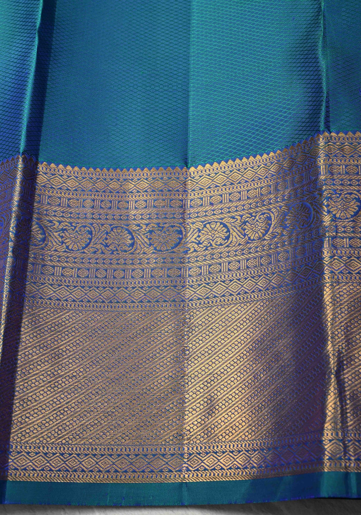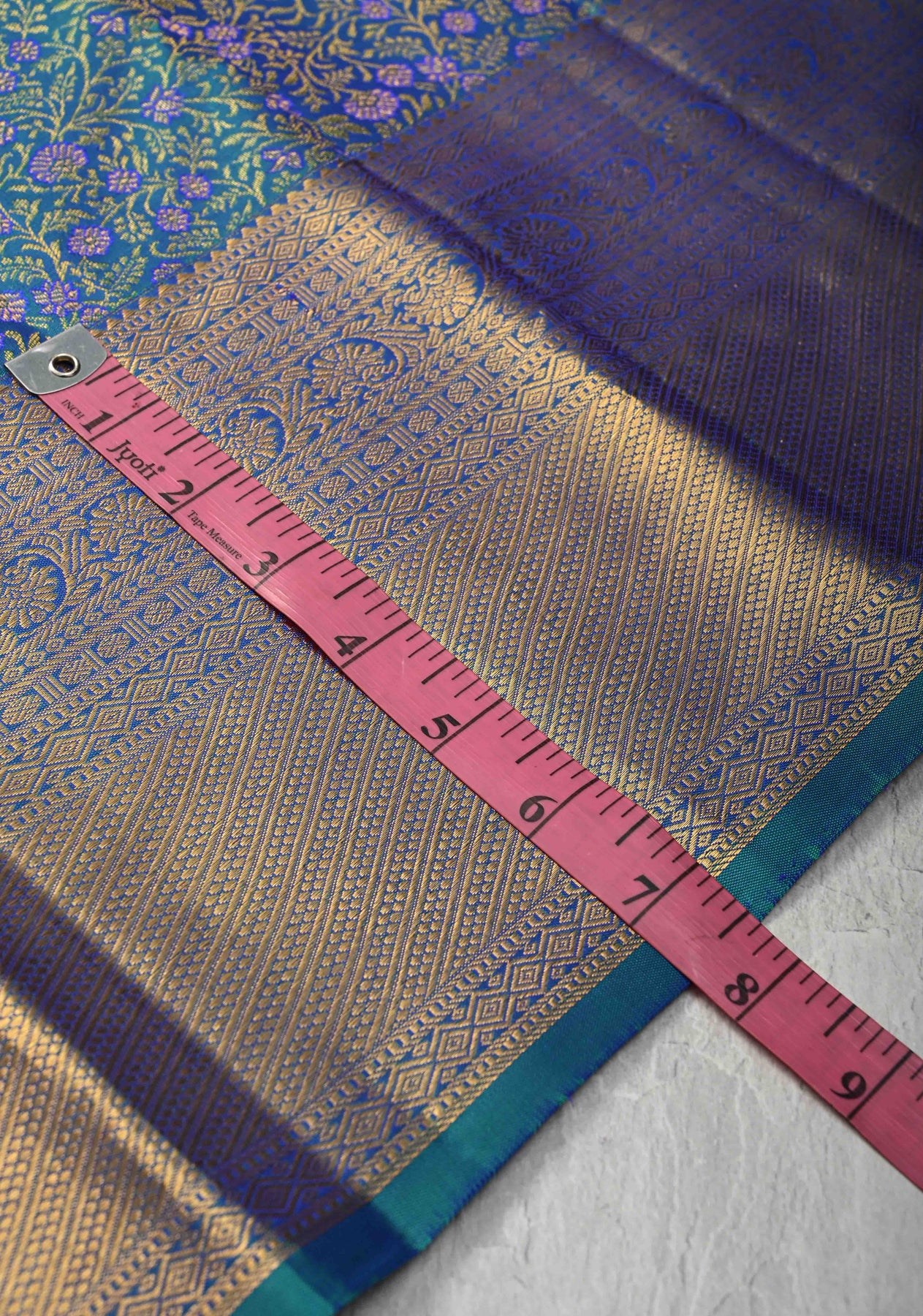 Radiating grandeur and timeless beauty, this Blue-Green Dual Tone Pure Kanjivaram Silk Saree is a stunning blend of traditional artistry and vibrant elegance. Woven from the finest pure Kanjivaram silk, it features a rich dual-tone effect that shifts beautifully between blue and green under light. The body is adorned with intricate Meenakari floral brocade, showcasing vivid multicolored motifs that reflect the mastery of South Indian weaving traditions. A shimmering zari border with classic Kanjivaram patterns adds a regal touch, enhancing the saree’s luxurious appeal. Perfect for weddings, festive celebrations, and grand occasions, this saree is a true heirloom piece.