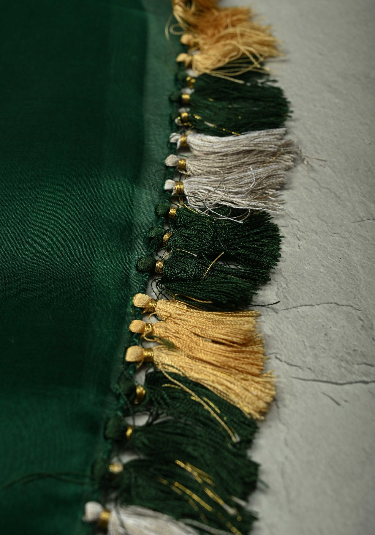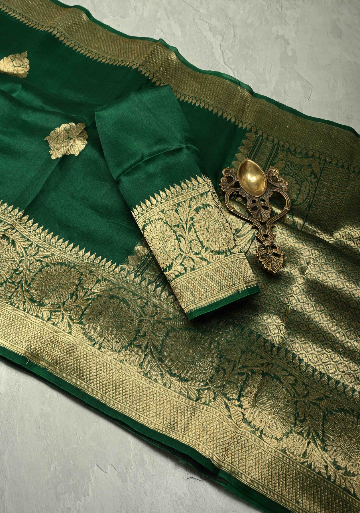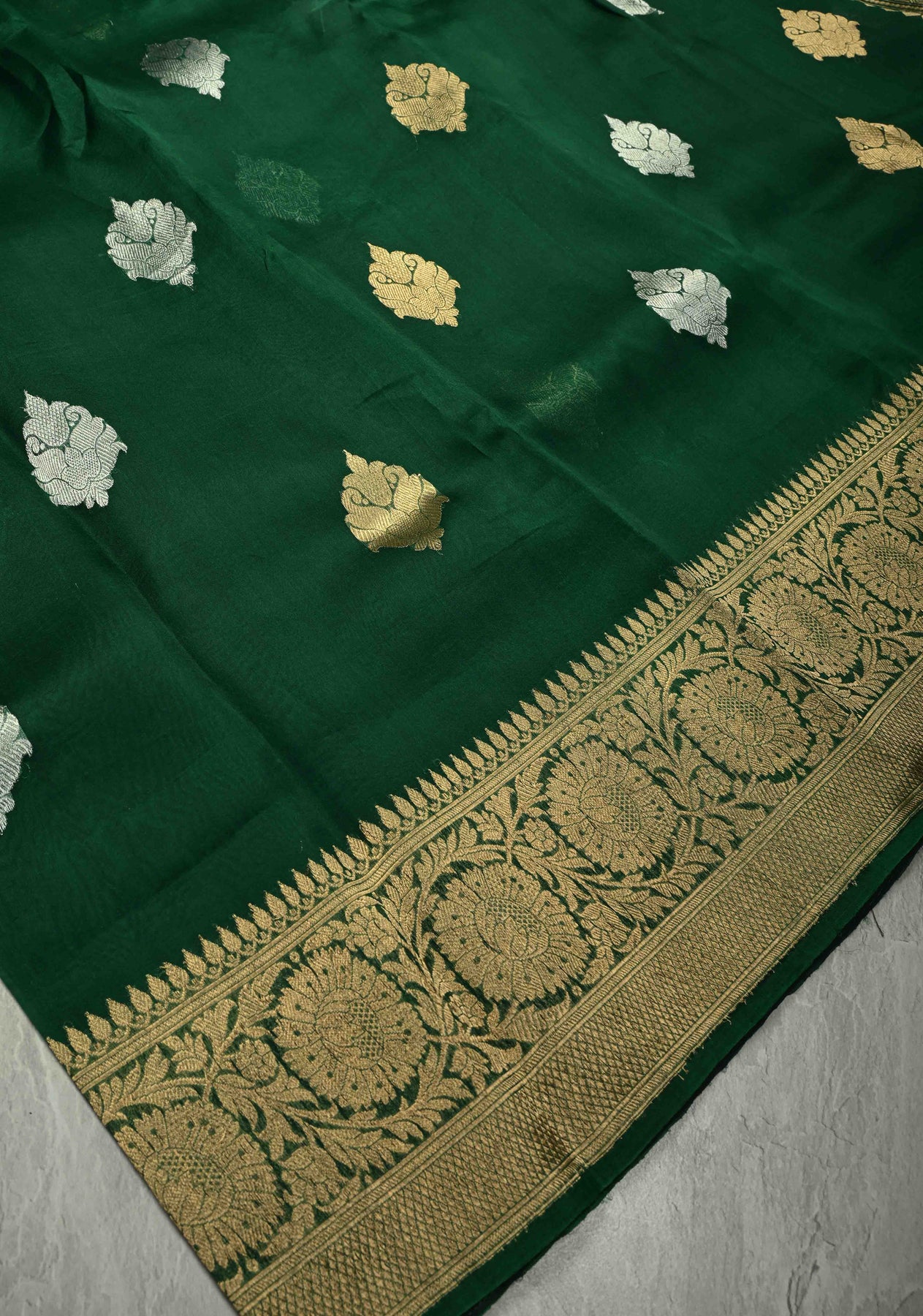 Bottle Green Banarasi Semi Kora Saree with Sona Rupa Buttas and Zari Border