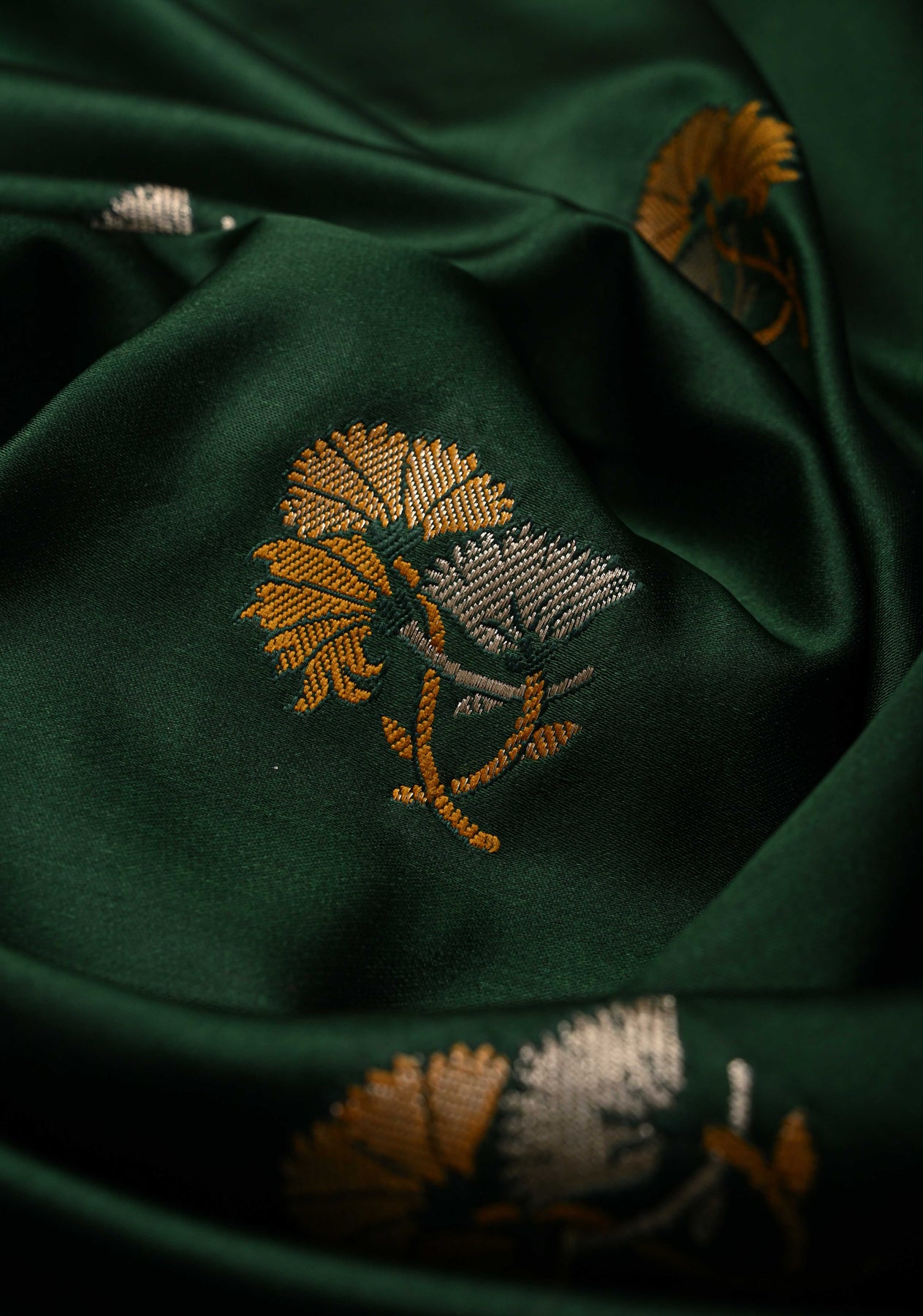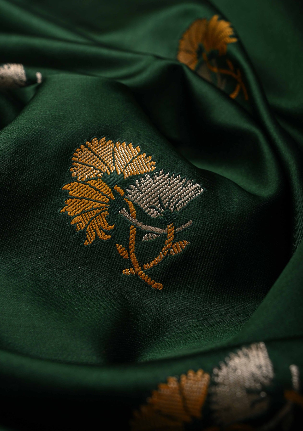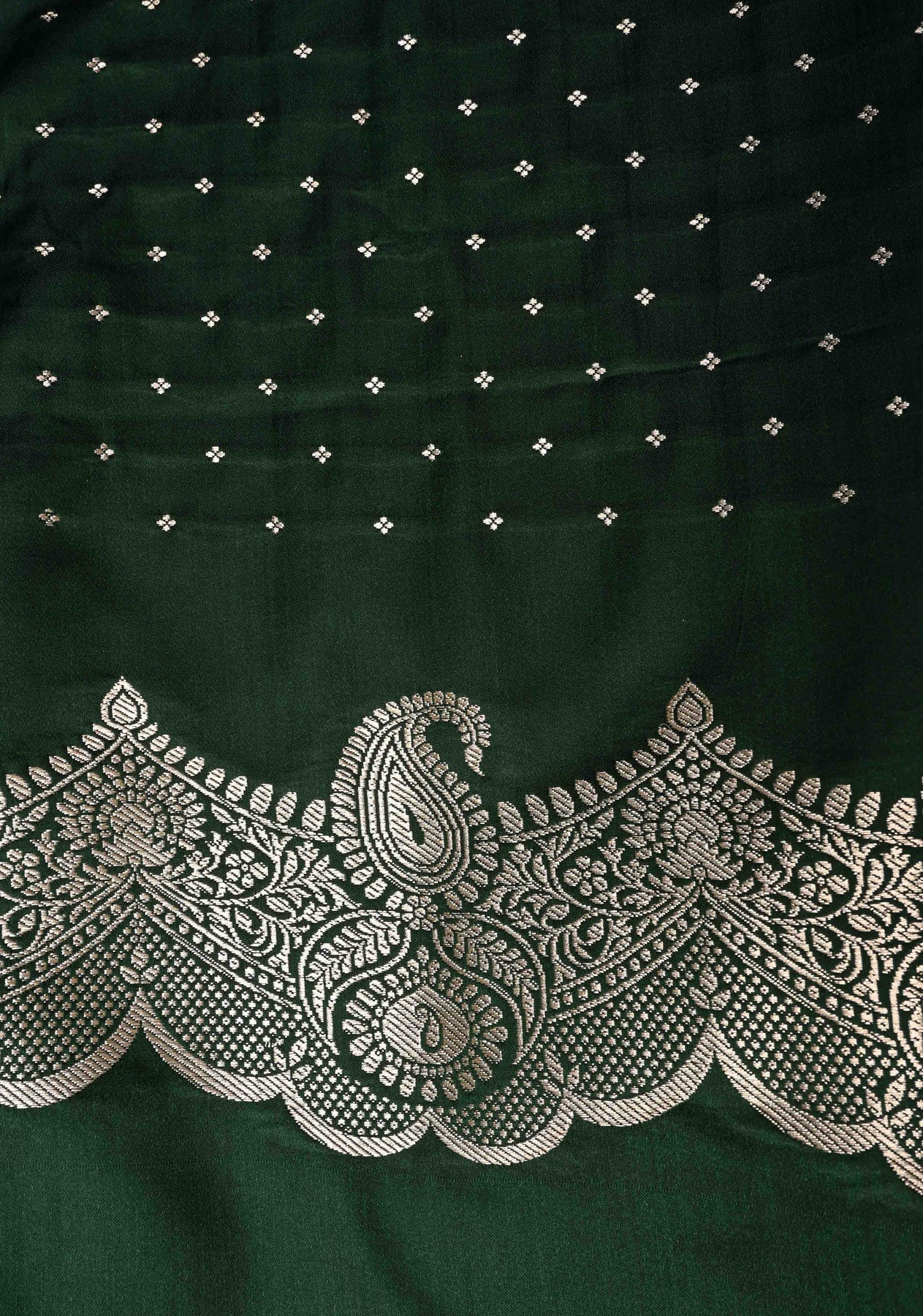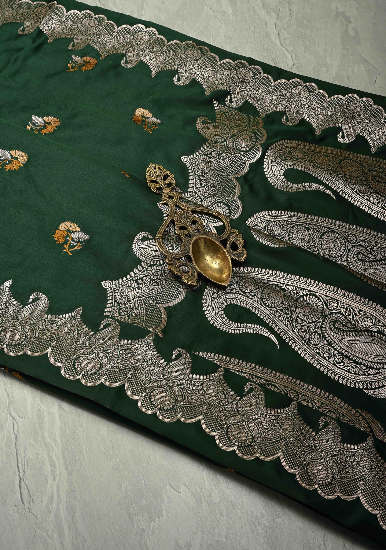 Step into elegance with this Bottle Green Banarasi Semi Mashru Silk Saree, expertly handwoven to offer a smooth, lustrous drape with texture. The saree is adorned with delicate Meenakari floral buttas, adding intricate detailing and a subtle sparkle across the deep green base.