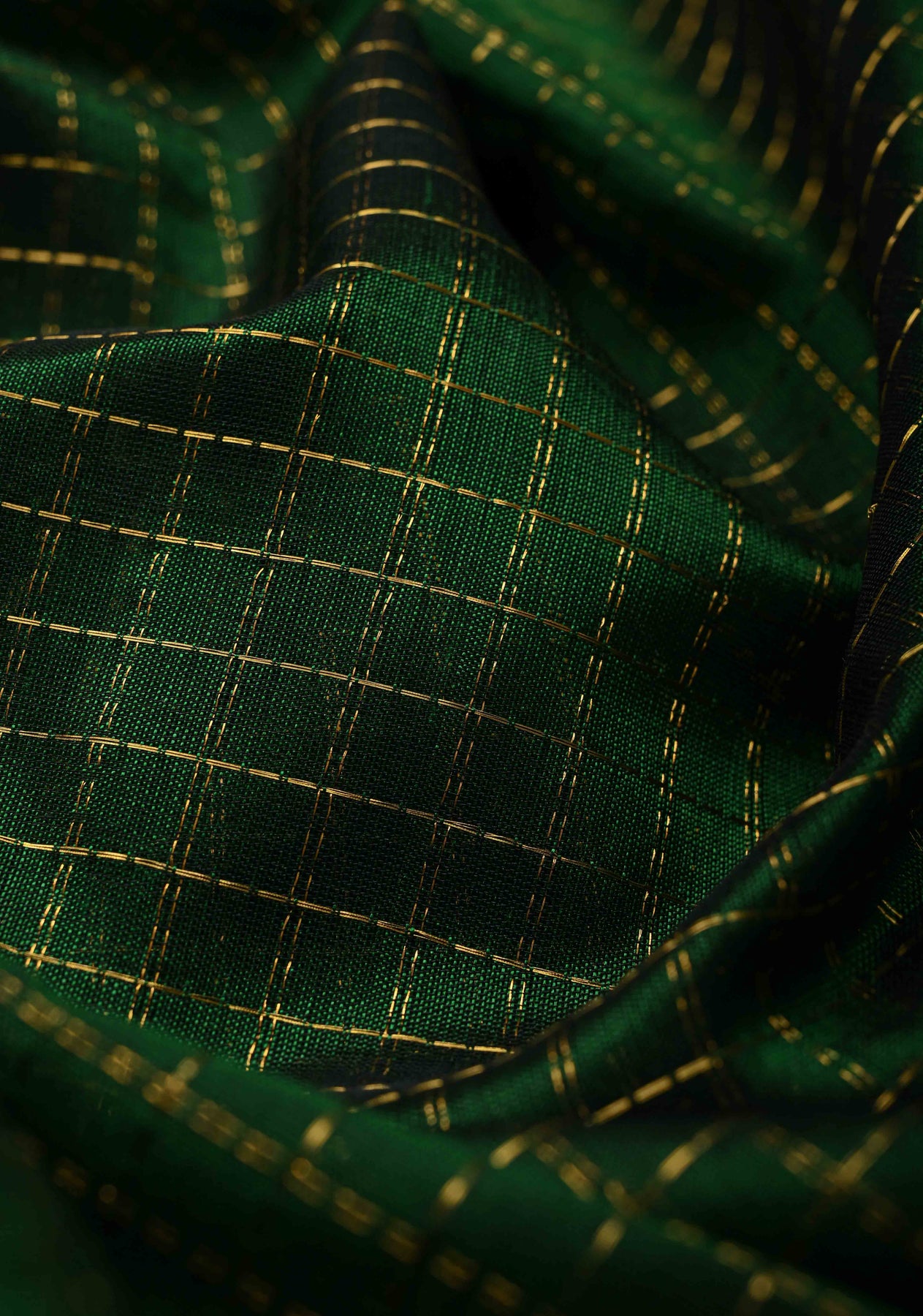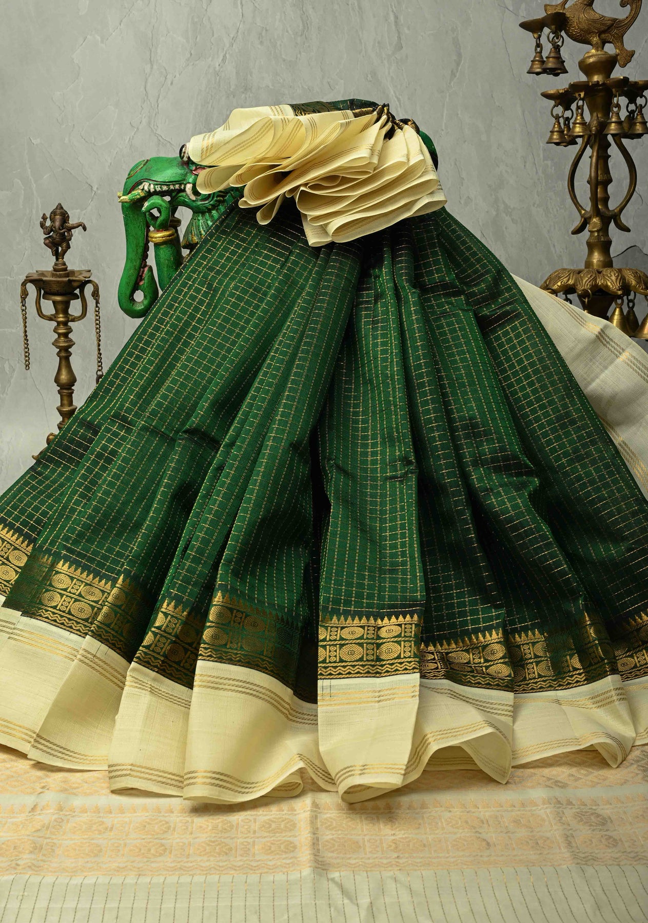 Step into timeless elegance with this Bottle Green Kanchi Silk Cotton Saree, beautifully handwoven with intricate zari checks that add a subtle shimmer to the green base. Crafted from silk cotton, this 100% handloom saree ensures a soft, breathable, and drape for all-day comfort.