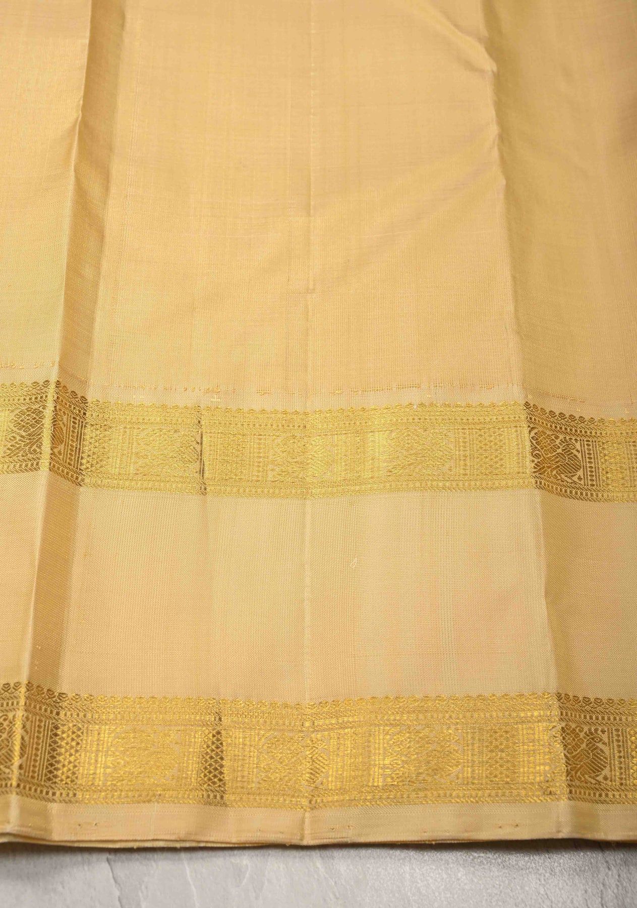 The standout feature is its bold Korvai contrast Rettaipet zari border, created using the traditional Korvai weaving technique that seamlessly joins the contrasting border to the body. Woven in rich gold zari, the border and pallu bring depth, structure, and a regal finish to the saree.