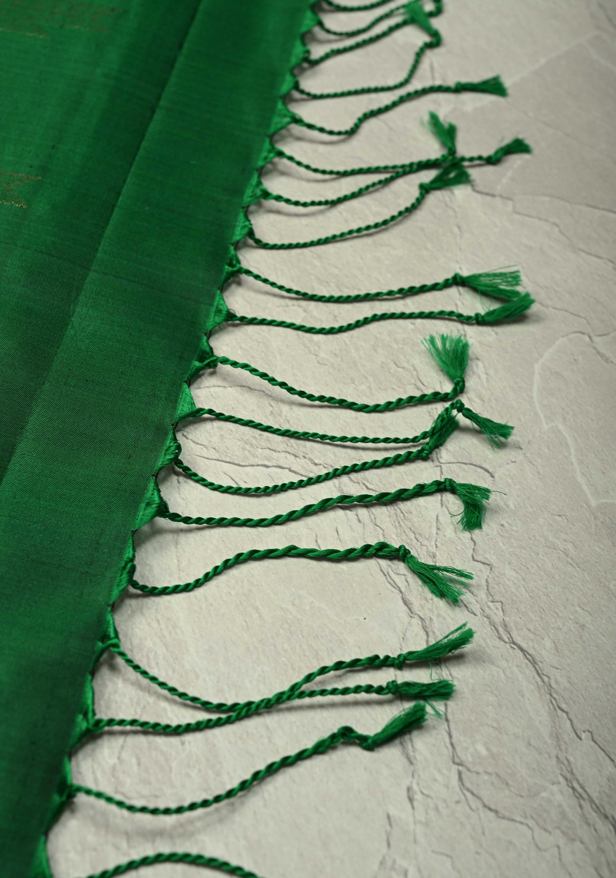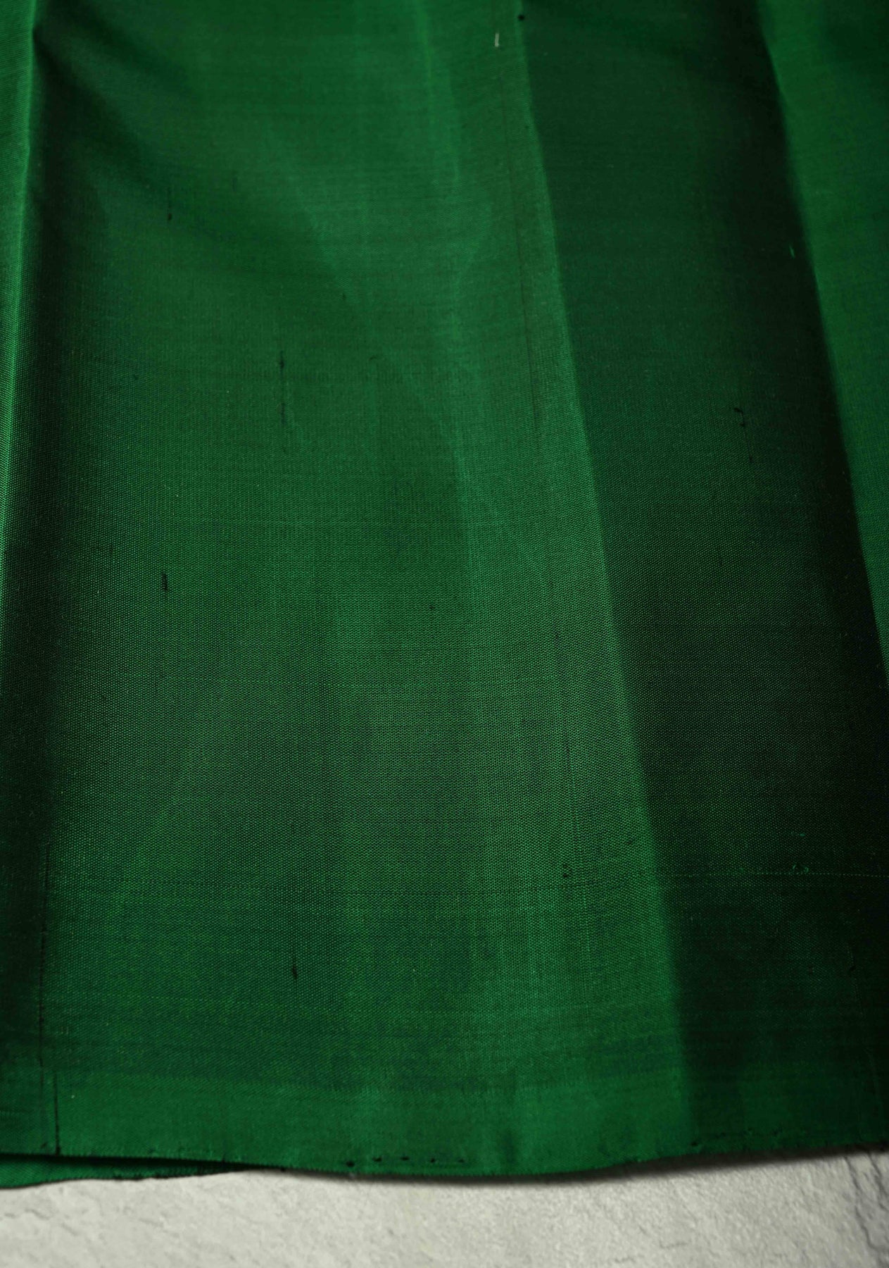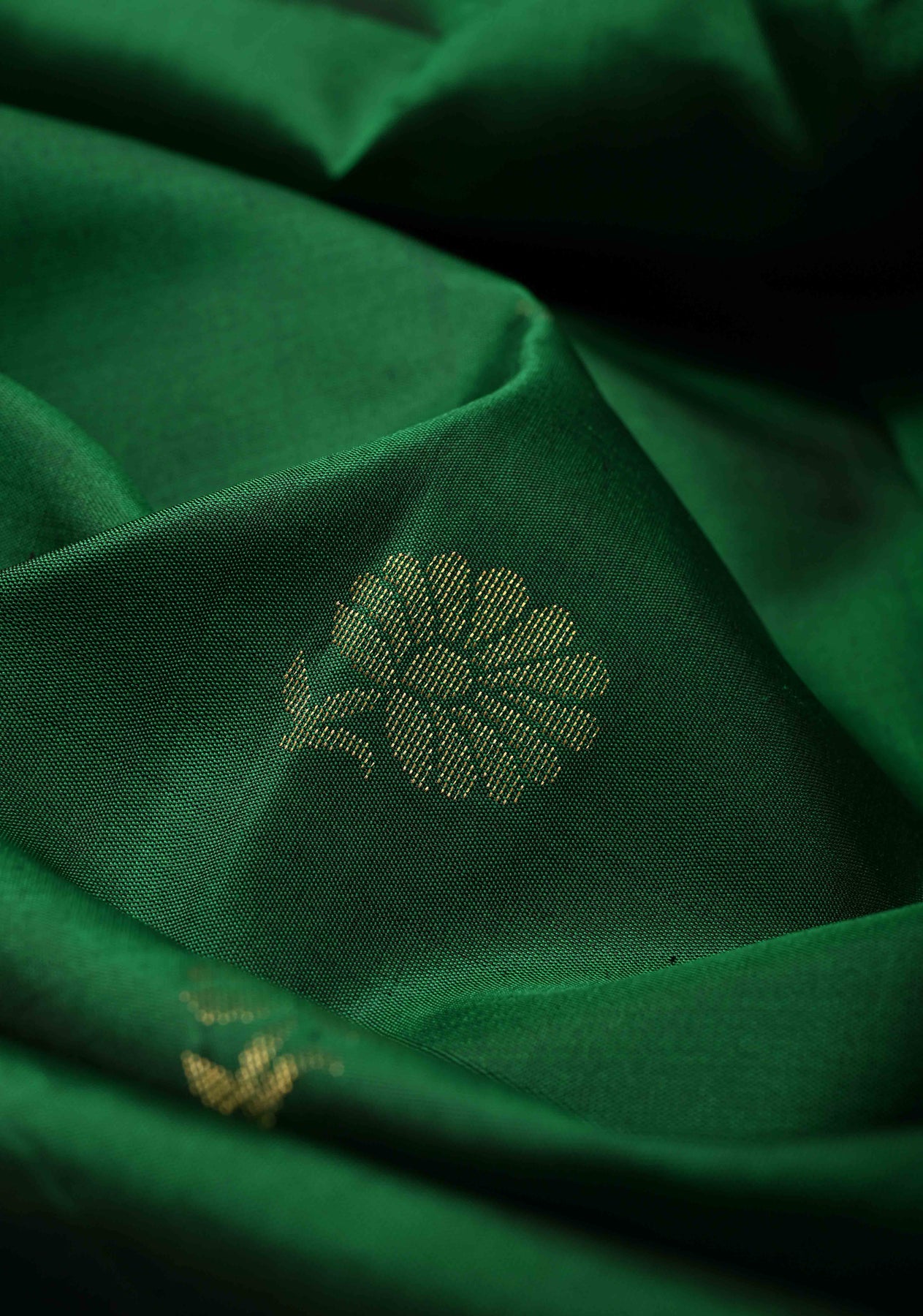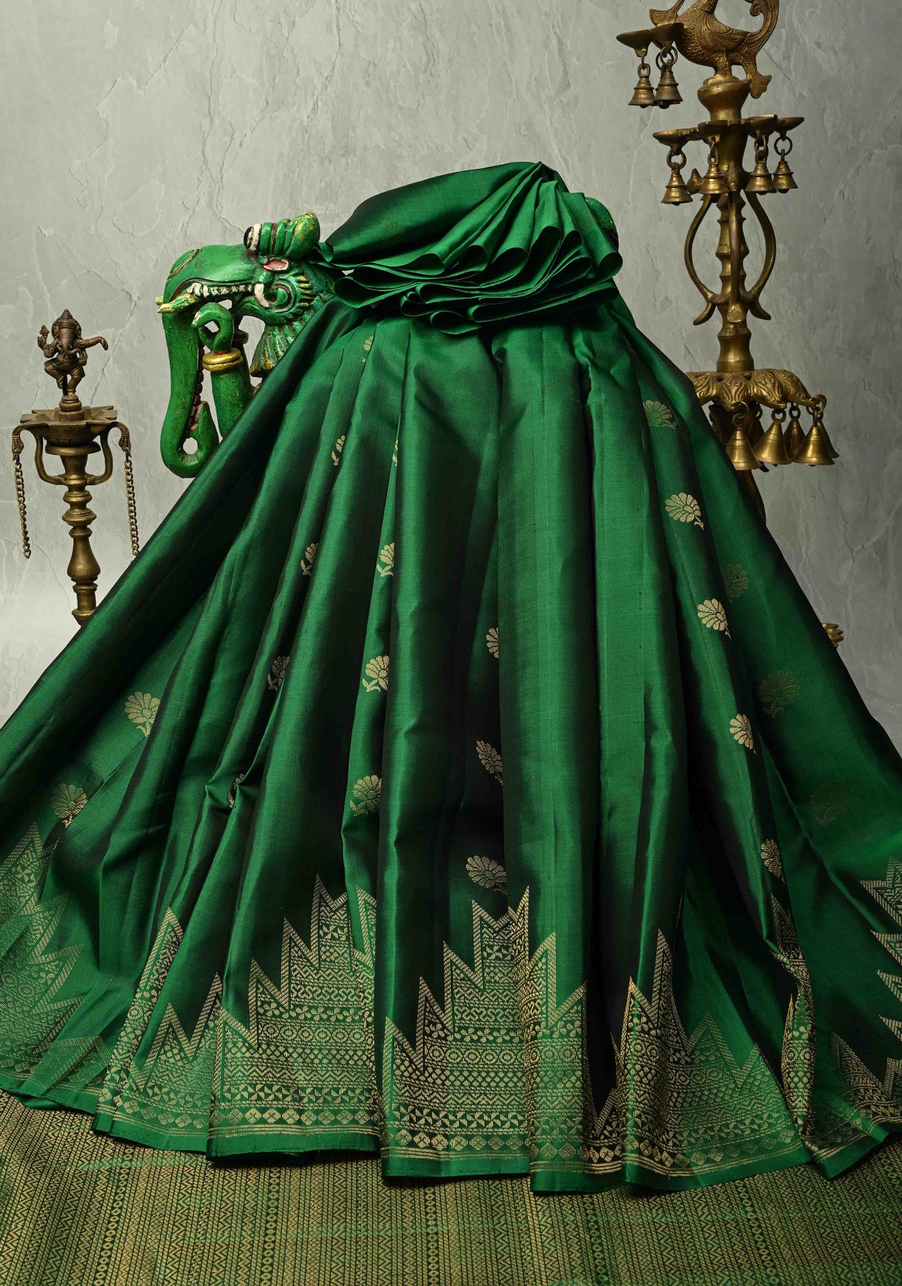 Bottle Green Kanjivaram Soft Silk Saree with Floral Zari Buttas and Temple Zari Border | SILK MARK CERTIFIED