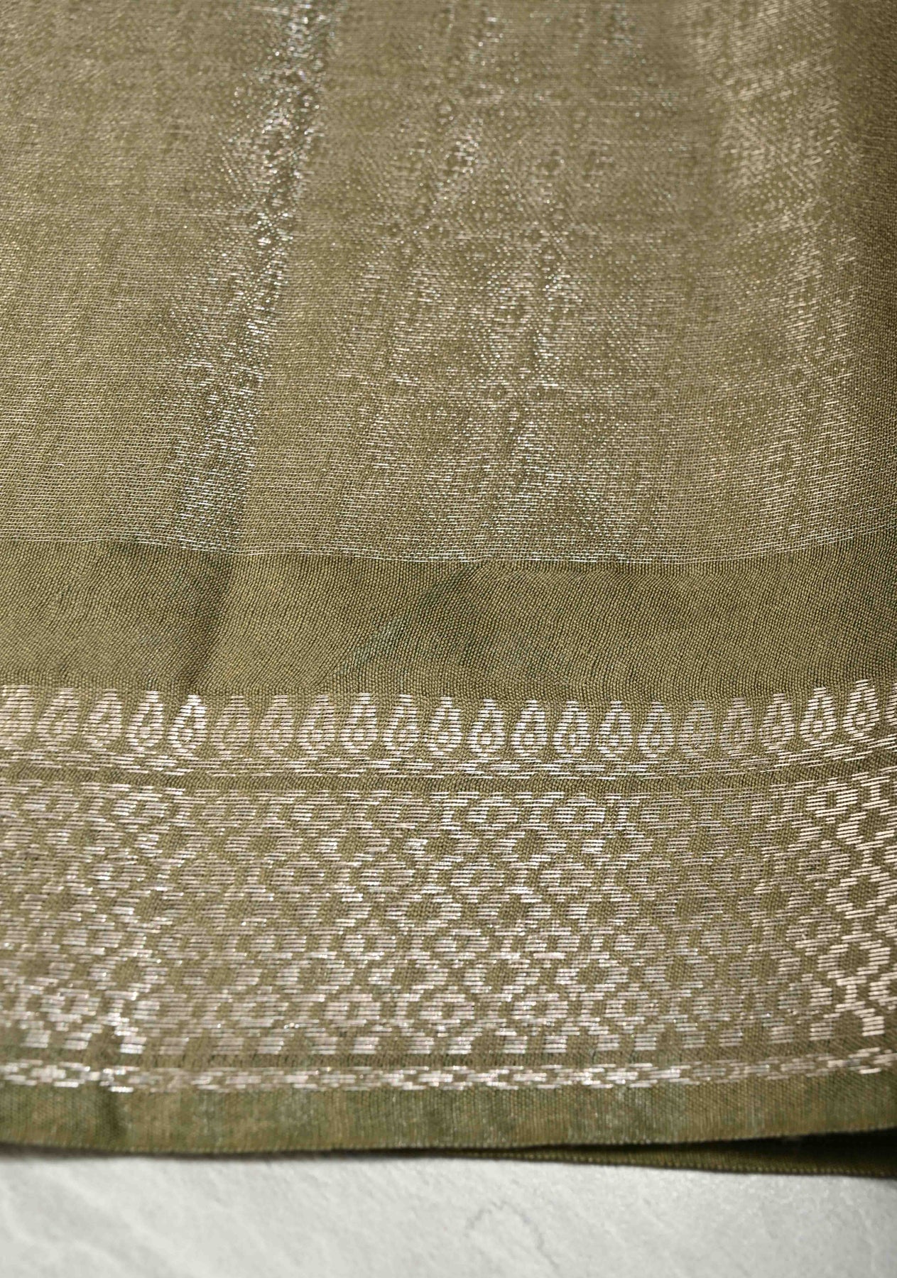Embrace understated luxury with this Brick Red Semi Tussar Tissue Saree. The rich, earthy hue is beautifully enhanced by the luminous sheen of tissue, creating a sophisticated metallic finish. A shimmering zari border adds a regal touch, making it ideal for weddings and festive celebrations.