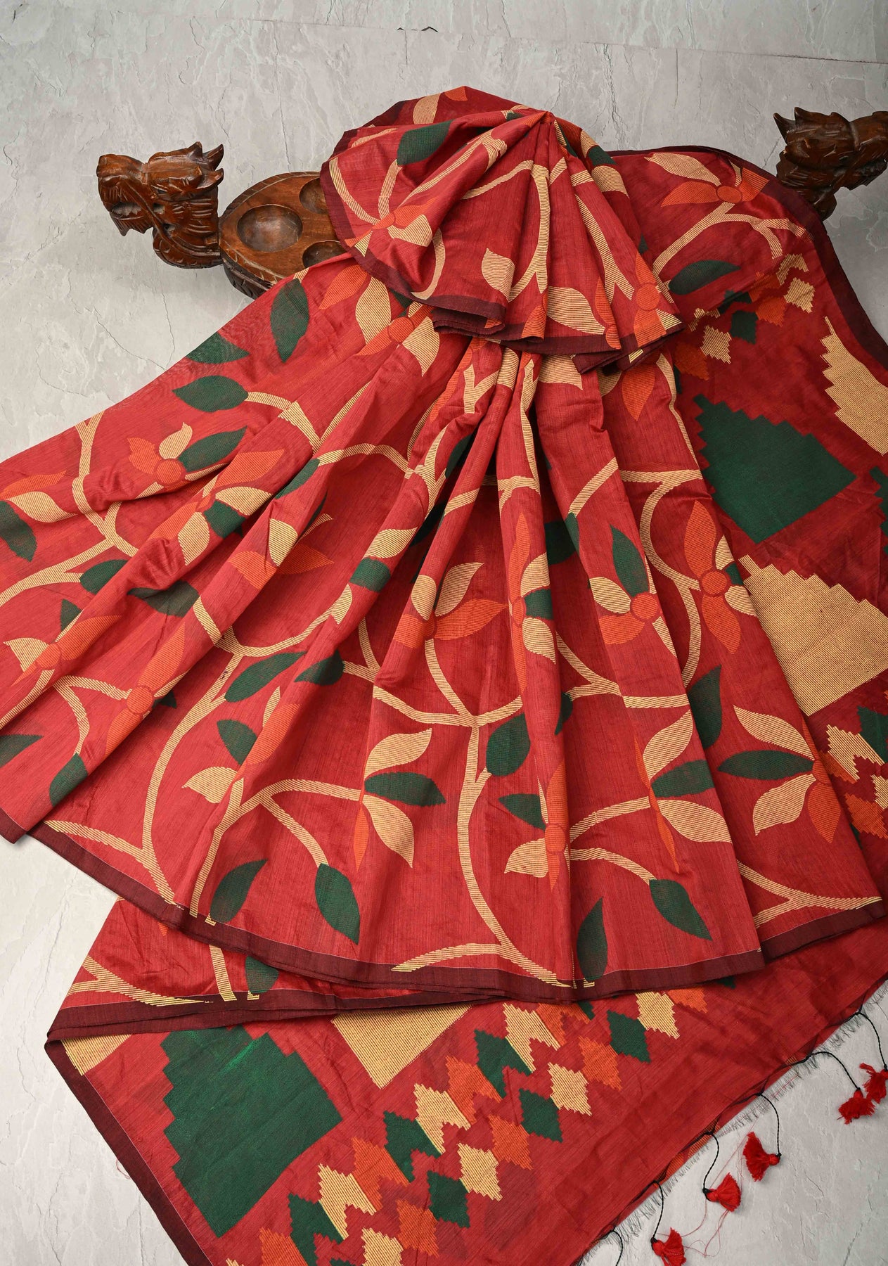 Brick Red Uppada Handloom Silk Saree with Full Body Jamdani Jaal and Border