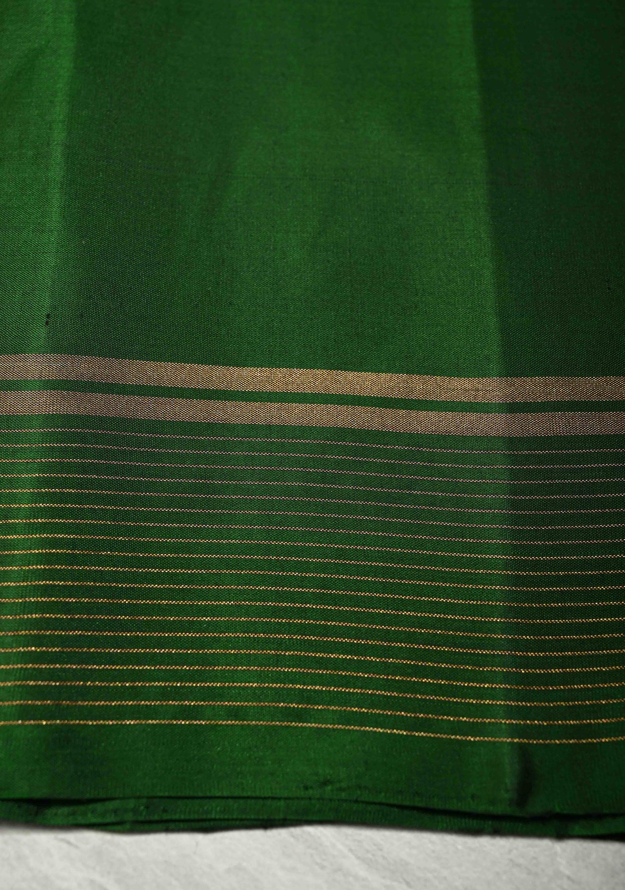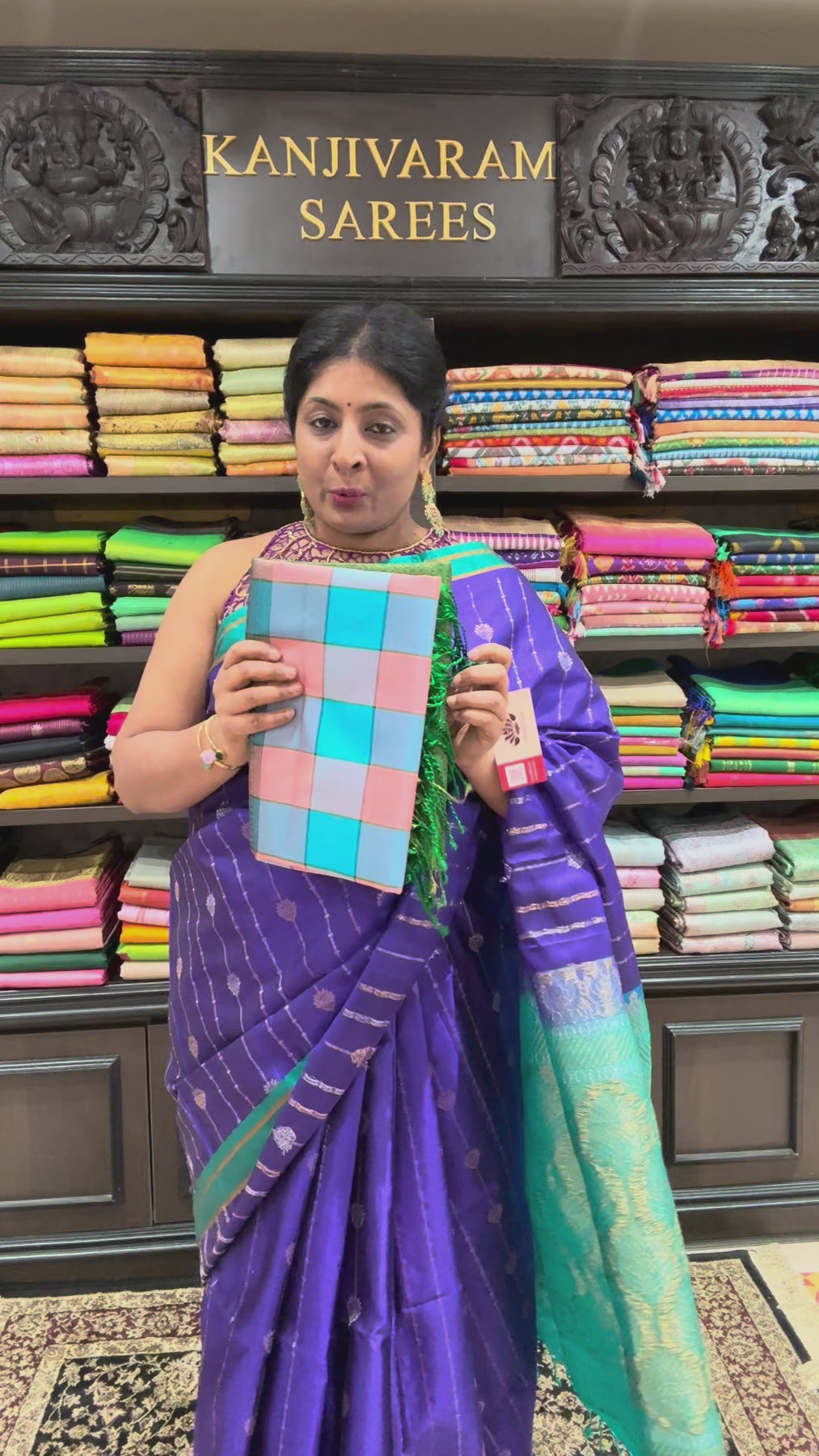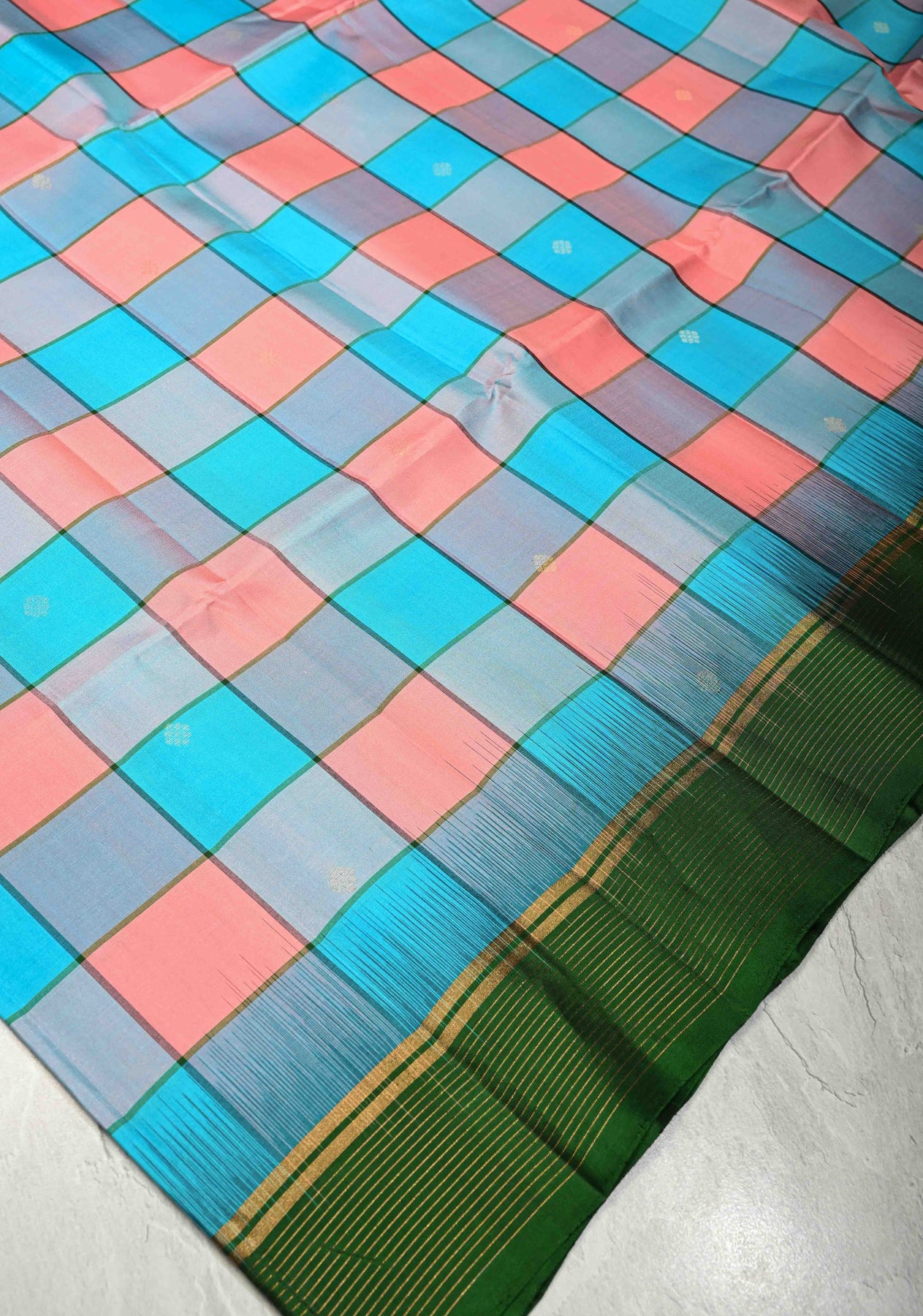 The lively bright peach and blue body is adorned with delicate golden zari buttas, adding a subtle shimmer that enhances its festive appeal. A contrasting green border completes the look with a touch of sophistication, creating a striking yet harmonious color combination. This saree is a perfect choice for those seeking elegance with a playful, vibrant touch.
