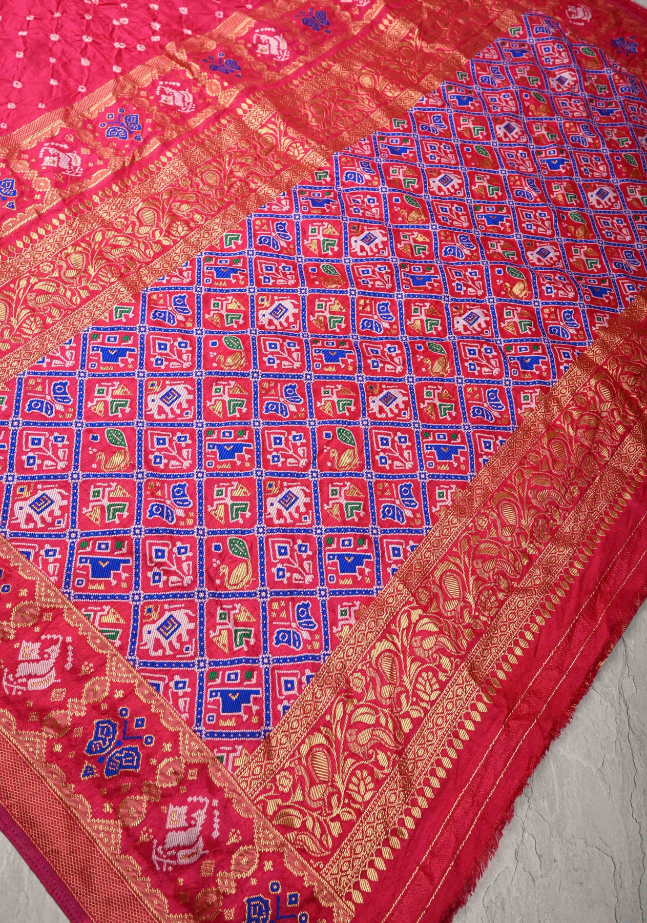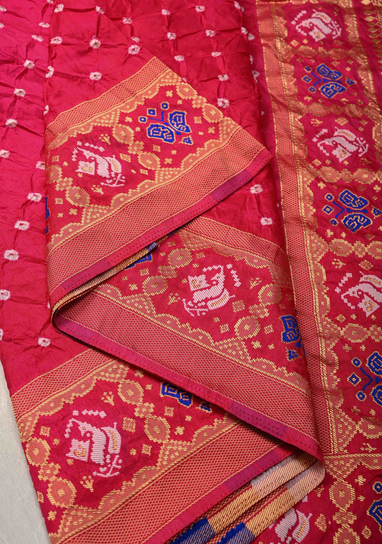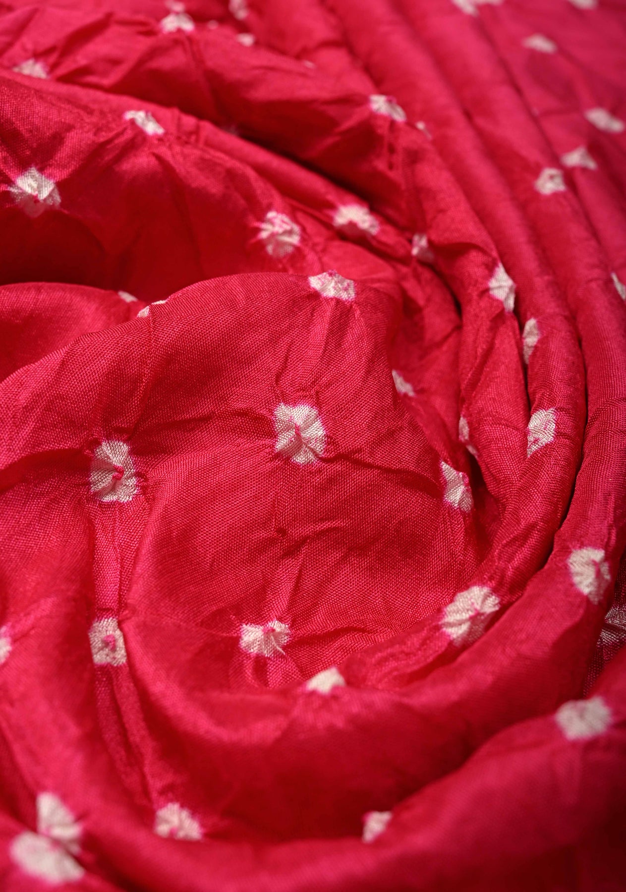 This vibrant Bright Pink Crushed Bandhini on Art Silk Saree is a stunning fusion of traditional craftsmanship and contemporary charm. The saree features the iconic Bandhini tie-dye pattern in a lively crushed pink shade, creating a playful yet elegant texture. Crafted from smooth and comfortable art silk, it boasts a beautifully detailed Meenakari zari border and pallu, adding a rich, ornamental touch with intricate inspired designs. Perfect for festive occasions and celebrations, this saree effortlessly blends bright colors with exquisite artistry for a captivating look.