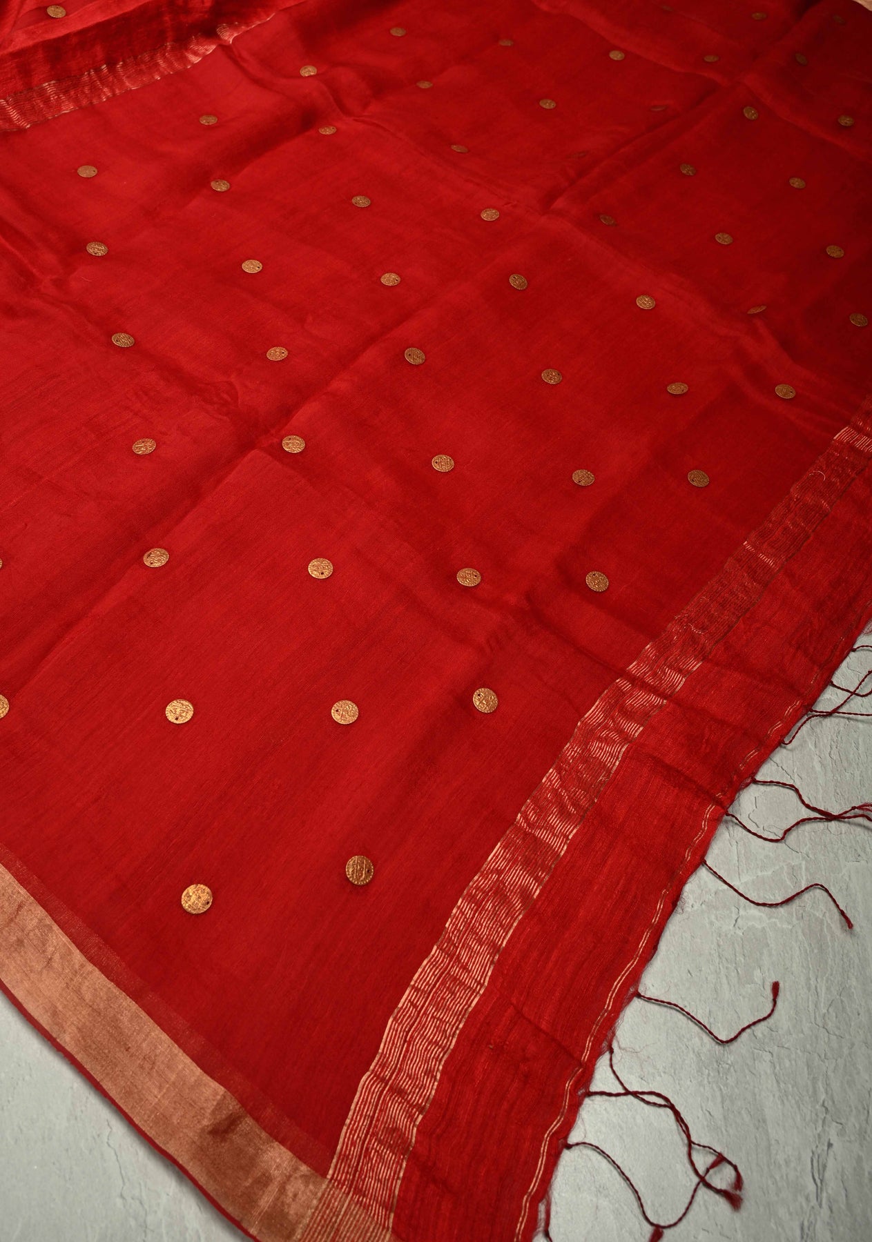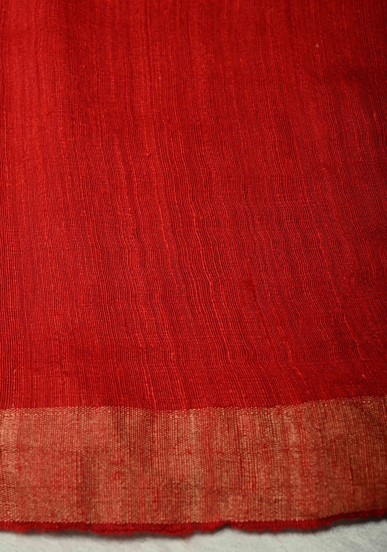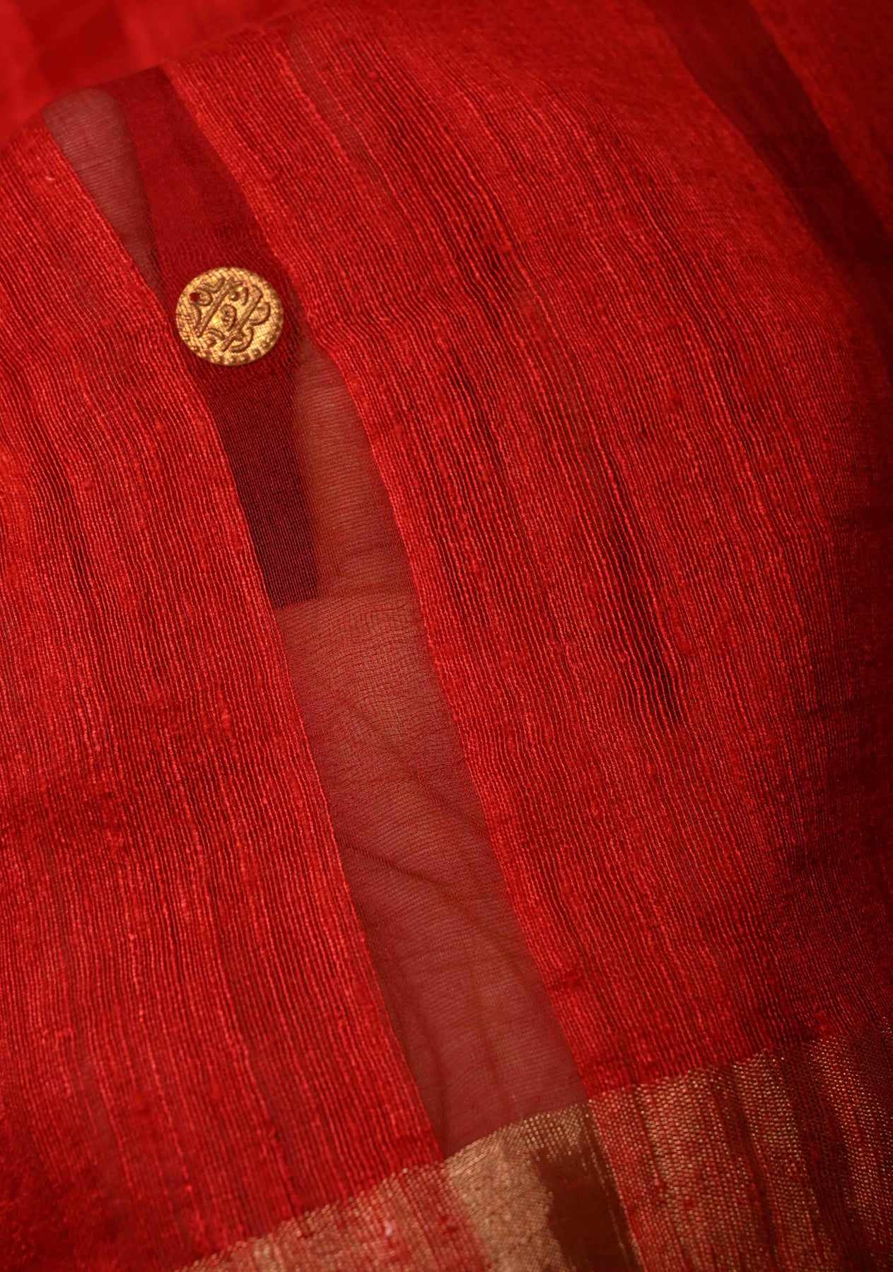 Bright Red Matka Muslin Silk with Coin Interweave on the Muslin Stripes of the Saree and Minimal Zari Border | SILK MARK CERTIFIED