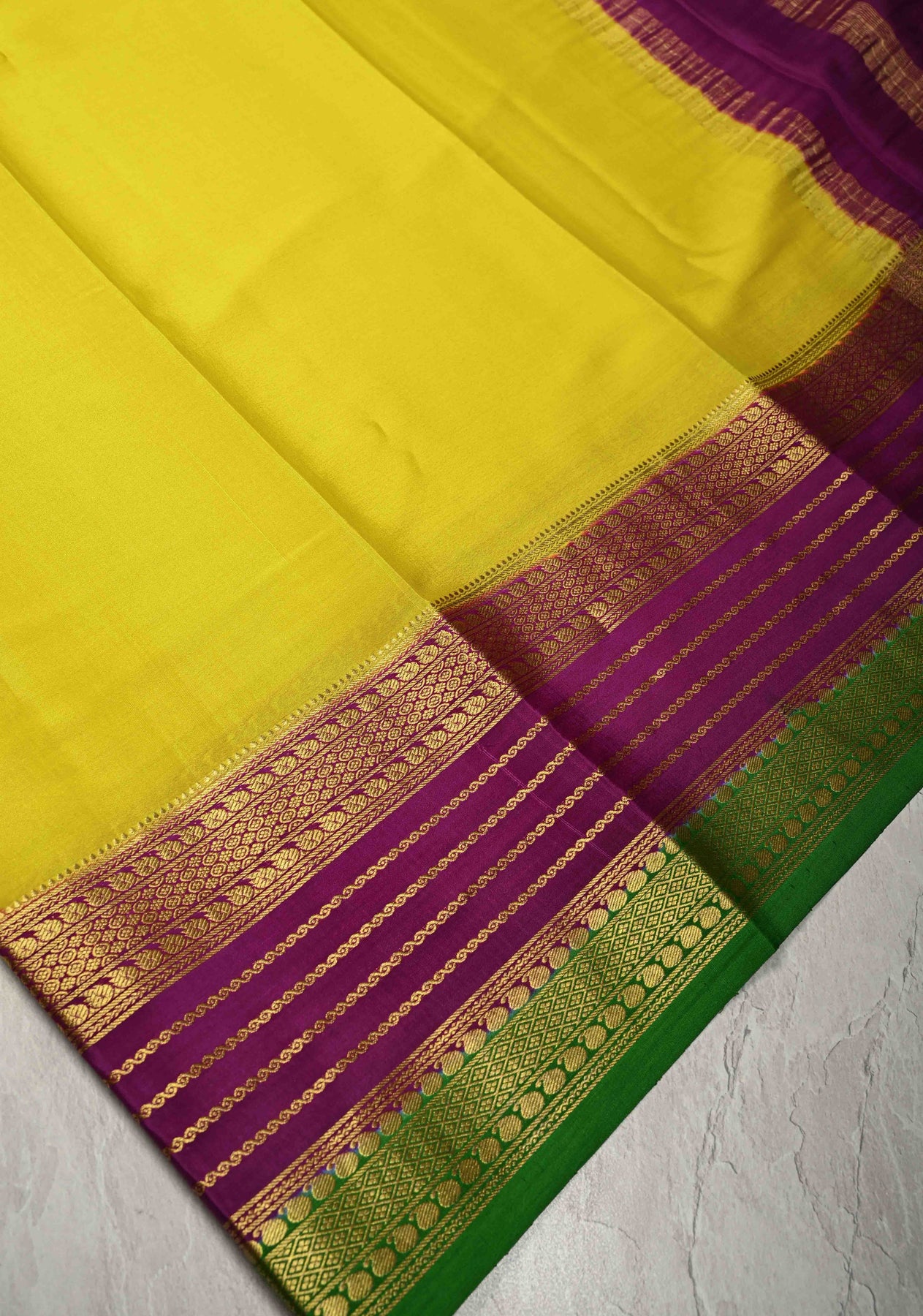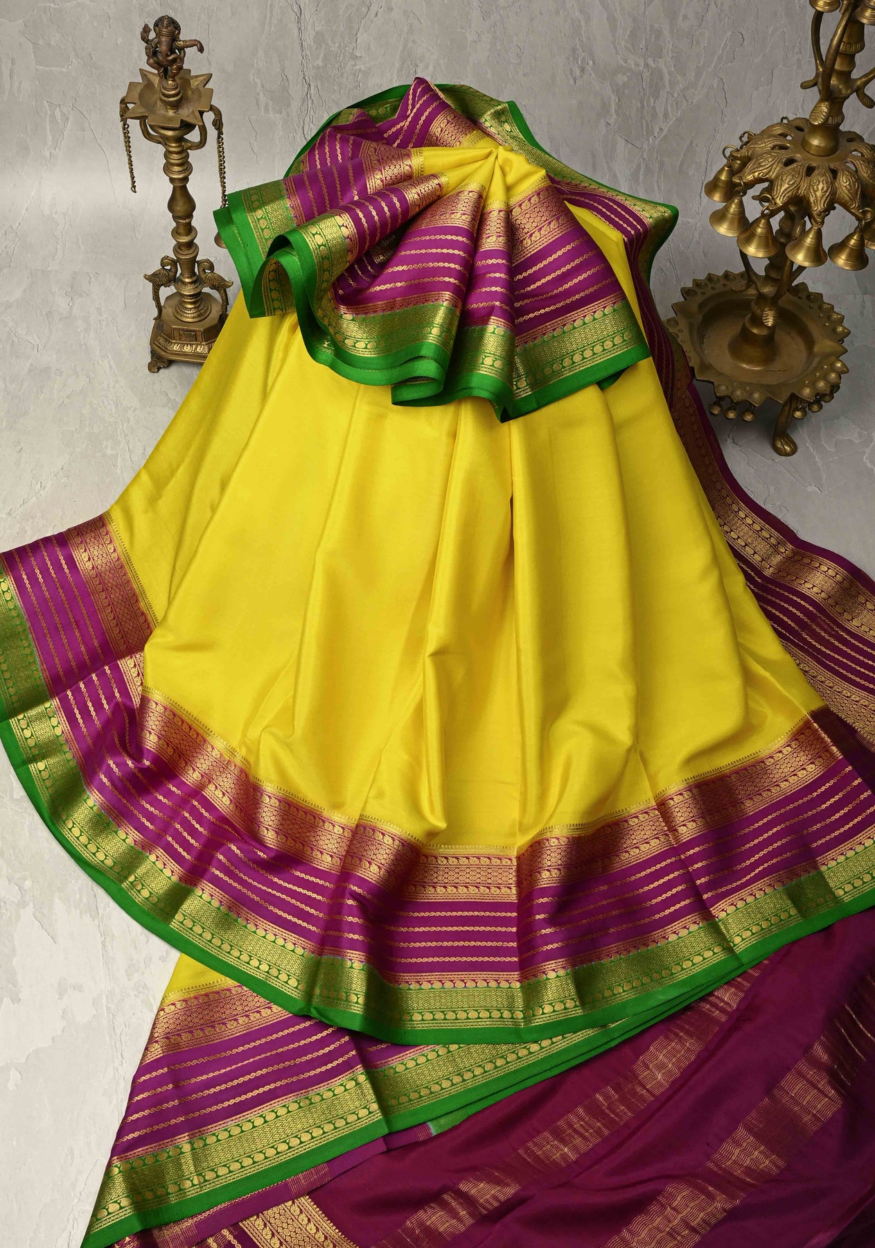 Radiate sunshine and elegance in this Bright Yellow Mysore Silk Saree, crafted from premium KSIC grade silk that guarantees rich texture and lasting quality. The vibrant yellow shade exudes freshness and positivity, perfect for festive occasions and celebrations.