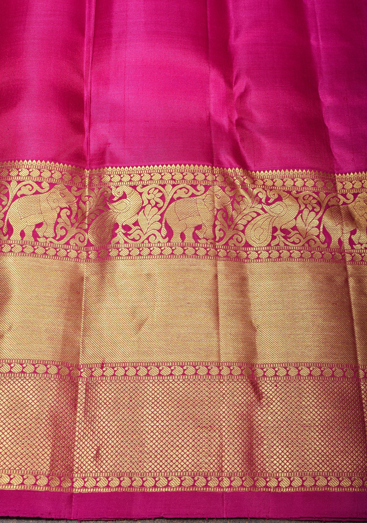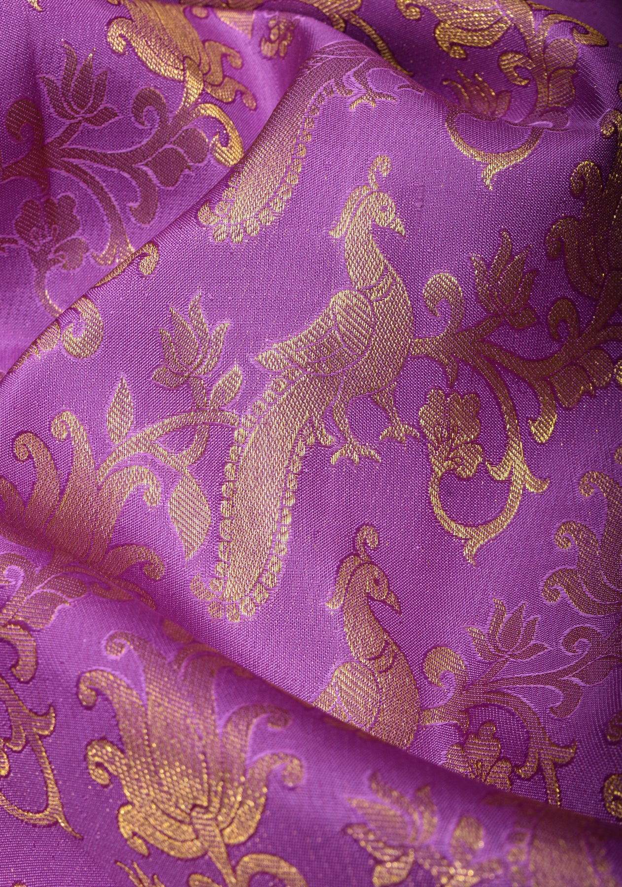A Kanjivaram pure silk saree is a rich representation of our exquisite handloom heritage woven with pure silk and zari! This saree peppered with modern aesthetics comes in a lilac and purple combination that captivates one and all! The body is filled with a unique peacock leheria jaal that radiates beauty!