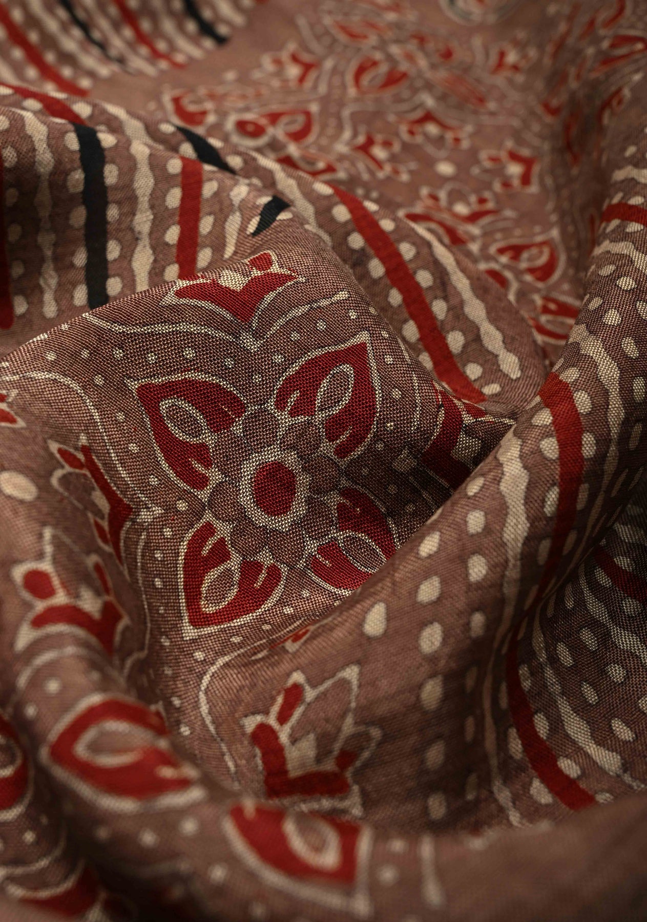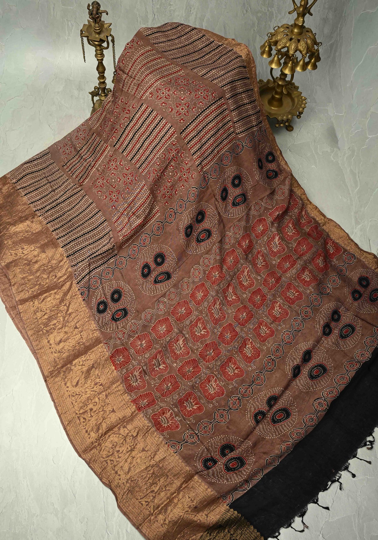 This Brown Modal Silk Fusion Saree is a perfect blend of classic charm and contemporary elegance. Crafted from modal silk, it features delicate hand block prints that add an artistic touch and reflect timeless craftsmanship. The brown hue brings warmth and sophistication, while the zari border enhances the saree with a subtle golden sheen, giving it an opulent finish. Soft, lightweight, and effortlessly draping, this saree is ideal for festive occasions, cultural celebrations, and evening gatherings, offering a graceful fusion of tradition and modern style.