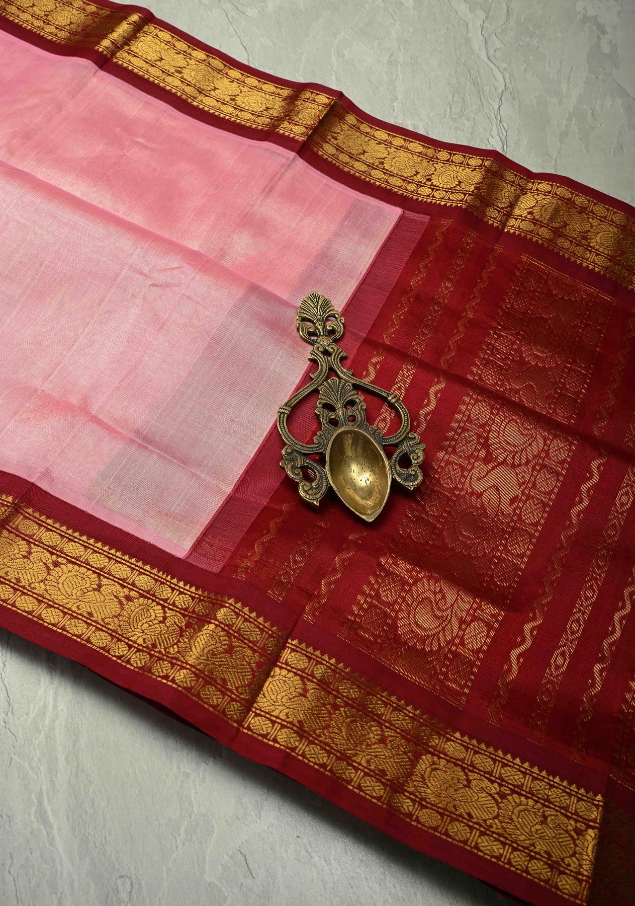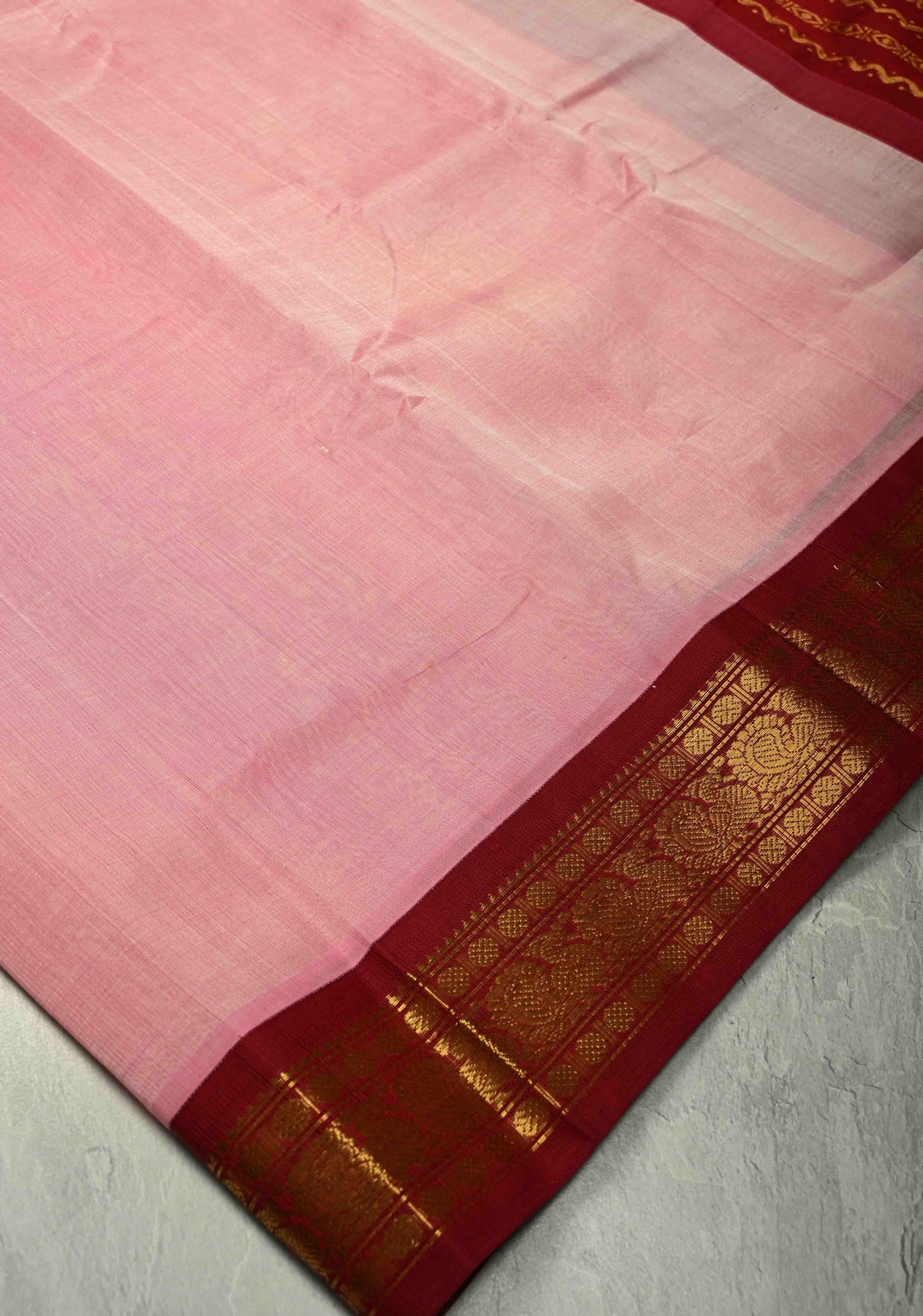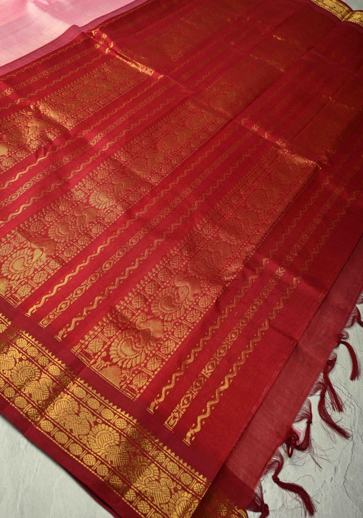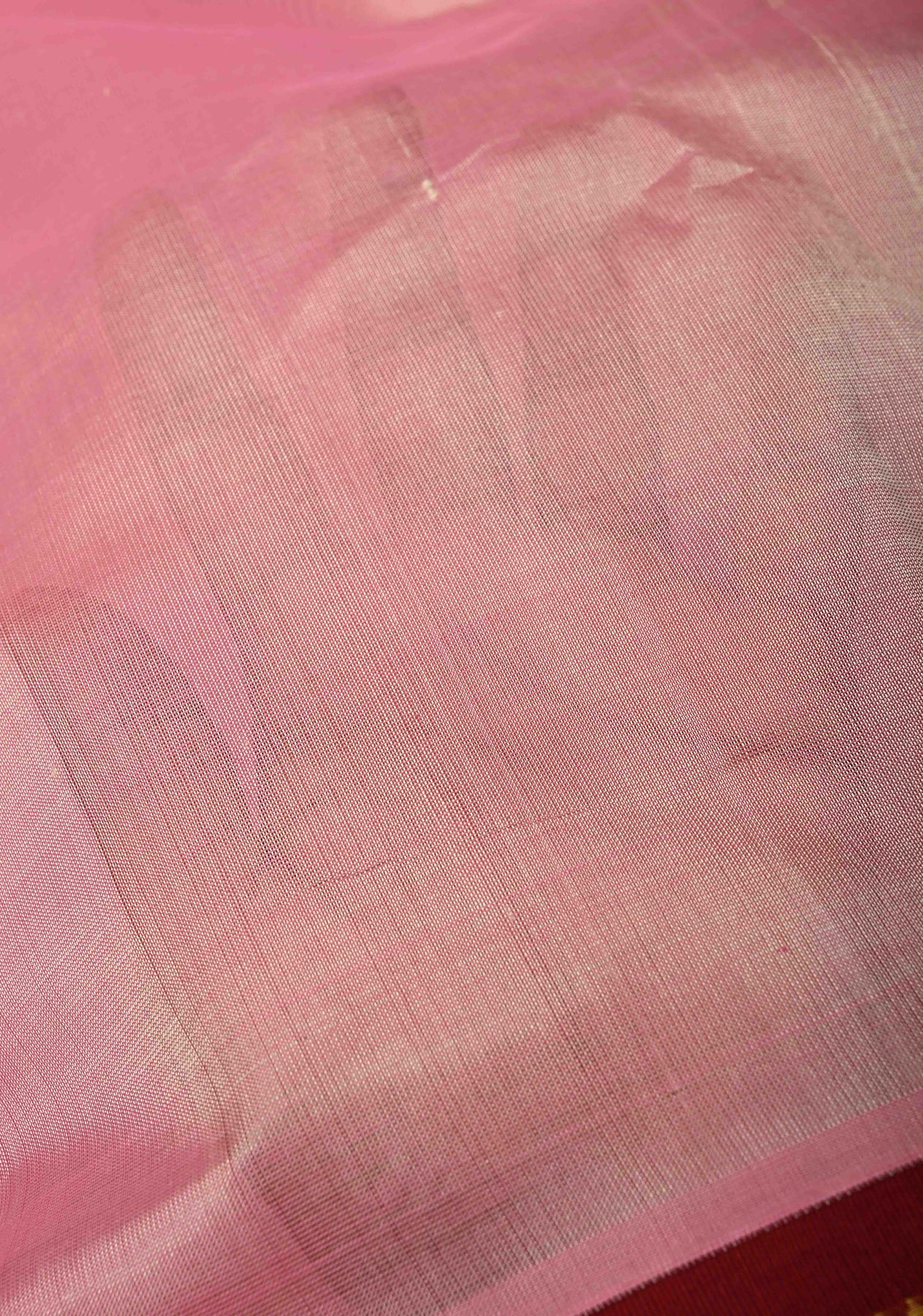 The saree features a striking contrast zari border, adding a regal touch to the delicate pink base. Lightweight yet luxurious, it combines the of Kanchi silk with the practicality of cotton, making it ideal for weddings, festive occasions, formal events, and traditional celebrations. Its handloom craftsmanship ensures each piece is unique, reflecting authentic artistry and timeless appeal.
