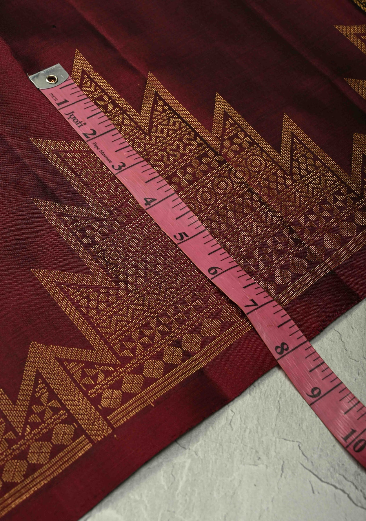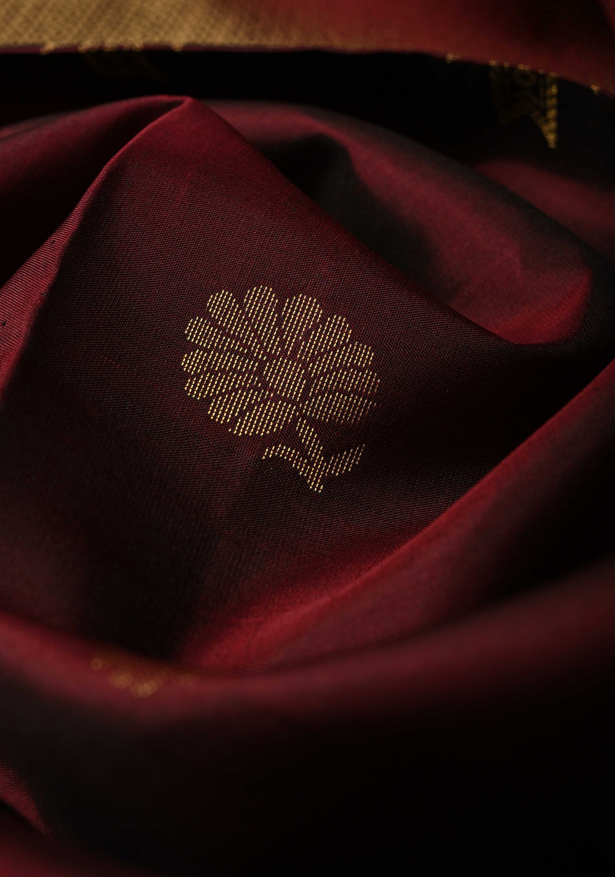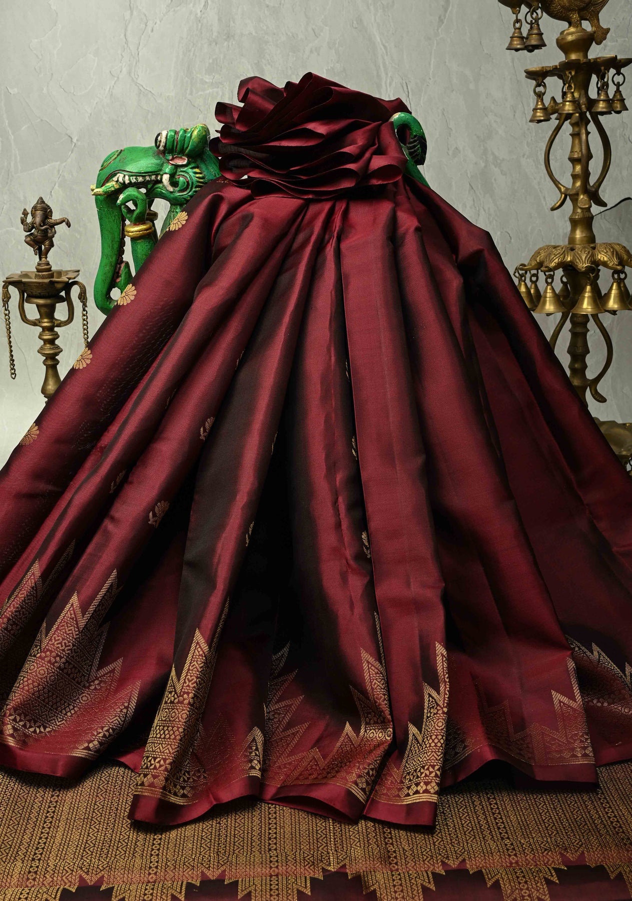 The Deep maroon Kanjivaram Soft Silk Saree is a timeless blend of tradition and elegance, crafted to elevate your festive and special-occasion wardrobe. Woven from soft silk, it drapes gracefully while offering the heritage feel of a classic Kanjivaram. The burgundy hue is beautifully complemented by intricate floral zari buttas scattered across the body, adding a subtle yet captivating shimmer. A finely detailed temple-style zari border enhances its traditional charm, making the saree a perfect choice for weddings, celebrations, and cultural events. Paired with a matching blouse, this saree effortlessly combines sophistication, comfort, and artistry.