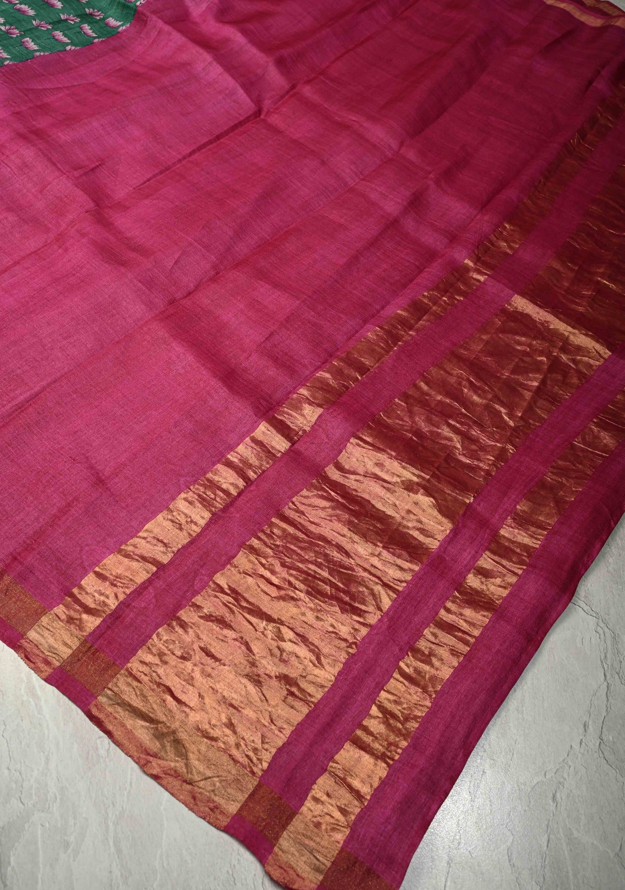 Cactus Green Pure Handloom Tussar Silk saree with Hand Block Print with Contrast Minimal Zari Border | SILK MARK CERTIFIED