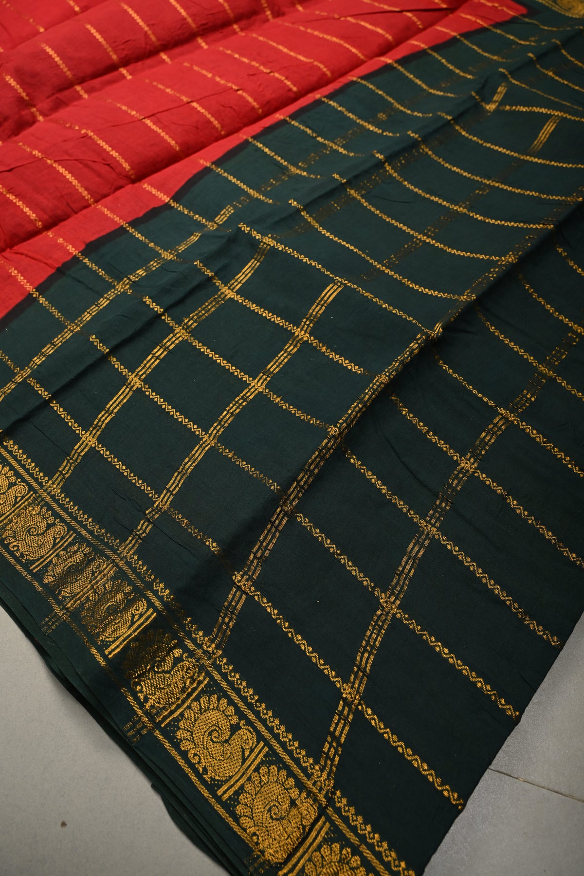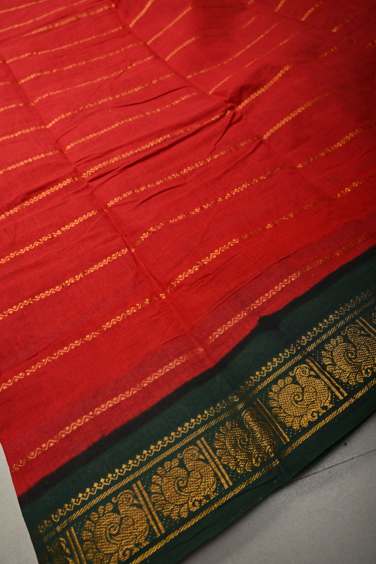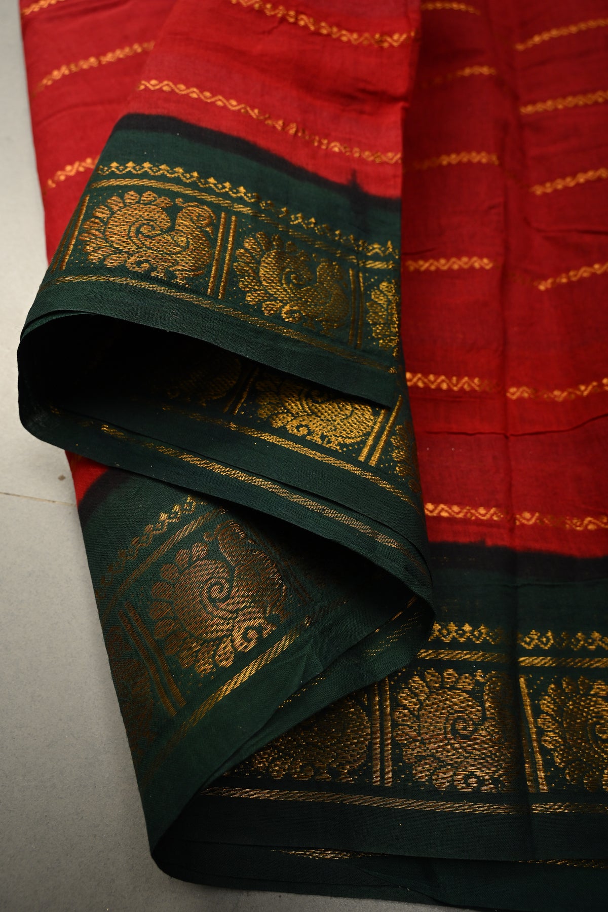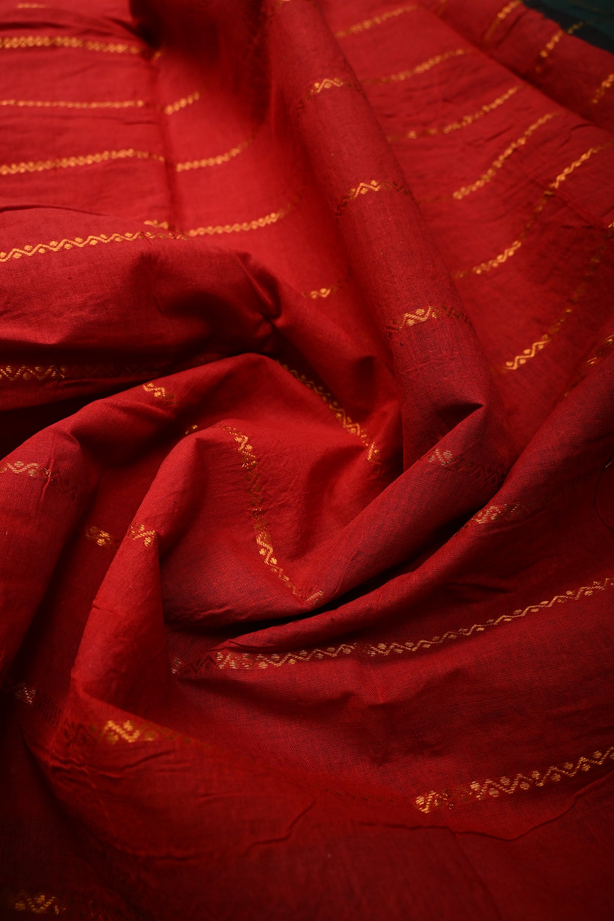The Carmine Red Pure Madurai Cotton Saree is a vibrant celebration of traditional craftsmanship and everyday elegance. Woven from soft, breathable Madurai cotton, it offers comfort and a graceful drape perfect for long wear. The saree features subtle Veldhari zari stripes across its body, adding a refined shimmer, while the contrast zari border enhances the bold carmine red hue with striking definition. Ideal for festive occasions, casual gatherings, or traditional ceremonies, this saree combines rich handloom artistry with contemporary style for a timeless appeal.