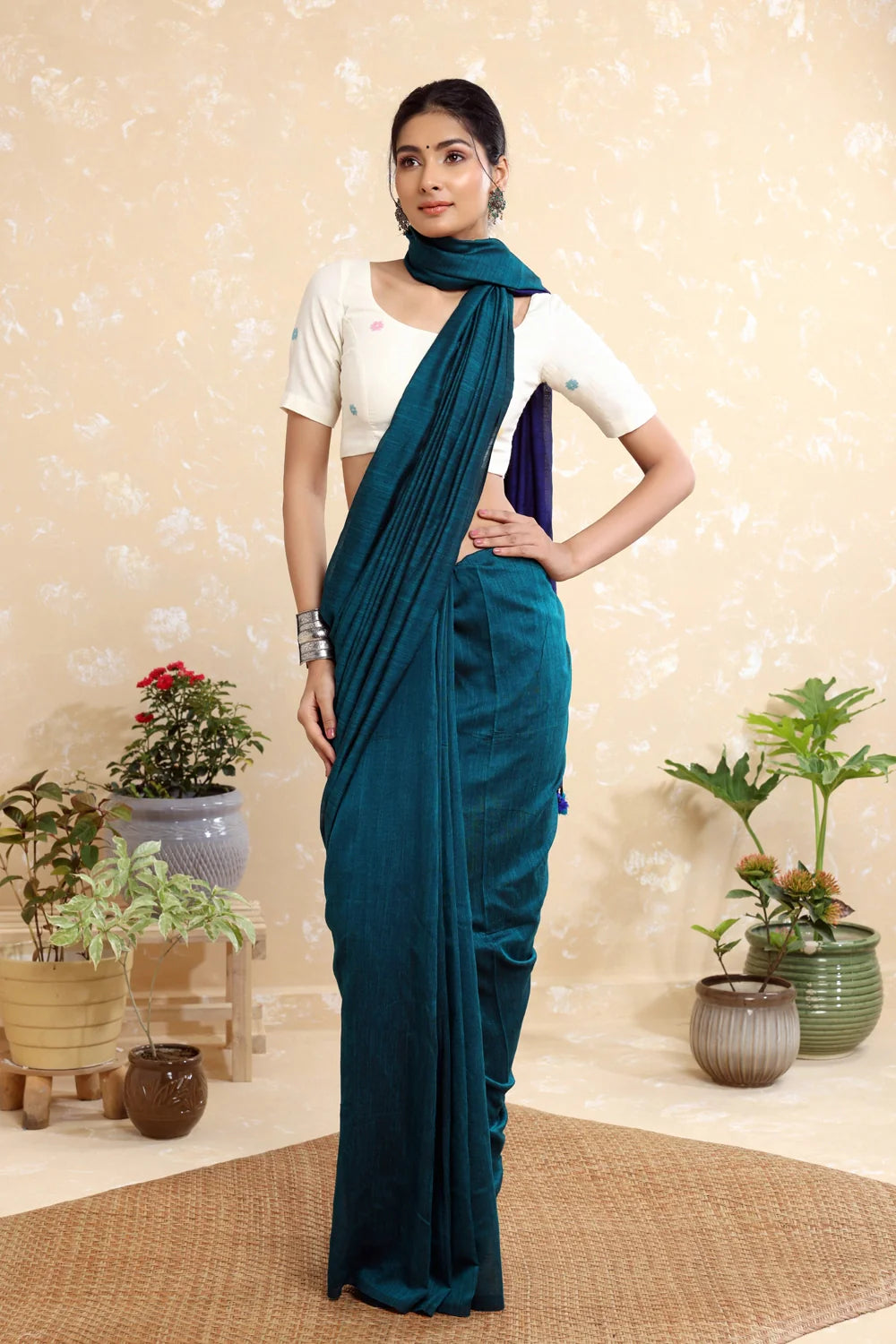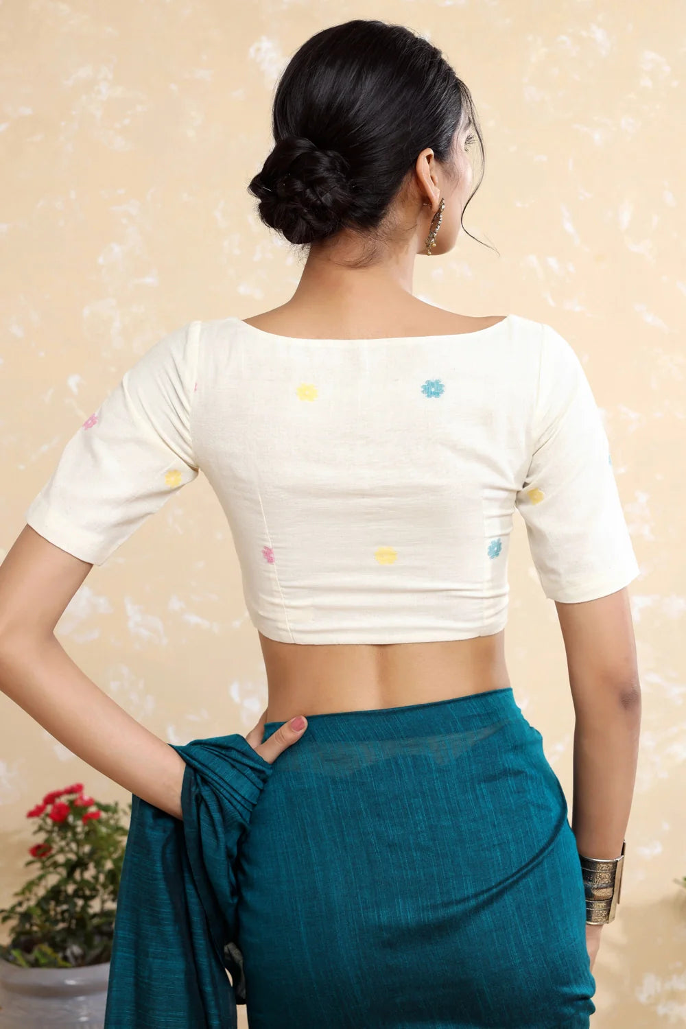 Discover elegance in our Off-white Handloom Cotton Jamdani Blouse, adorned with multi-colored flower woven patterns. This blouse offers a front zip closure, half sleeves, a round neck, and a comfortable lining, combining traditional craftsmanship with contemporary style.