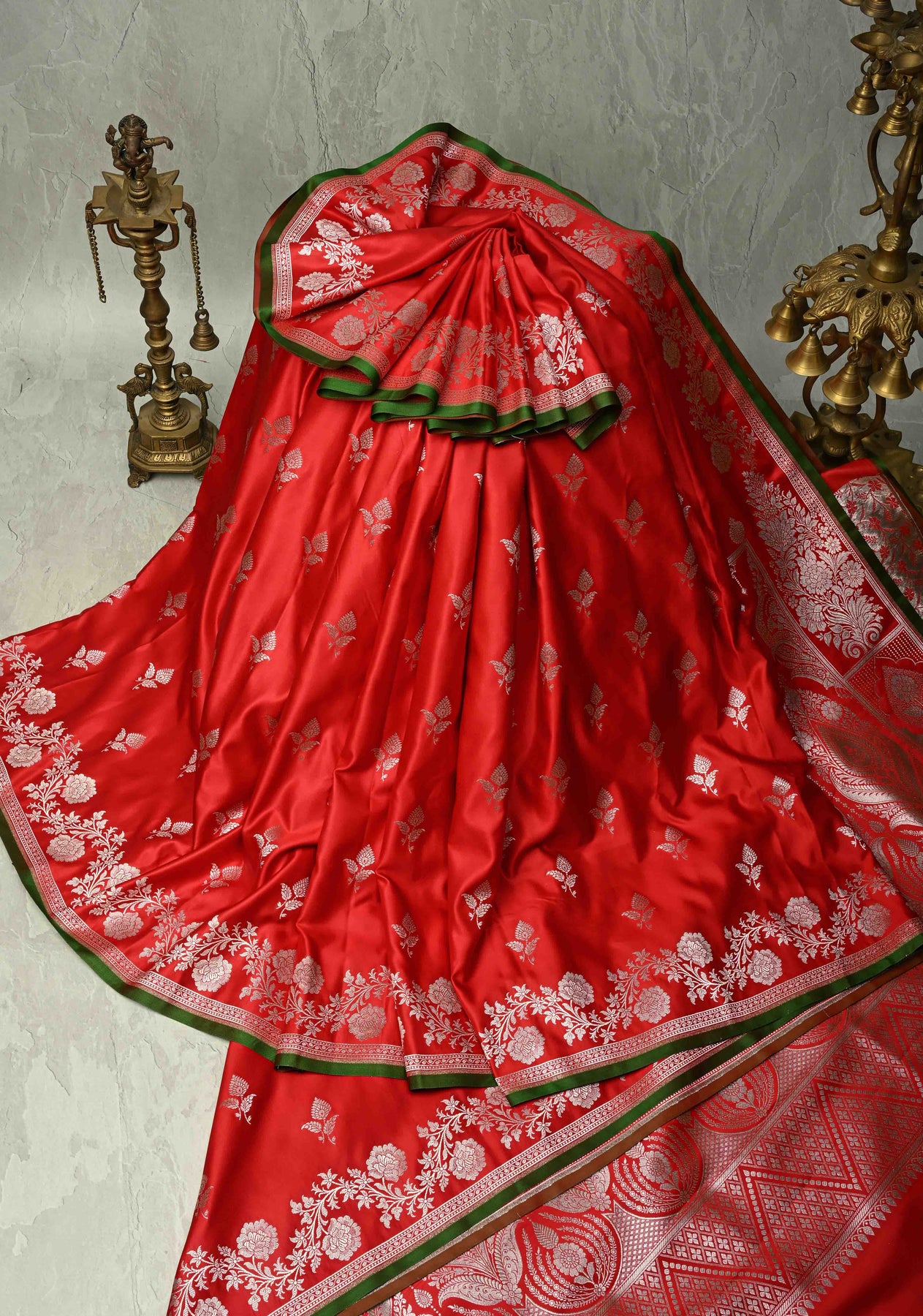 Adorned with delicate floral silver zari buttas, the saree exudes a contemporary sparkle that adds sophistication to its vivid color palette. A graceful silver zari border further elevates the look, merging traditional Banarasi artistry with a modern metallic finish. Lightweight, smooth, and exquisitely elegant, this saree is ideal for receptions, festive celebrations, weddings, and special events.