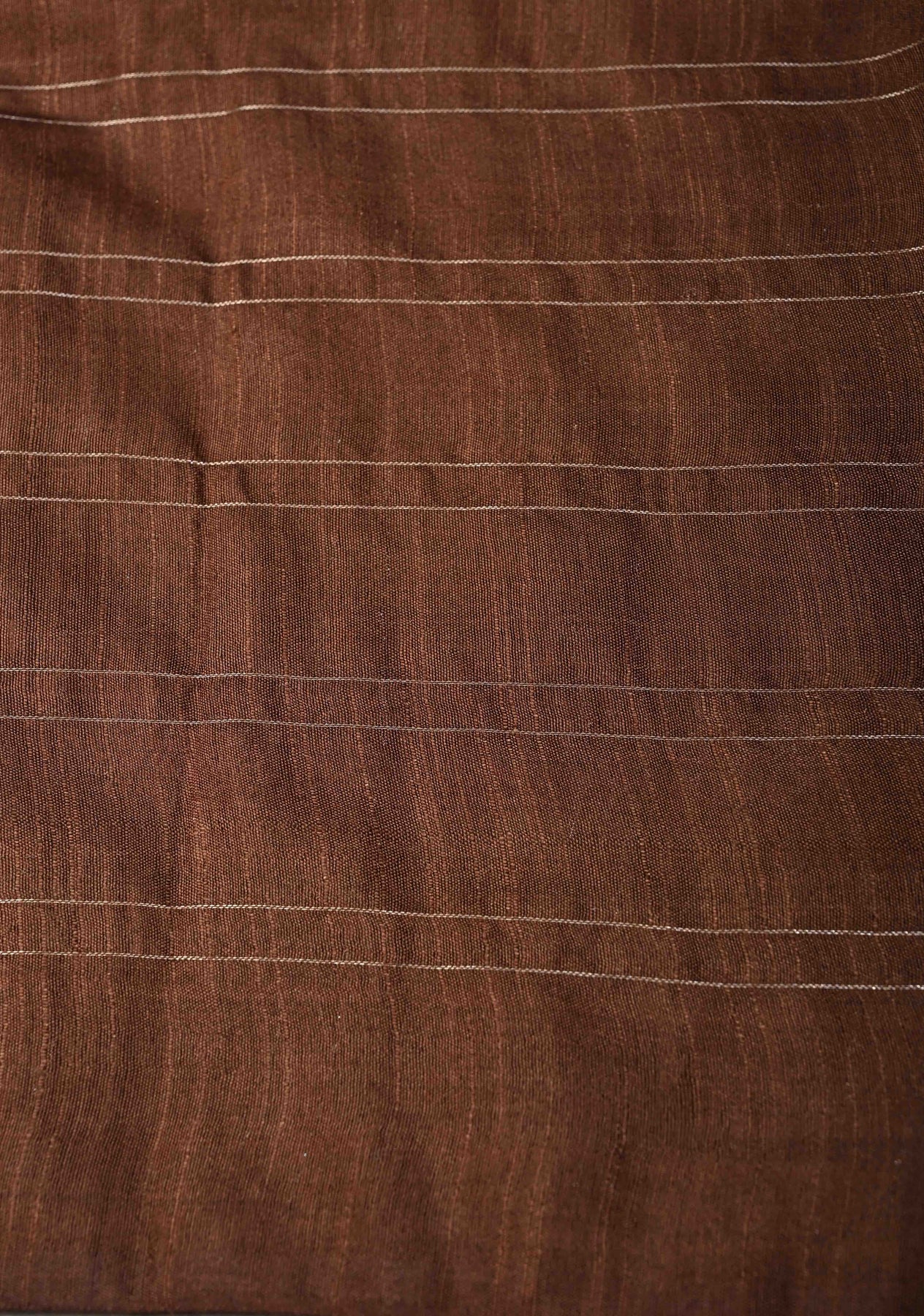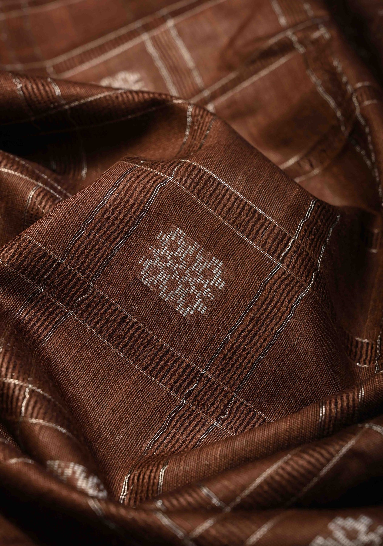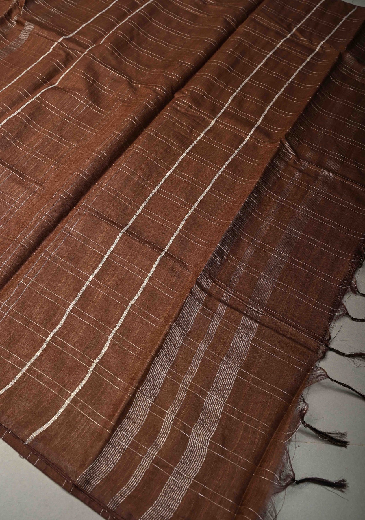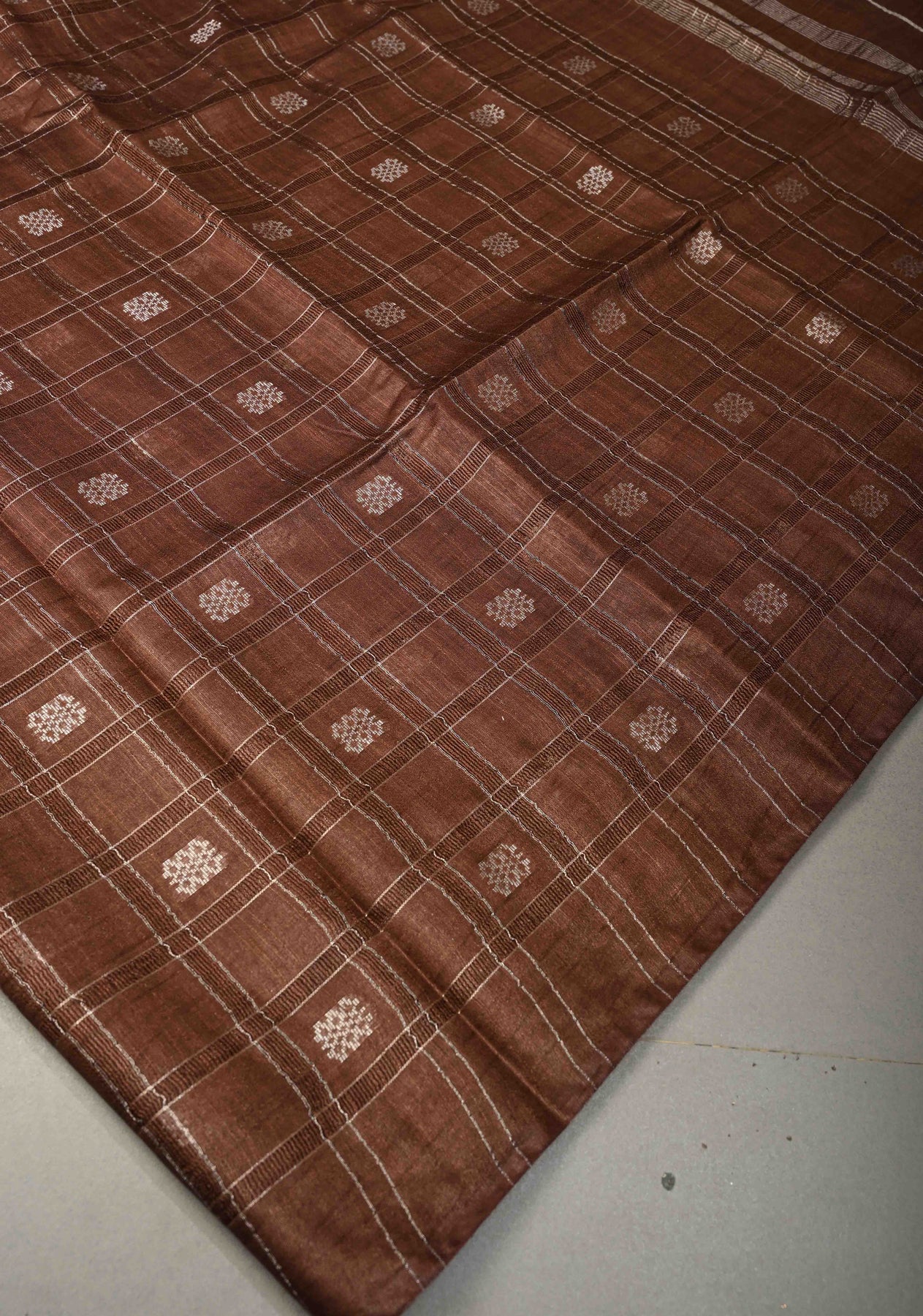 The Coffee Brown Borderless Semi Tussar Saree exudes earthy elegance and understated luxury. Crafted from semi tussar fabric, the coffee brown tone offers a rich and sophisticated appeal. The saree is delicately embellished with shimmering zari buttas, while the zari checks add a subtle geometric pattern that enhances its contemporary charm. Finished with a borderless design, it delivers a clean, seamless drape that beautifully highlights the texture and intricate weave, making it an ideal choice for festive occasions, cultural gatherings, and elegant day or evening wear.