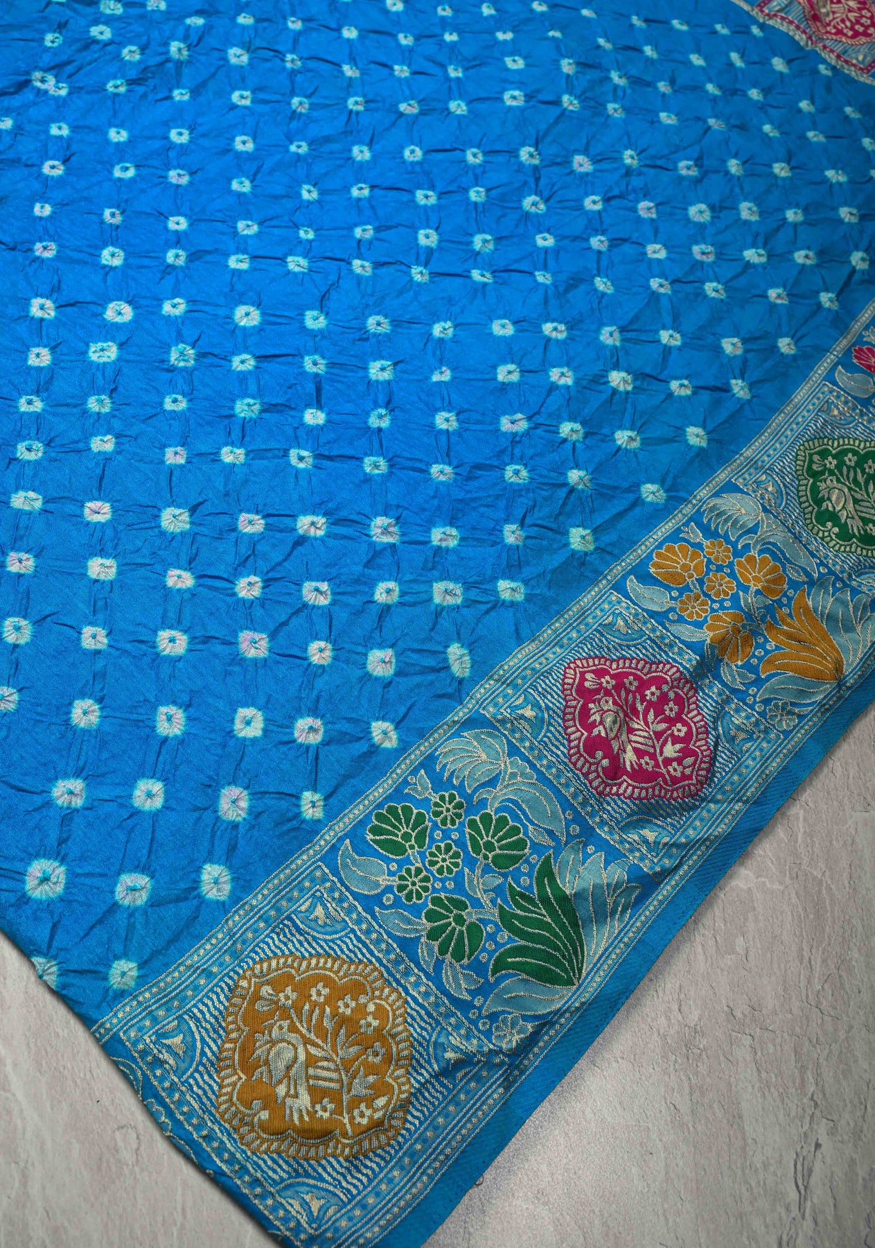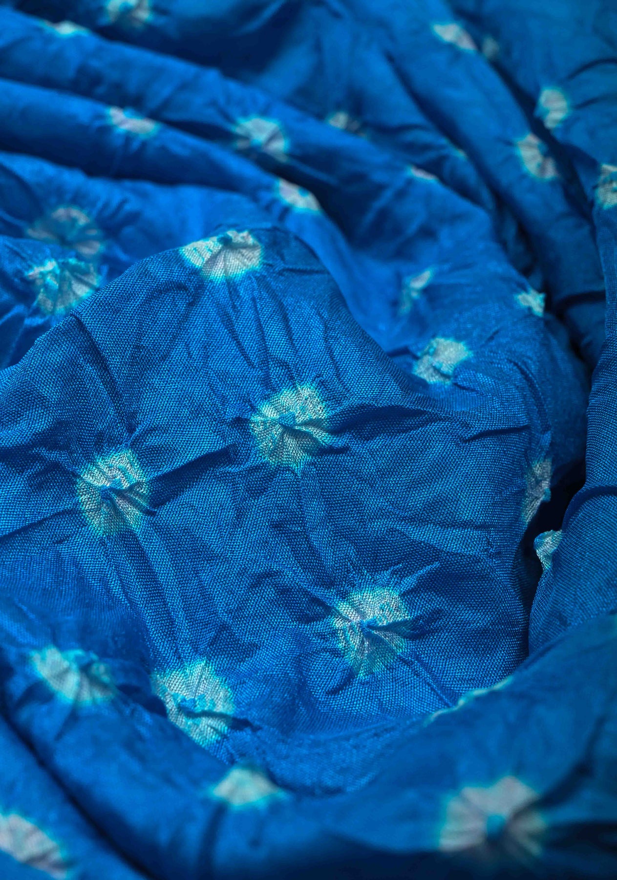 Immerse yourself in vibrant tradition with this stunning Copper Sulphate Blue Crushed Bandhani on Art Silk Saree. The luminous art silk fabric showcases a mesmerizing Bandhani tie-dye pattern, handcrafted with precision and enhanced by a beautiful crushed texture that adds depth and fluidity to the drape.