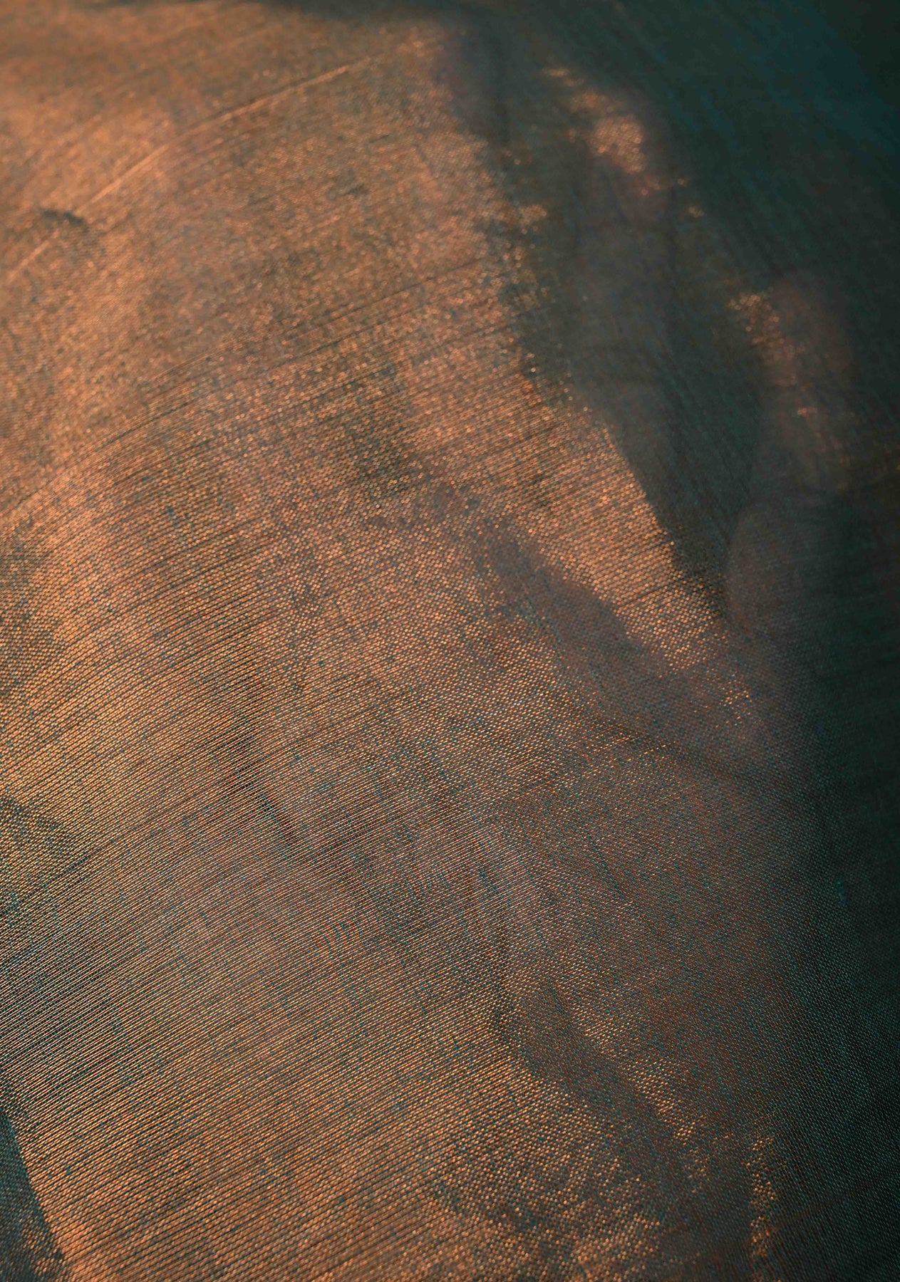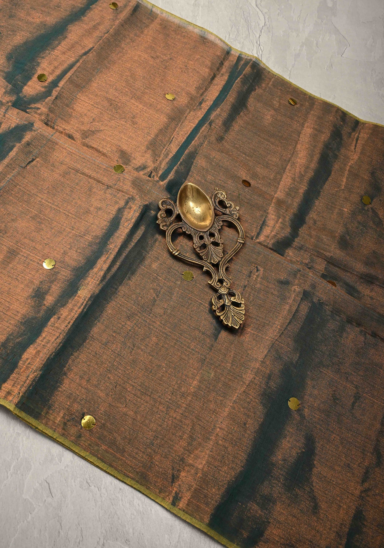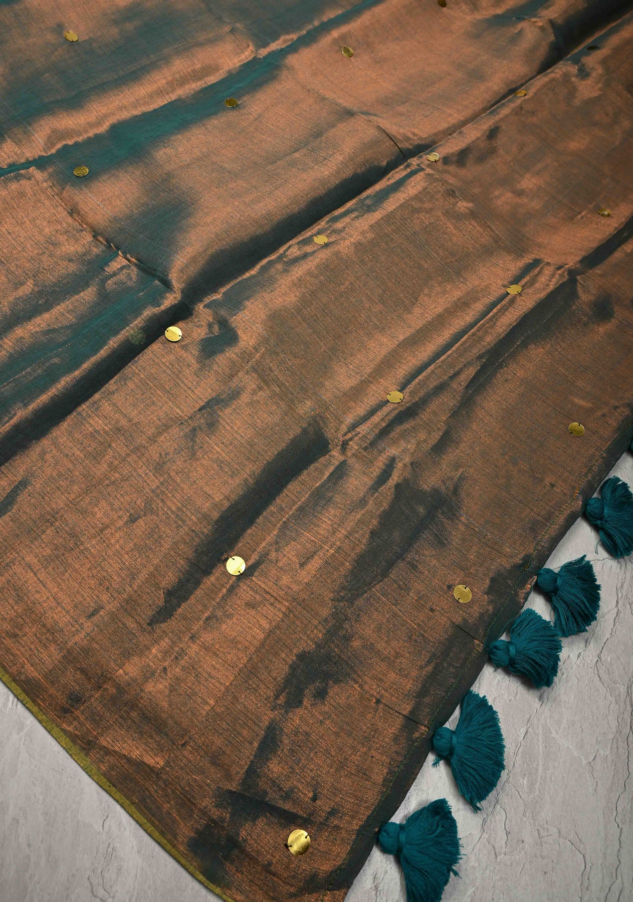Copper-Teal Tissue by Tissue Saree with Tikki Work and Tassels , No Blouse Peice
