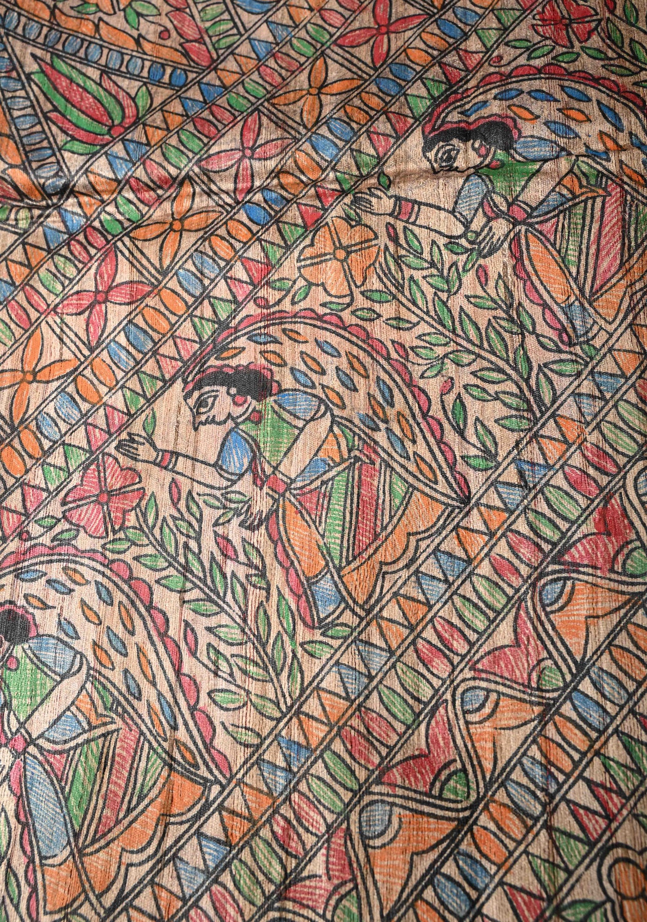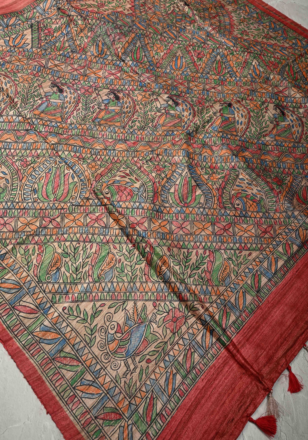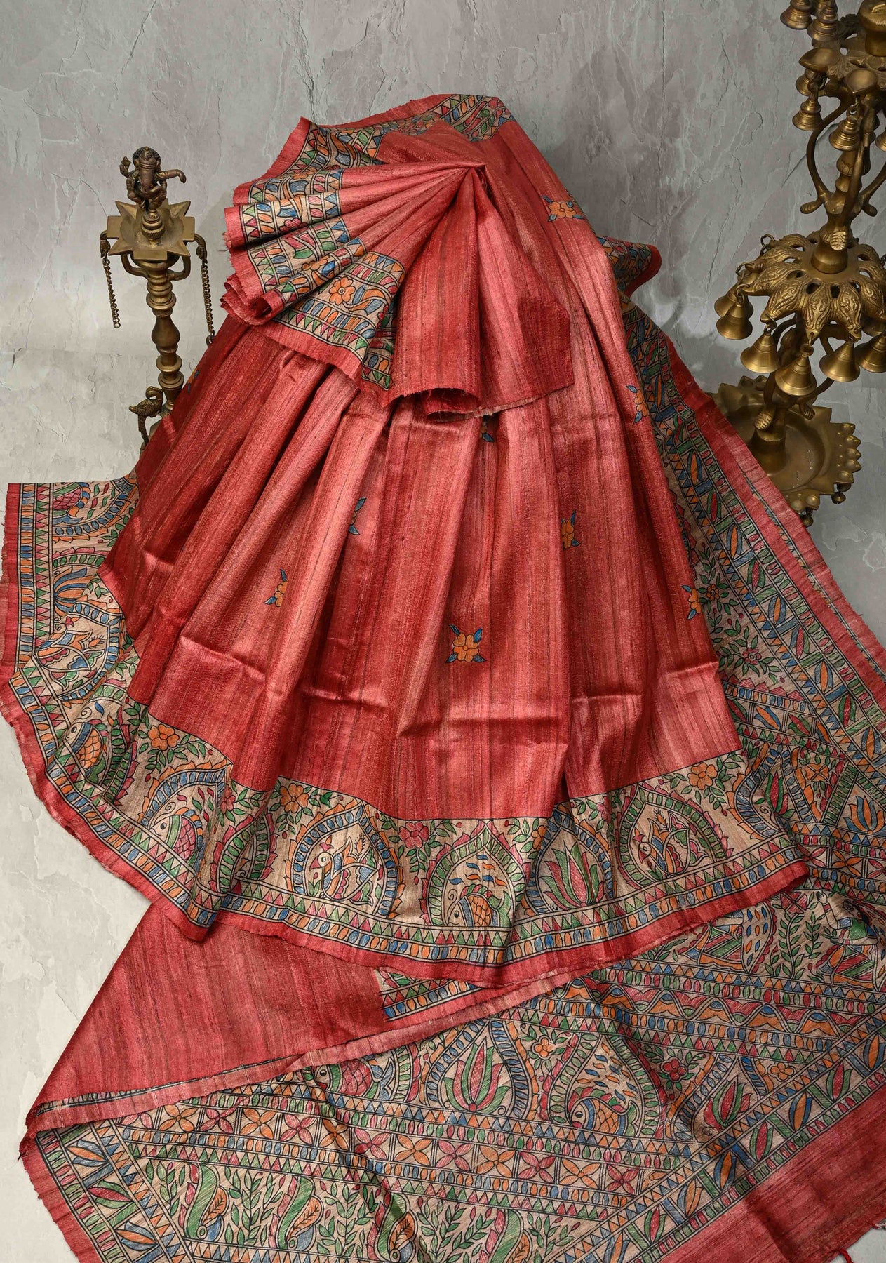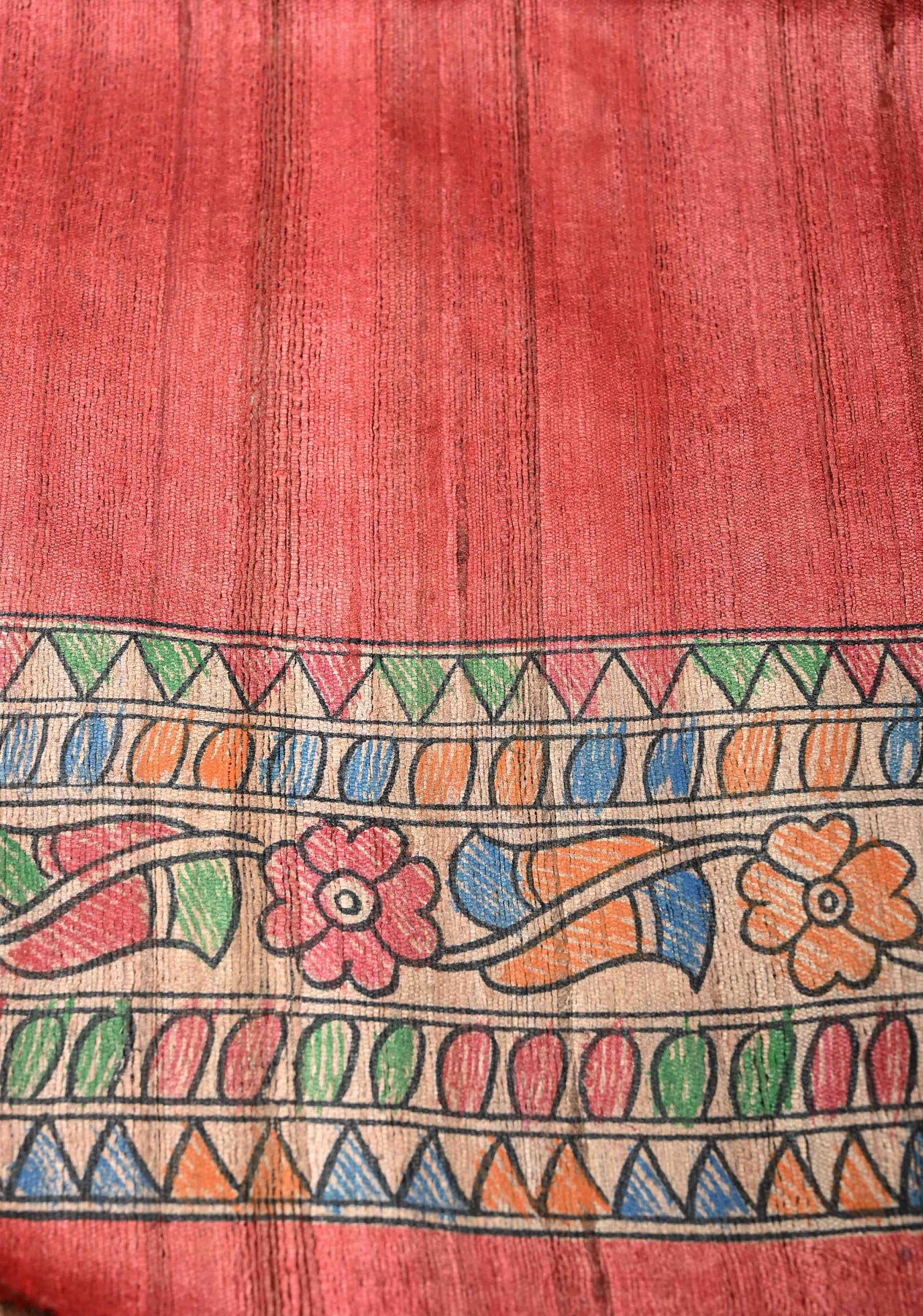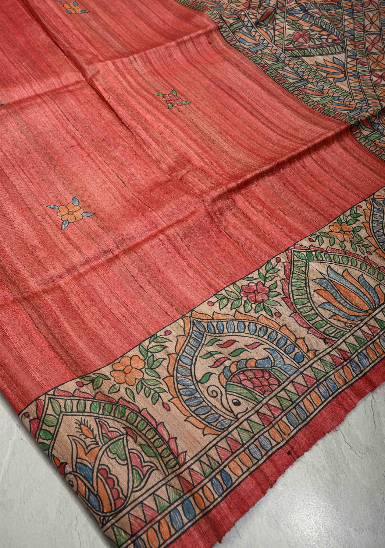 Vibrant and artistic, this Coral Red Mithila Pakshi Ghicha Silk Saree is adorned with authentic hand-painted Madhubani motifs inspired by the Pakshi (bird) theme of Mithila. Crafted from premium Ghicha silk, the saree features a natural texture, subtle sheen, and elegant drape. The coral red base beautifully showcases the intricate Madhubani hand painting, celebrating India’s rich folk art and the symbolism of birds as messengers of joy and harmony. Perfect for festive occasions, cultural gatherings, or art-inspired ensembles, this saree is a timeless blend of tradition and sophistication.