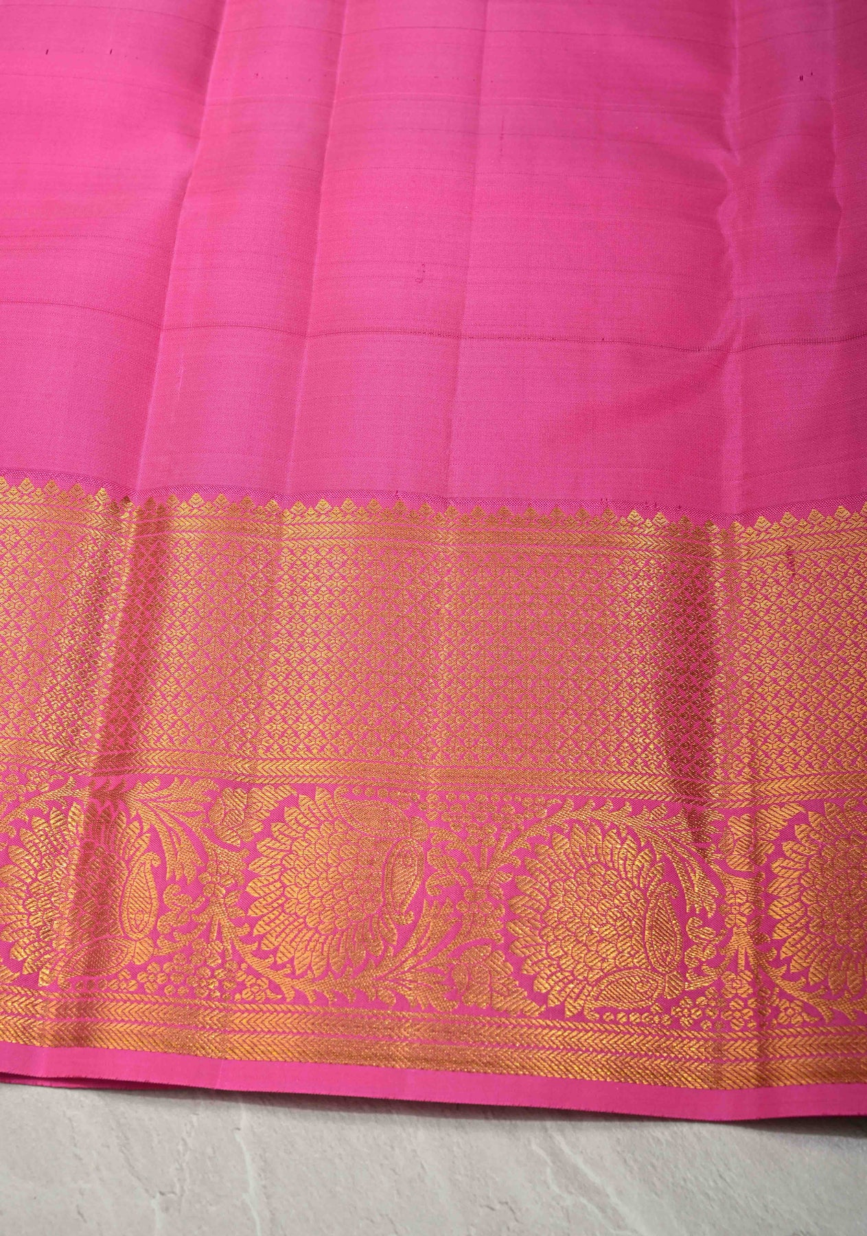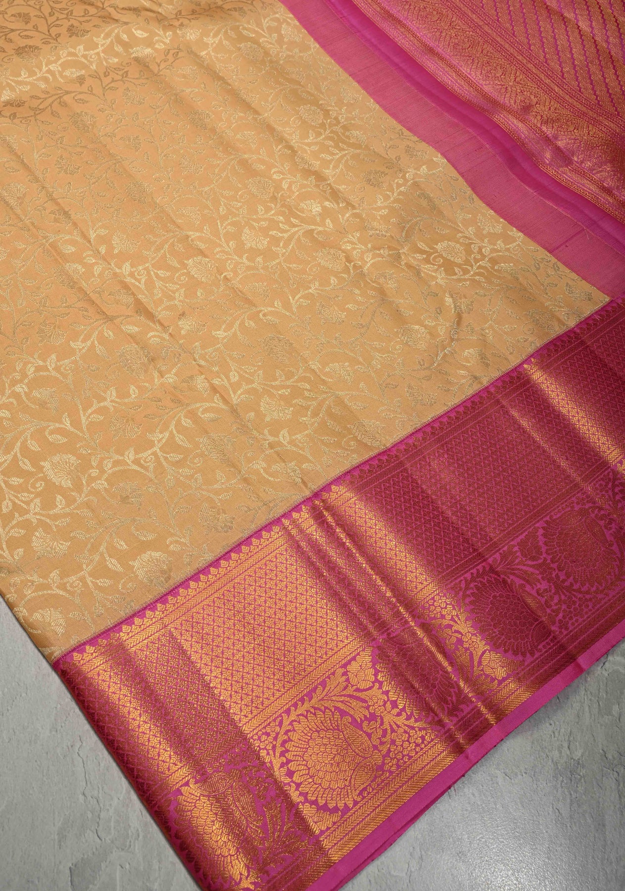Exude timeless grace in this Cream Kanjivaram Pure Silk Saree. The lustrous cream body is elegantly adorned with an all-over silver Zari floral jaal brocade, creating a sophisticated shimmering effect. A striking contrast Rani Pink wide border adds a regal touch, meticulously woven with traditional gold Zari motifs. Finished with an opulent magenta pallu featuring heavy Zari work, this heritage masterpiece is perfect for weddings and grand festivities.