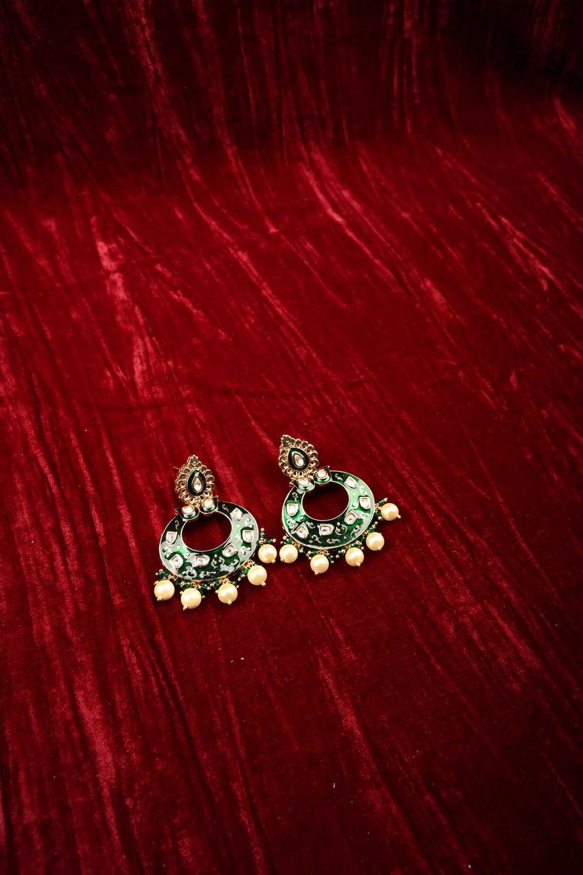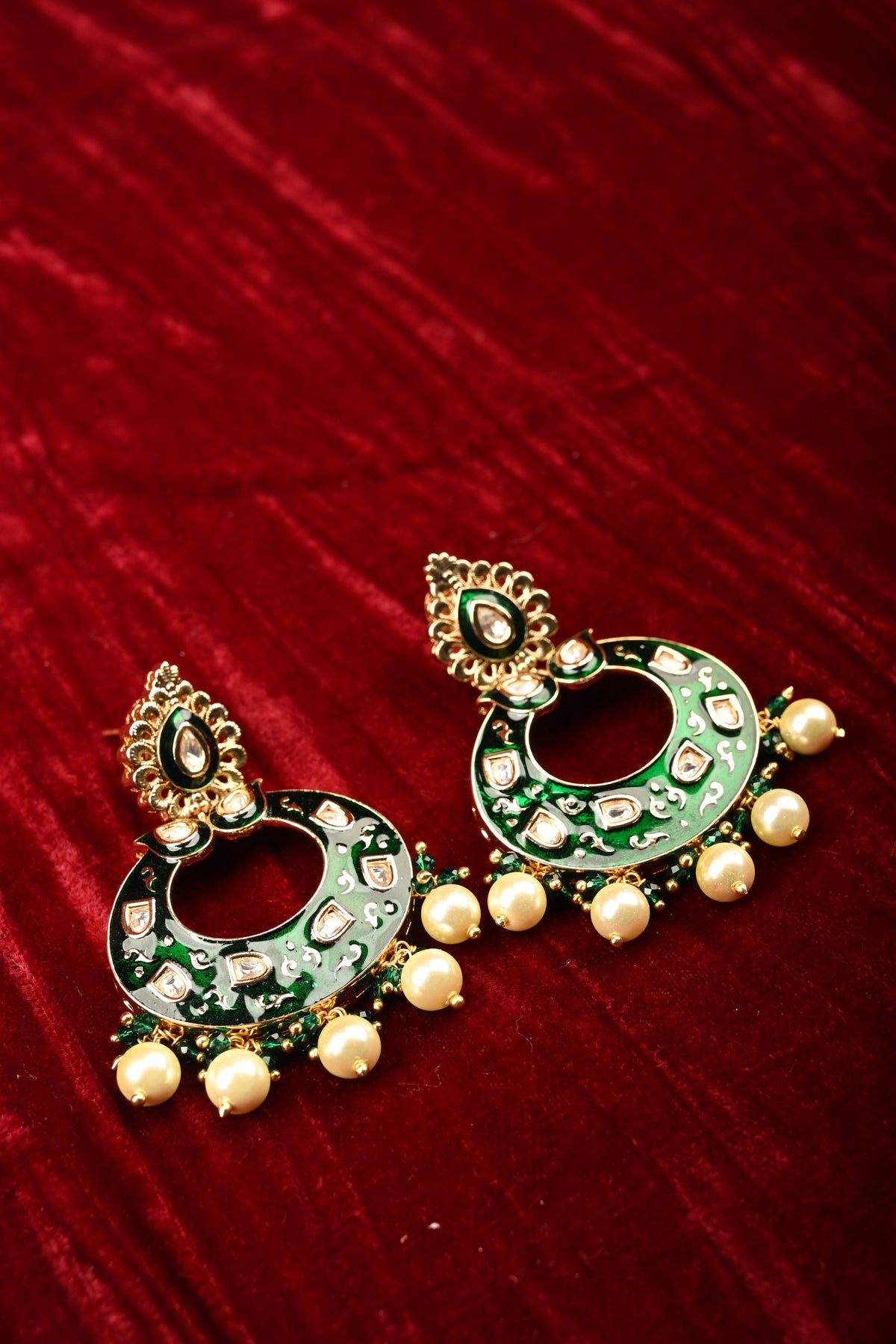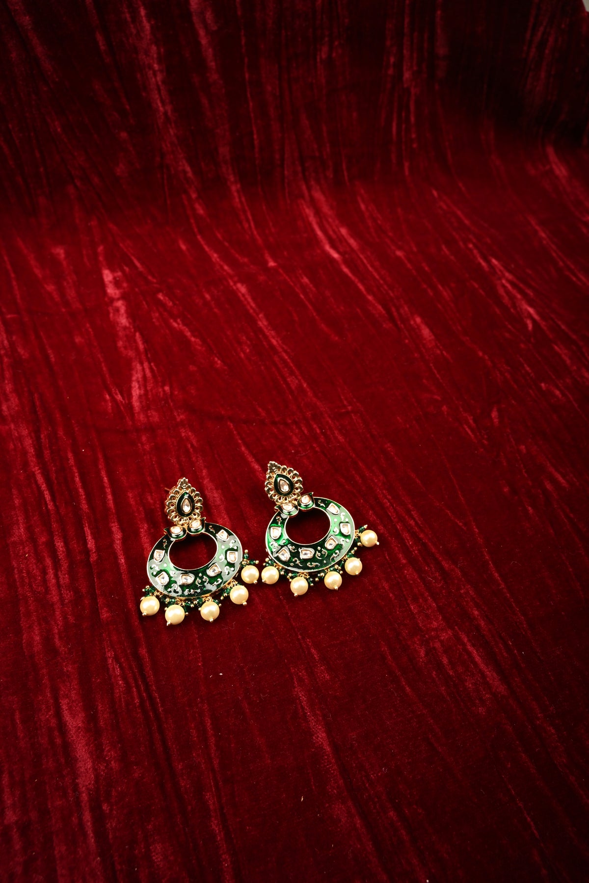 Enhance your festive and bridal look with these Crescent Kundan and Green Meenakari Hoop Earrings, exquisitely handcrafted to reflect traditional elegance. Featuring a graceful crescent-shaped hoop adorned with sparkling Kundan stones and intricate green meenakari detailing, these earrings are finished with delicate pearl drops that add movement and sophistication. Perfect for weddings, cultural celebrations, and special occasions, they pair beautifully with sarees, lehengas, and ethnic ensembles, making them a timeless statement piece for your jewelry collection.