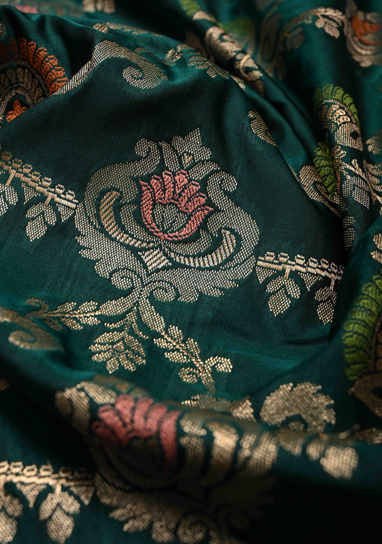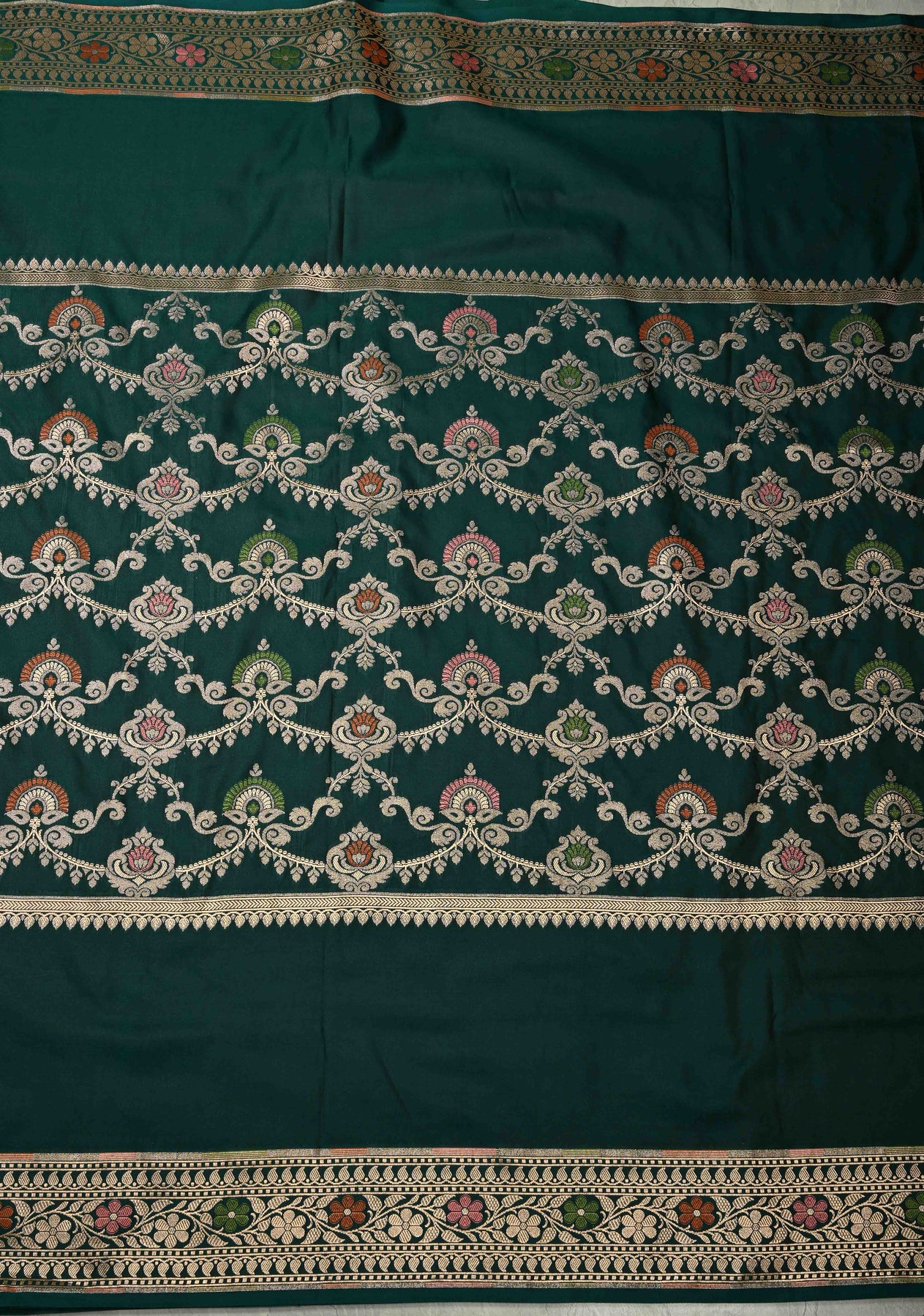 This Dark Bottle Green Semi Mashru Silk Saree exudes regal sophistication with its hue and luxurious texture. The body features an intricate Meenakari floral jaal panel, showcasing exquisite craftsmanship and detailed artistry. A shimmering zari border enhances the saree’s elegance, adding a refined and opulent touch. Made from soft semi Mashru silk, it drapes gracefully, combining comfort with grandeur—perfect for weddings, festive occasions, and special celebrations.