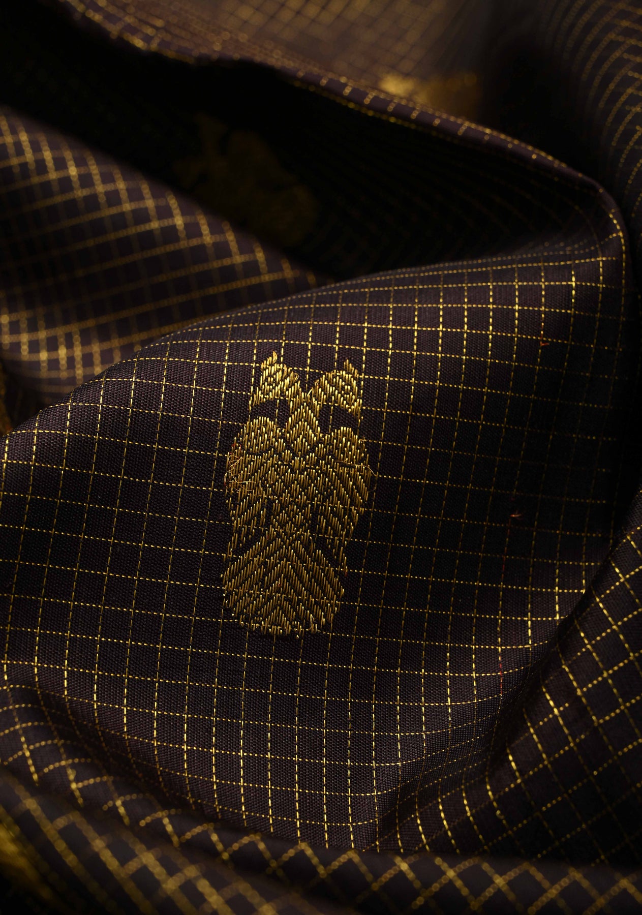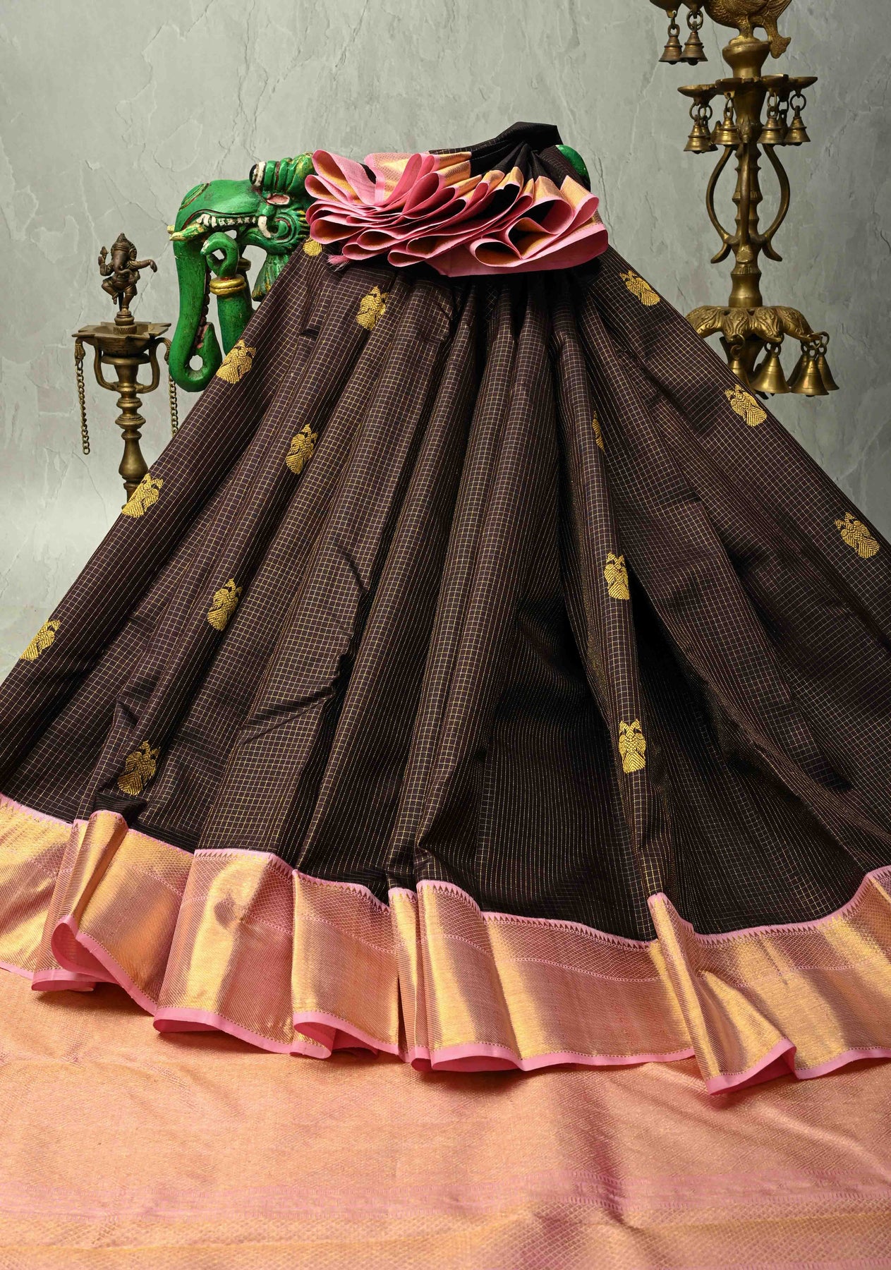 Embrace the grandeur of tradition with this magnificent Dark Brown Kanjivaram Pure Silk Saree, masterfully woven with intricate Podi Kattam (fine checkered) patterns in rich golden zari. The classic zari checks create a timeless texture, symbolizing the heritage craftsmanship of Kanchipuram weavers.
