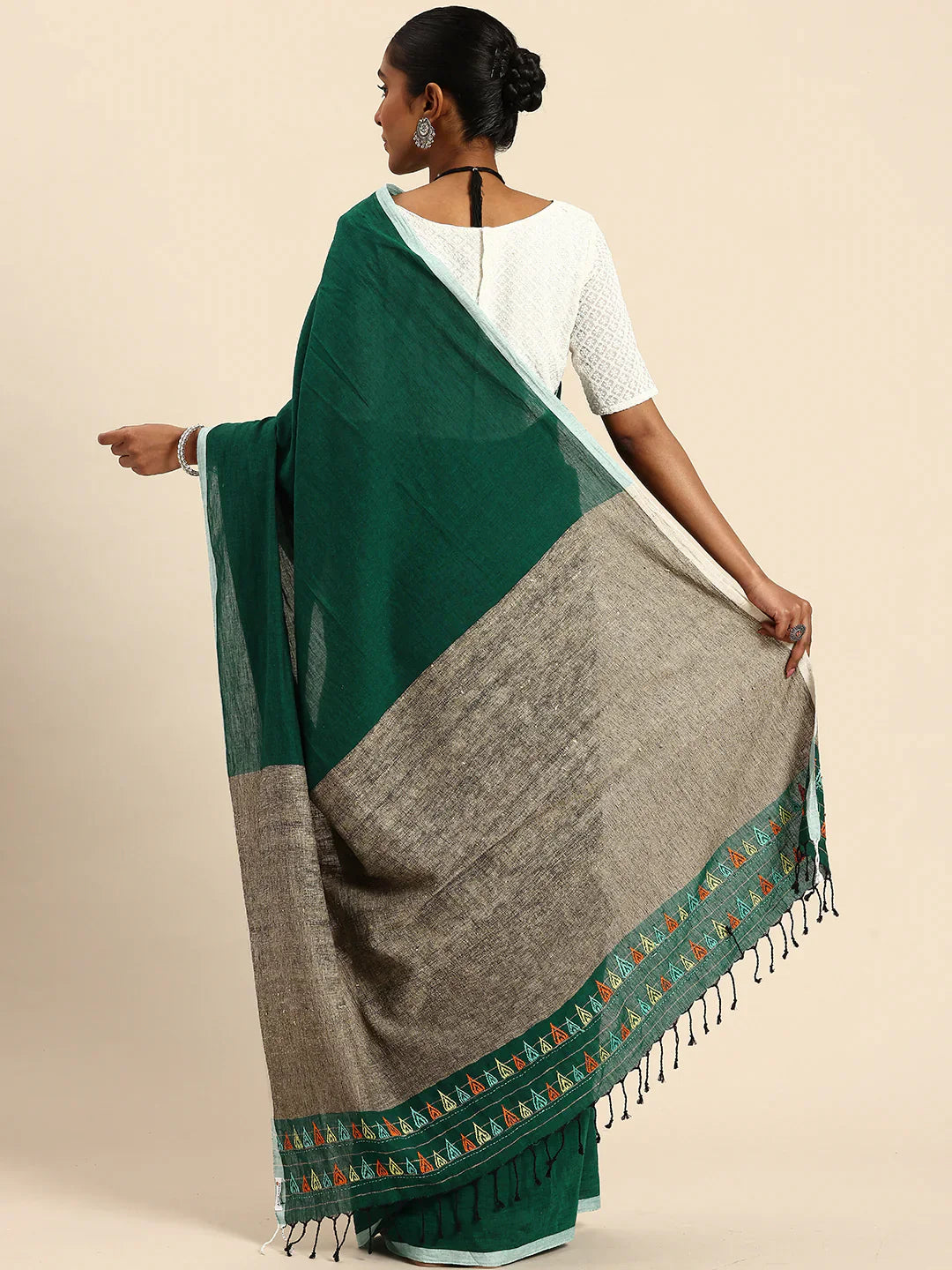 Dark Green 100% Cotton Handloom Saree with Kantha Embroidery on Ghicha Pallu and Blouse Piece