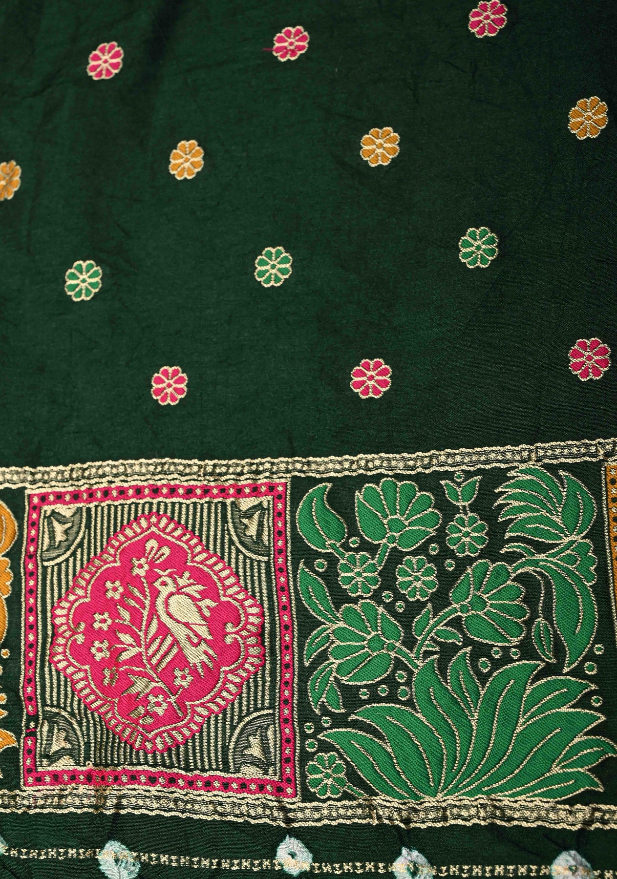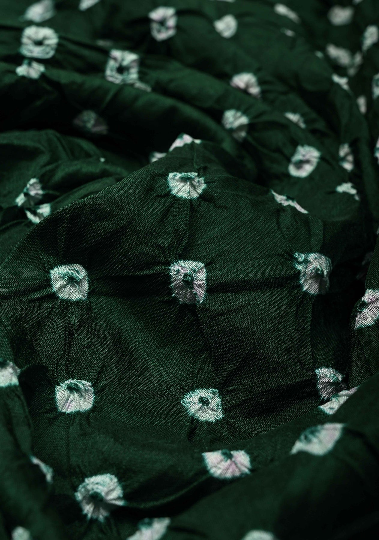 This rich Dark Green Crushed Bandhini on Art Silk Saree is a stunning blend of traditional artistry and contemporary design. The green shade enhanced with the classic crushed Bandhini tie-dye pattern adds texture and vibrancy to the saree. It is beautifully accentuated by an intricate Meenakari zari border, adding a touch of shimmering elegance. The village-themed pallu showcases detailed motifs inspired by rural life, making this saree a perfect choice for festive occasions and cultural celebrations, celebrating heritage with style.
