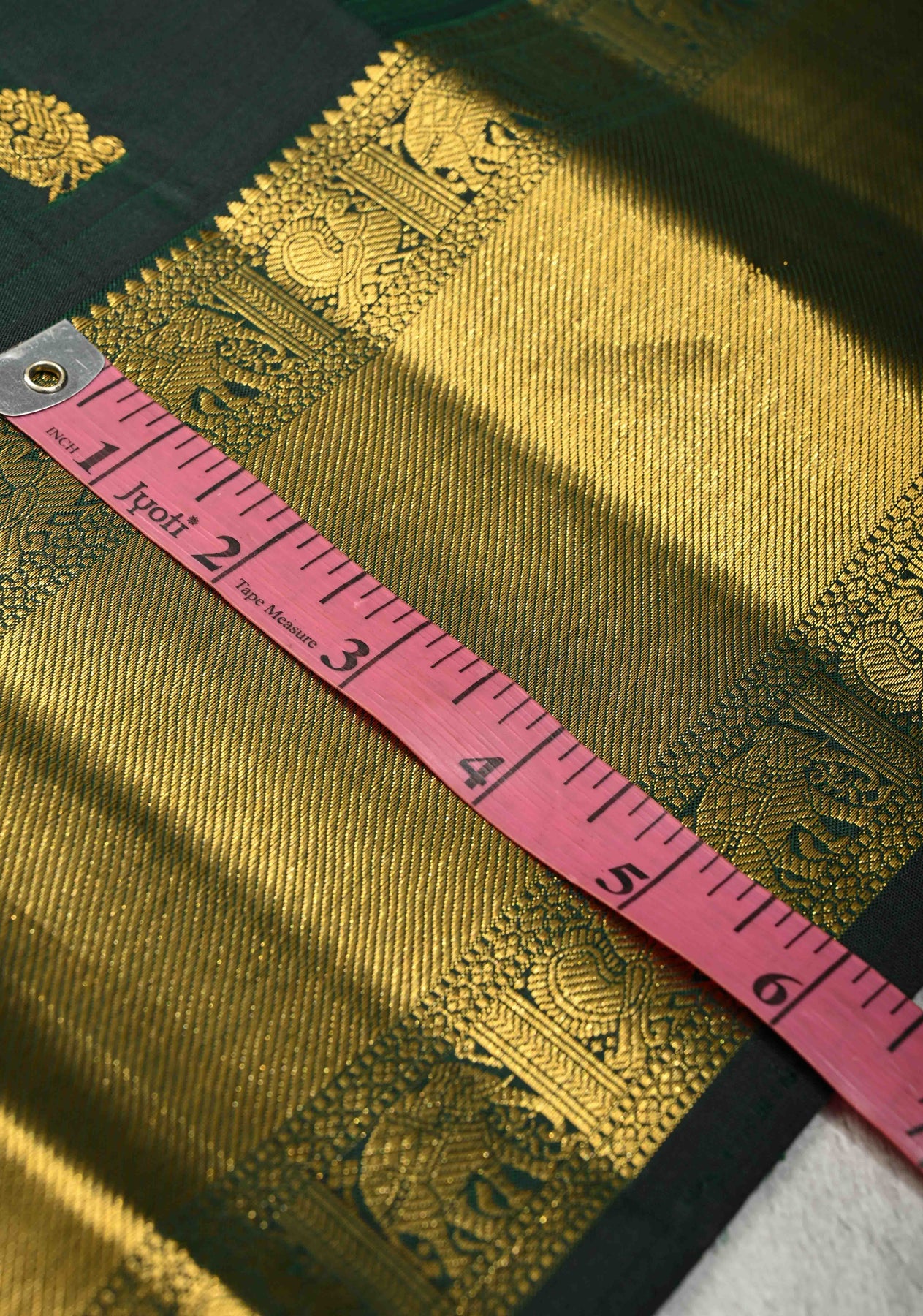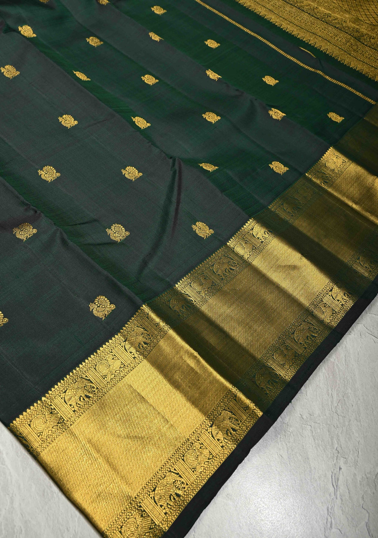 Dark Green Dual Tone Pure Kanjivaram Silk Saree with Peacock Buttas and Zari Borders| SILK MARK CERTIFIED