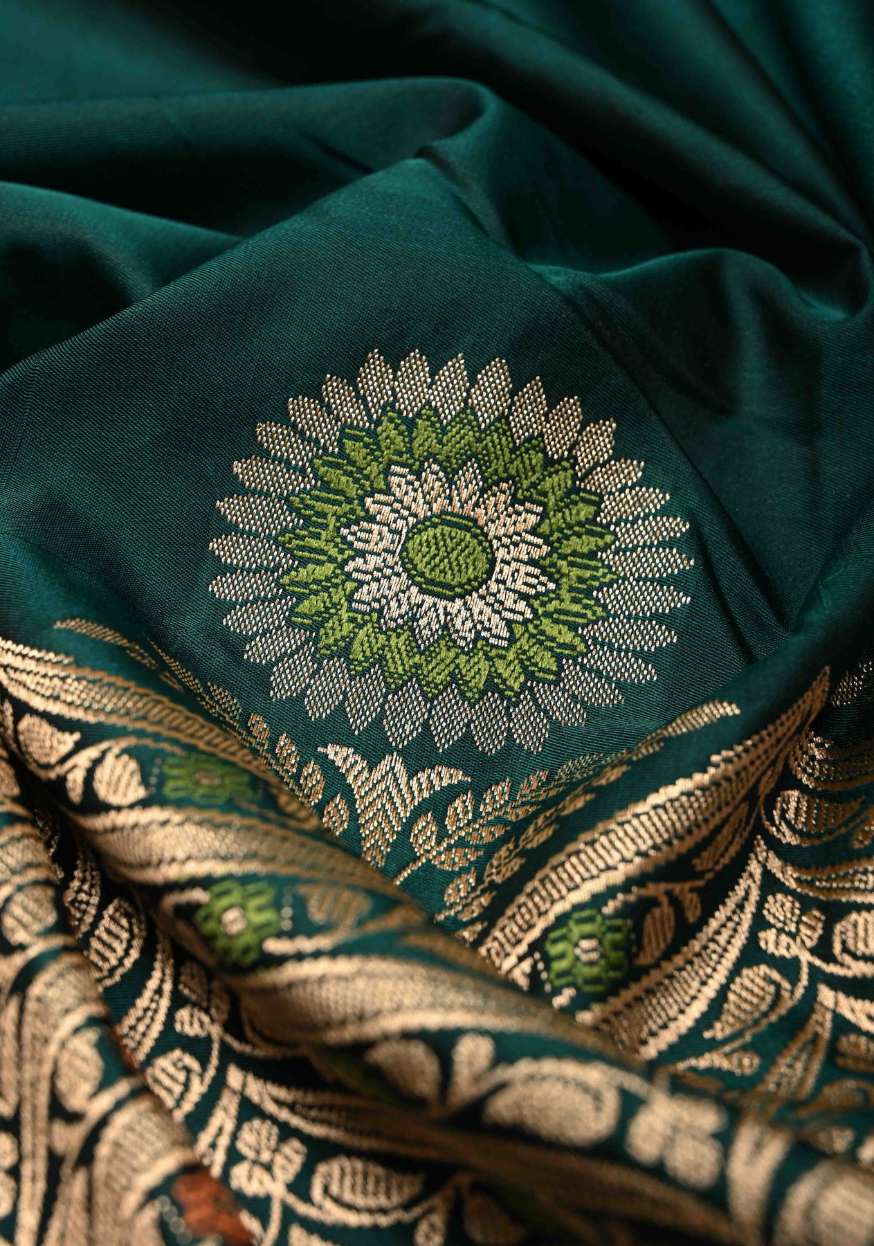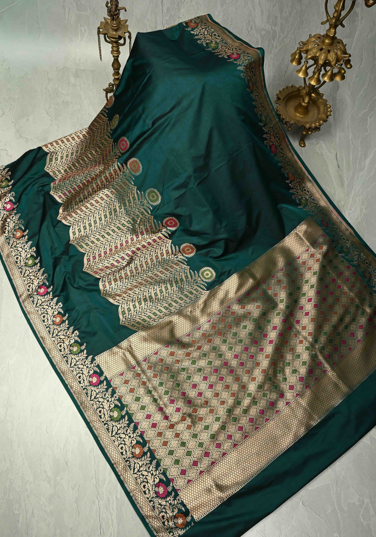 This Dark Green Semi Mashru Silk Saree radiates timeless elegance with its hue and luxurious texture. The body is adorned with an intricate Meenakari zari brocade panel, showcasing delicate craftsmanship and vibrant metallic detailing. Complementing the opulent panel is a graceful floral border, adding a refined and sophisticated touch. Crafted from semi Mashru silk, the saree drapes effortlessly, offering both comfort and grandeur—making it perfect for weddings, festive occasions, and special celebrations.