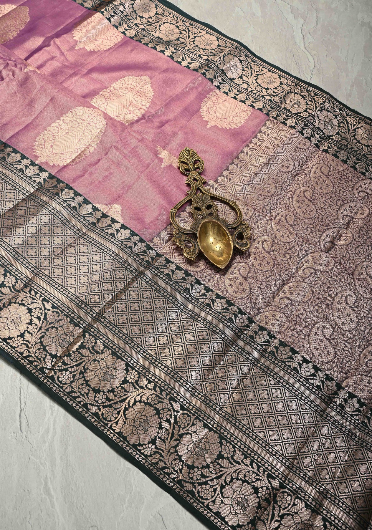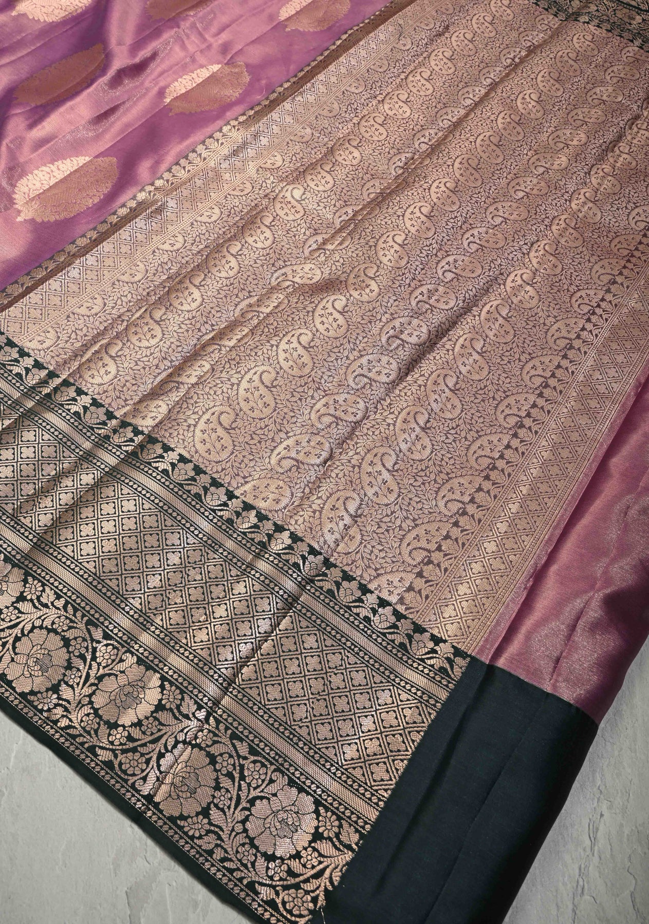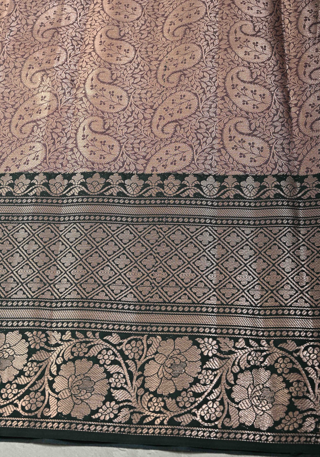 Exude regal sophistication in this Mauve Pink Tissue Kanjivaram Semi Silk Saree, featuring a luminous metallic sheen that radiates elegance. The shimmering mauve body is beautifully adorned with oversized silver zari floral buttas. A striking contrast is created by the wide dark green border, intricately woven with traditional geometric diamonds and ornate floral vine patterns. Lightweight with a structured drape, it is a perfect choice for weddings and grand festivities.