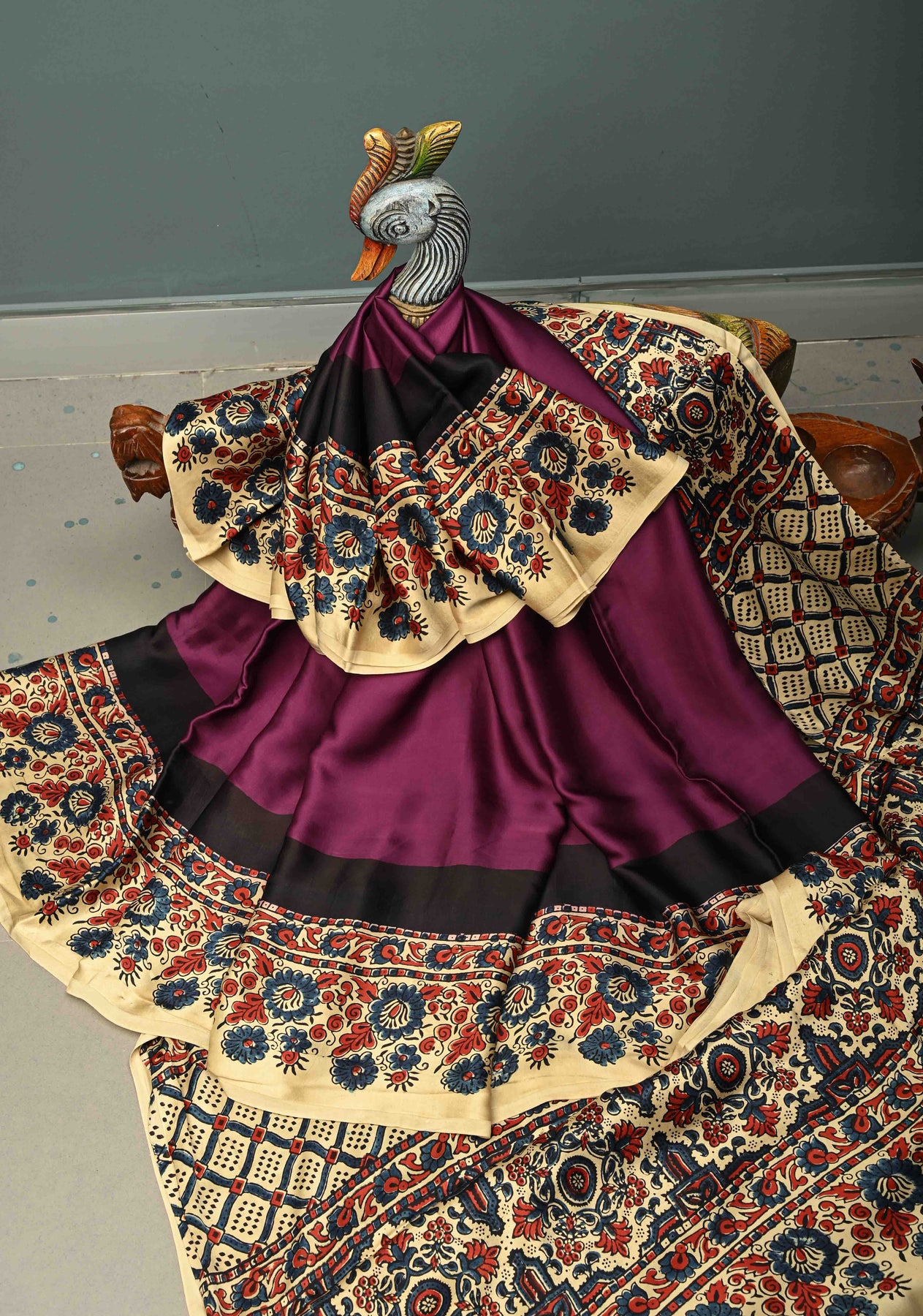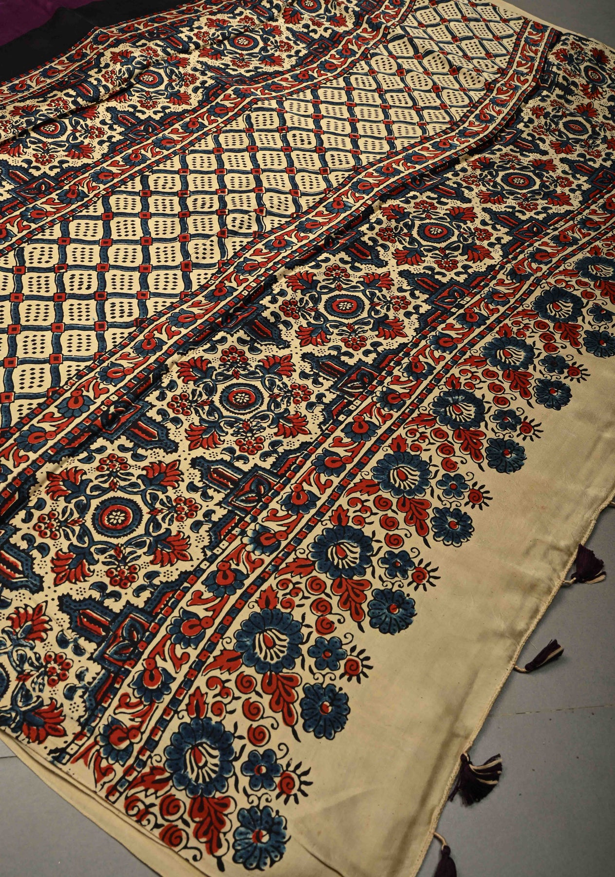 Elevate your ethnic wardrobe with this Dark Purple Modal Silk Saree, adorned with exquisite Ajrakh hand-block prints that showcase traditional craftsmanship. The rich purple base is beautifully complemented by intricate patterns and a matching Ajrakh border, adding depth and elegance to the saree. Crafted from soft, lightweight modal silk, it drapes gracefully, ensuring comfort along with a refined, luxurious look. Perfect for festive occasions, cultural events, and evening gatherings, this saree combines timeless artisanal artistry with contemporary style, making it a standout piece for any special occasion..