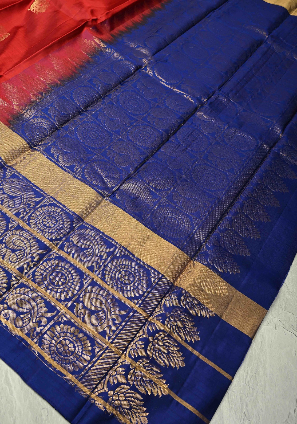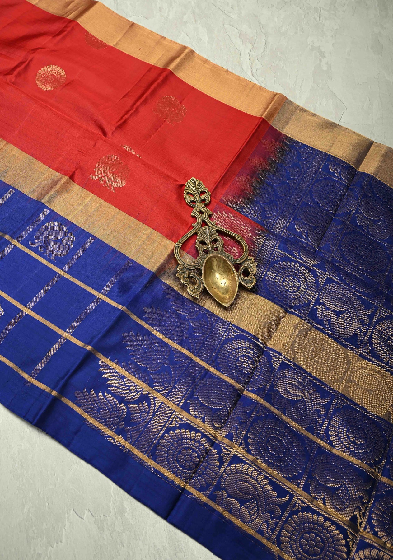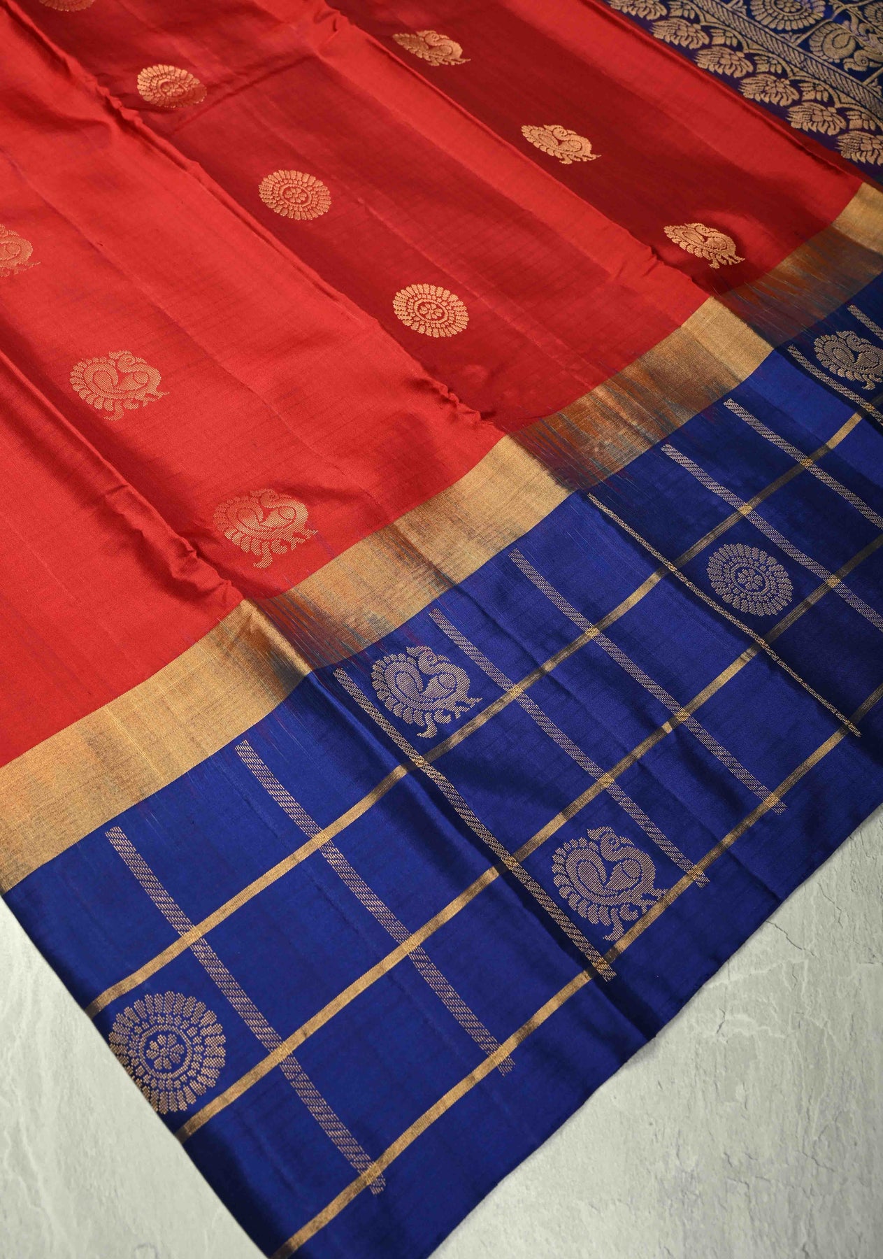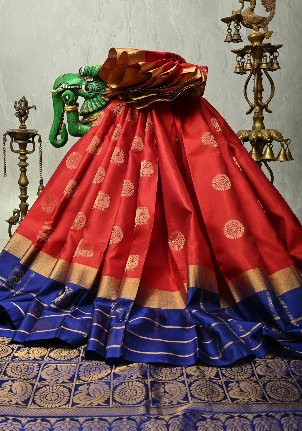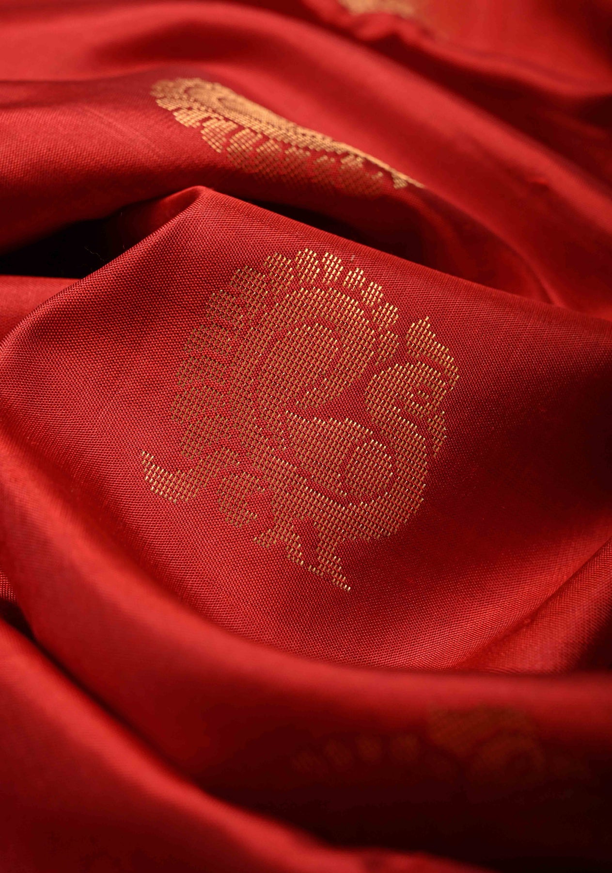Make a striking impression with this Dark Red Kanjivaram Soft Silk Saree, featuring elegant zari buttas and a bold wide contrast zari checks border. Crafted from soft silk, this saree offers a smooth, drape that beautifully complements the vibrant red hue.