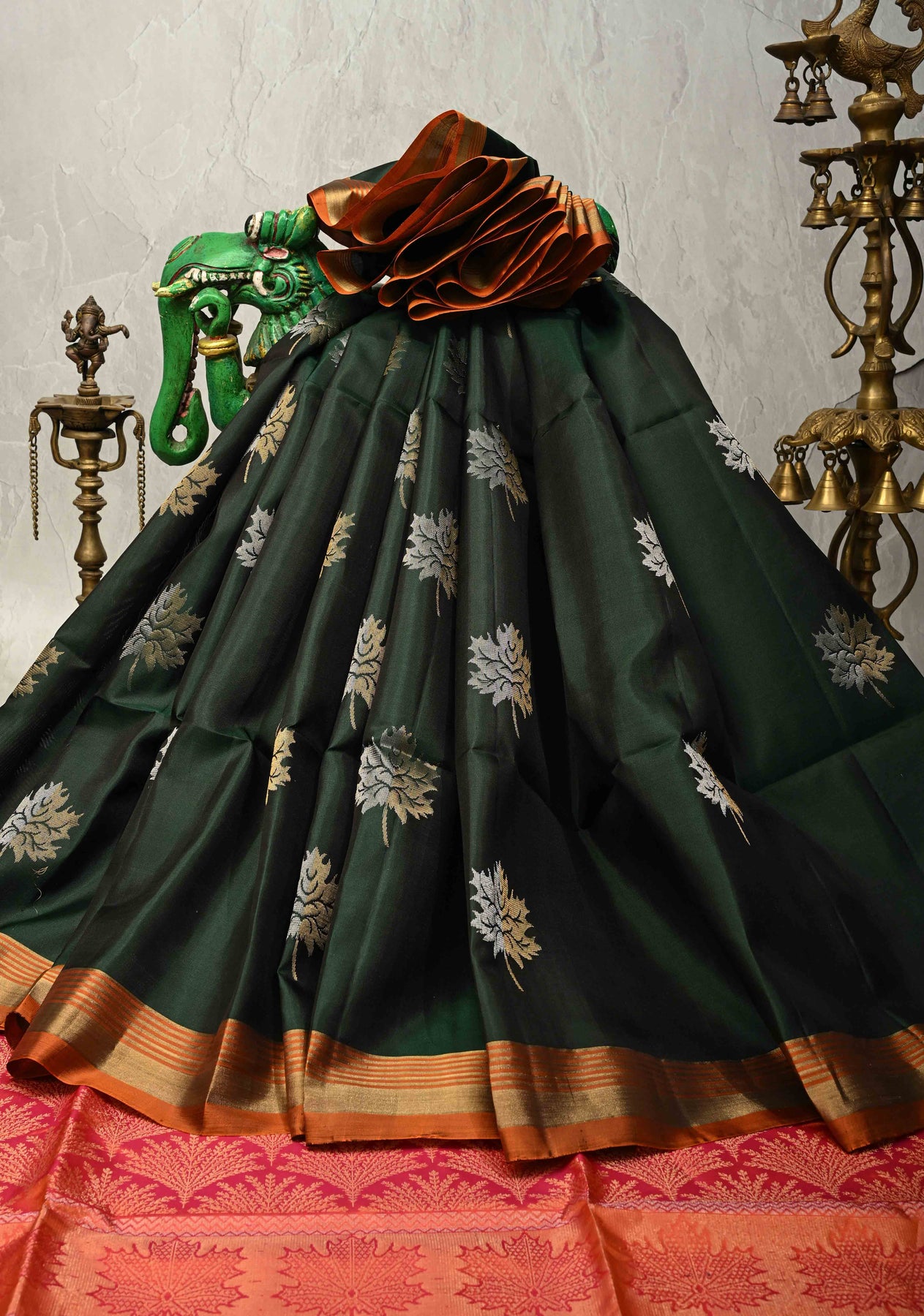 The forest green body is beautifully adorned with intricate gold-silver leaf buttas, adding a refined shimmer and artistic charm. Enhancing the saree’s appeal is a contrast wide checks border, which provides a bold yet balanced finish, highlighting the saree’s regal character. A perfect choice for those who appreciate heritage designs with a modern edge.