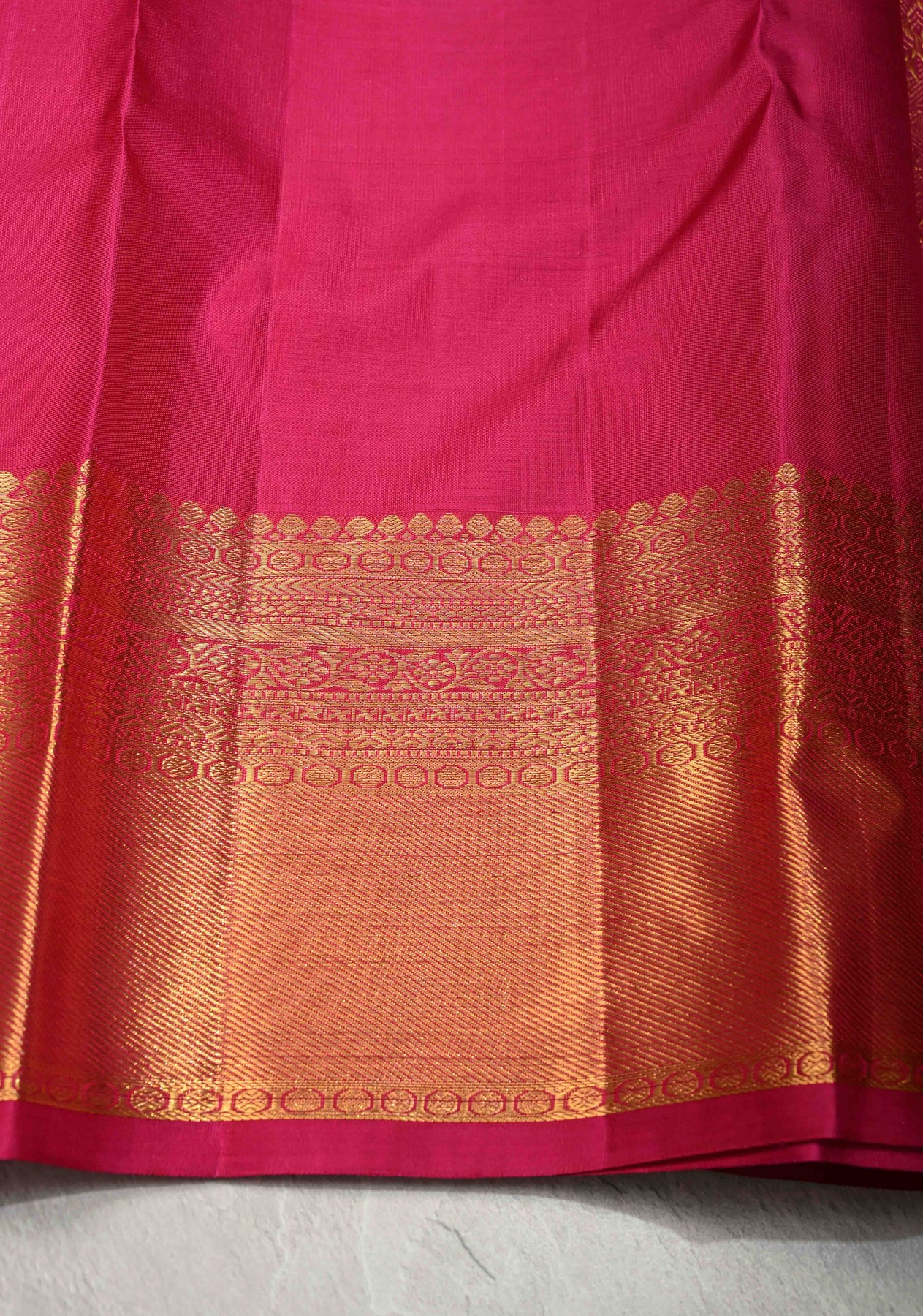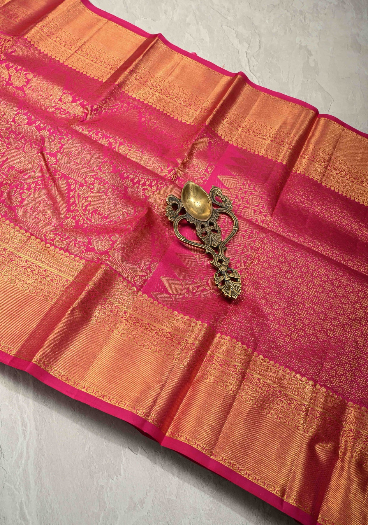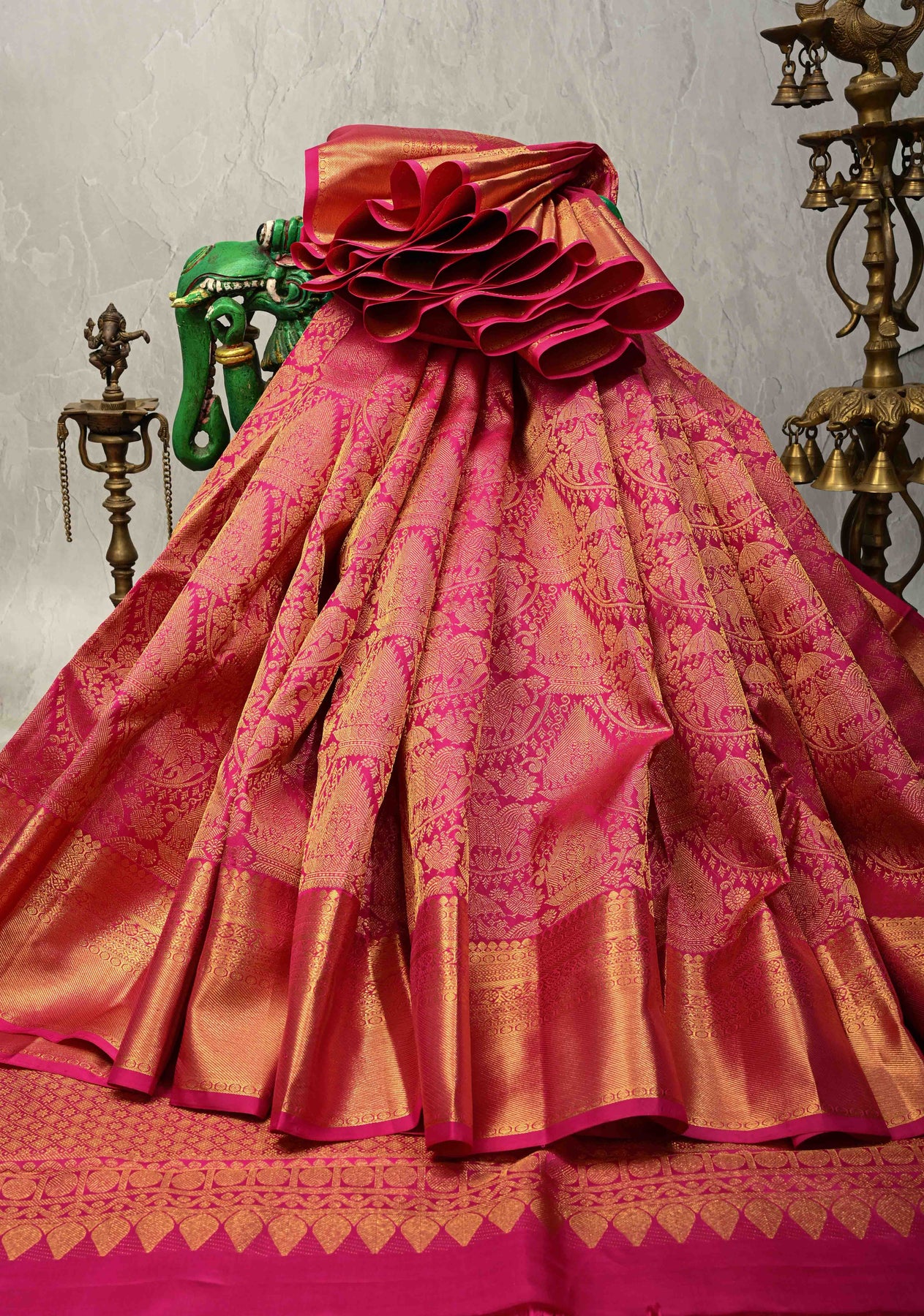 The pink body is adorned with intricate Vanasingaram brocade, showcasing exquisite motifs that reflect heritage artistry. A wide zari border completes the design, adding opulence and highlighting the timeless craftsmanship of Kanchipuram weaving. A perfect heirloom saree for those who appreciate elegance, tradition, and sophistication.
