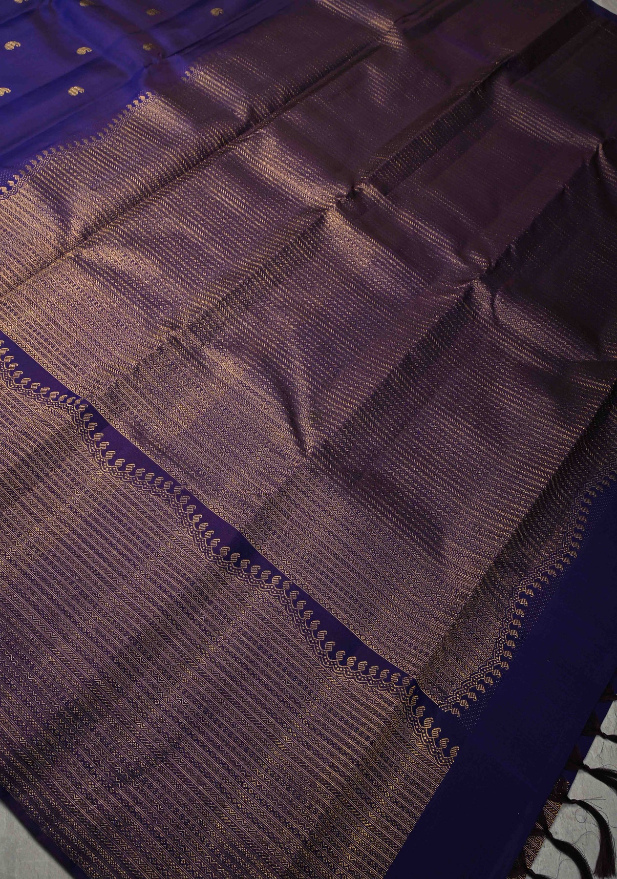 Step into a world of regal elegance with this Deep Purple Kanjivaram Pure Silk Saree, a true embodiment of traditional craftsmanship and luxury. The deep purple hue exudes sophistication, while the saree is beautifully adorned with delicate buttas that add subtle charm and texture. Its striking contrast zari border enhances the overall appeal with intricate gold threadwork, creating a perfect balance between vibrant color and classic design. Crafted from the finest pure silk, this saree offers a lustrous finish and sumptuous feel, making it an ideal choice for weddings, festive occasions, and cultural celebrations where you want to leave a lasting impression