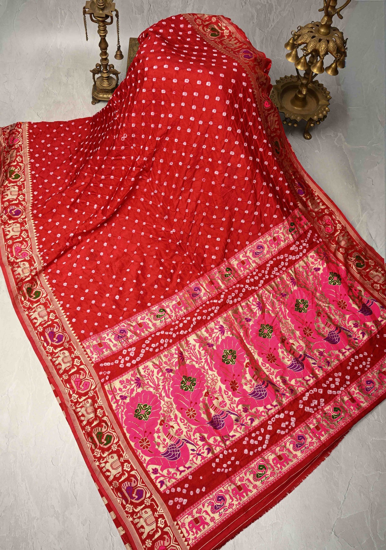 Drape yourself in timeless tradition with this Deep Red Crushed Bandhani Saree, crafted on soft and flowy art silk that mimics the rich texture of pure silk. The saree showcases the intricate beauty of traditional Bandhani tie-dye, enhanced by a delicate crushed finish that adds texture and grace to the drape.