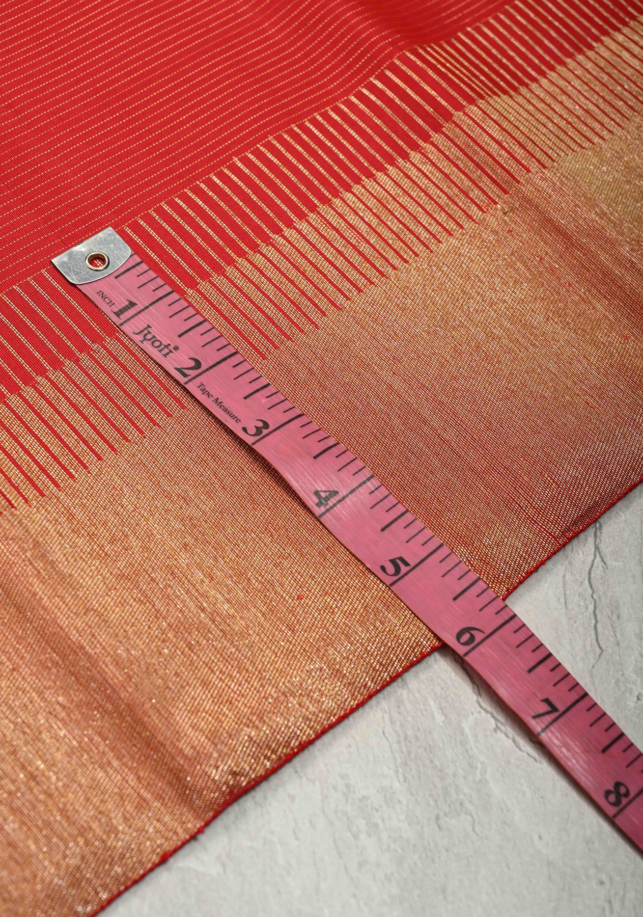 This deep red pure Kanjivaram silk saree is a classic embodiment of traditional elegance and rich craftsmanship. The body is adorned with graceful Vairaoosi zari stripes, adding depth and a refined shimmer to the silk. A beautifully woven tissue zari border enhances the saree with a subtle glow and regal finish. Crafted from pure silk, it reflects the timeless artistry of Kanchipuram weaving. Perfect for weddings, festive occasions, and grand celebrations, this saree makes a striking and graceful statement.