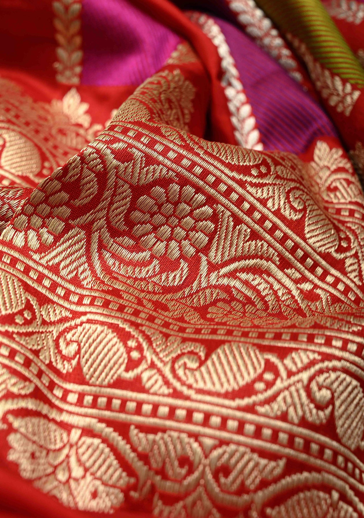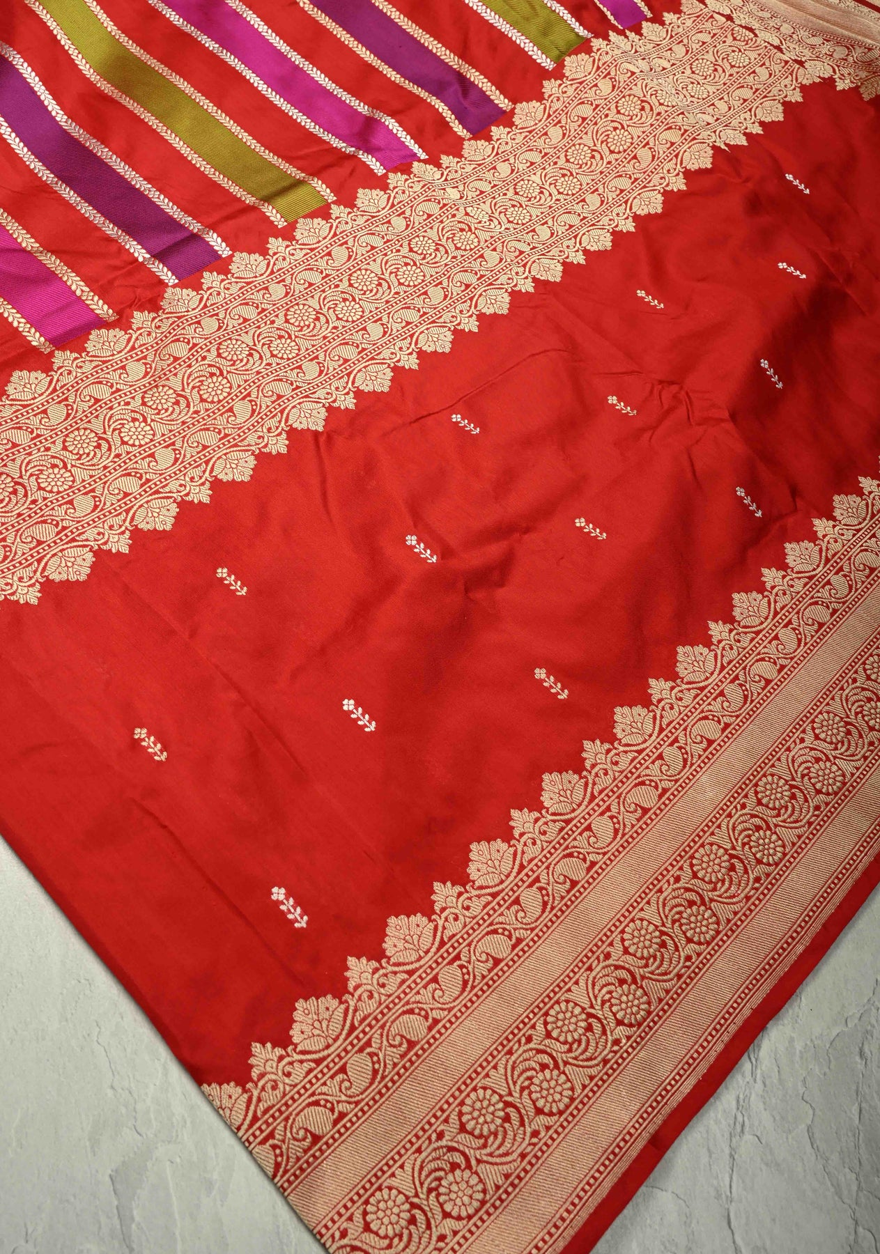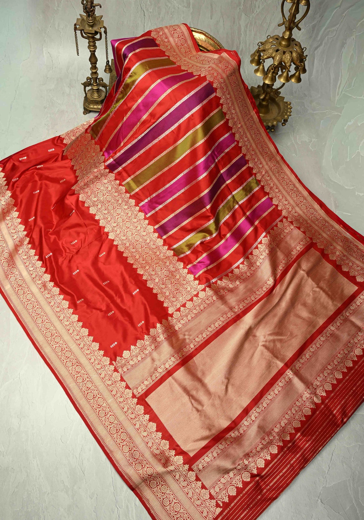Bold and beautifully crafted, this Deep Red Banarasi Katan Silk Saree is a striking showcase of traditional weaving techniques. The saree features half-and-half vertical stripes created using the meticulous Rangkaat technique, offering a unique interplay of color and pattern. Woven on luxurious pure Katan silk, the body is embellished with elegant zari buttas, adding a touch of classic charm. A richly detailed panel-style zari border frames the saree, enhancing its regal look. Perfect for weddings, festive occasions, or evening events, this saree is a statement piece for those who seek timeless Banarasi artistry with a bold twist