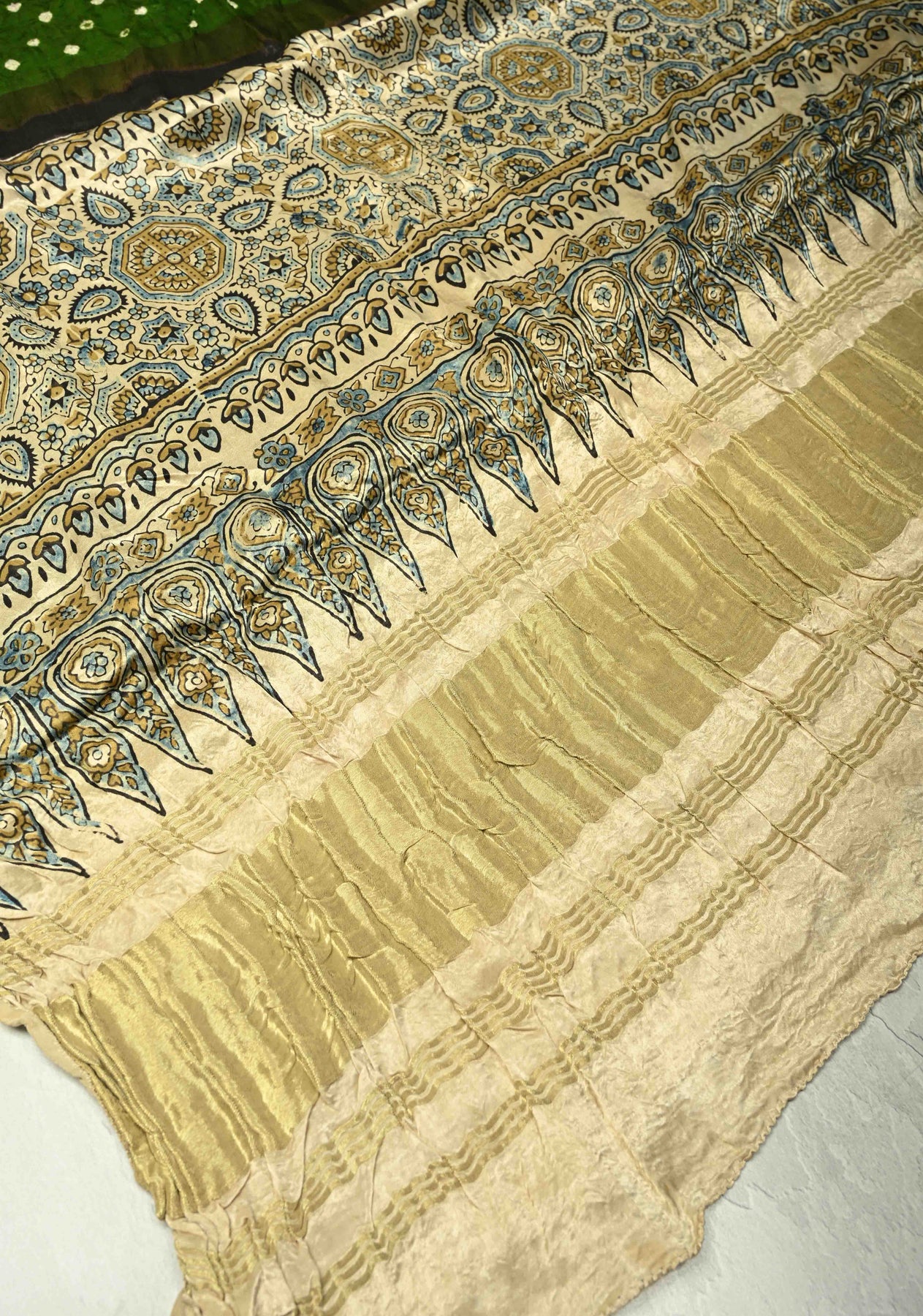Experience the perfect blend of tradition and sophistication with this Green Modal Silk Dupatta. Crafted from luxuriously soft modal silk, this dupatta showcases an exquisite fusion of Ajrakh block print and Bandhani tie-dye patterns, celebrating the timeless artistry of Indian textiles. The rich green hue exudes elegance, while the Lagda zari pallu adds a touch of golden shimmer, making it ideal for festive occasions, weddings, or cultural gatherings.