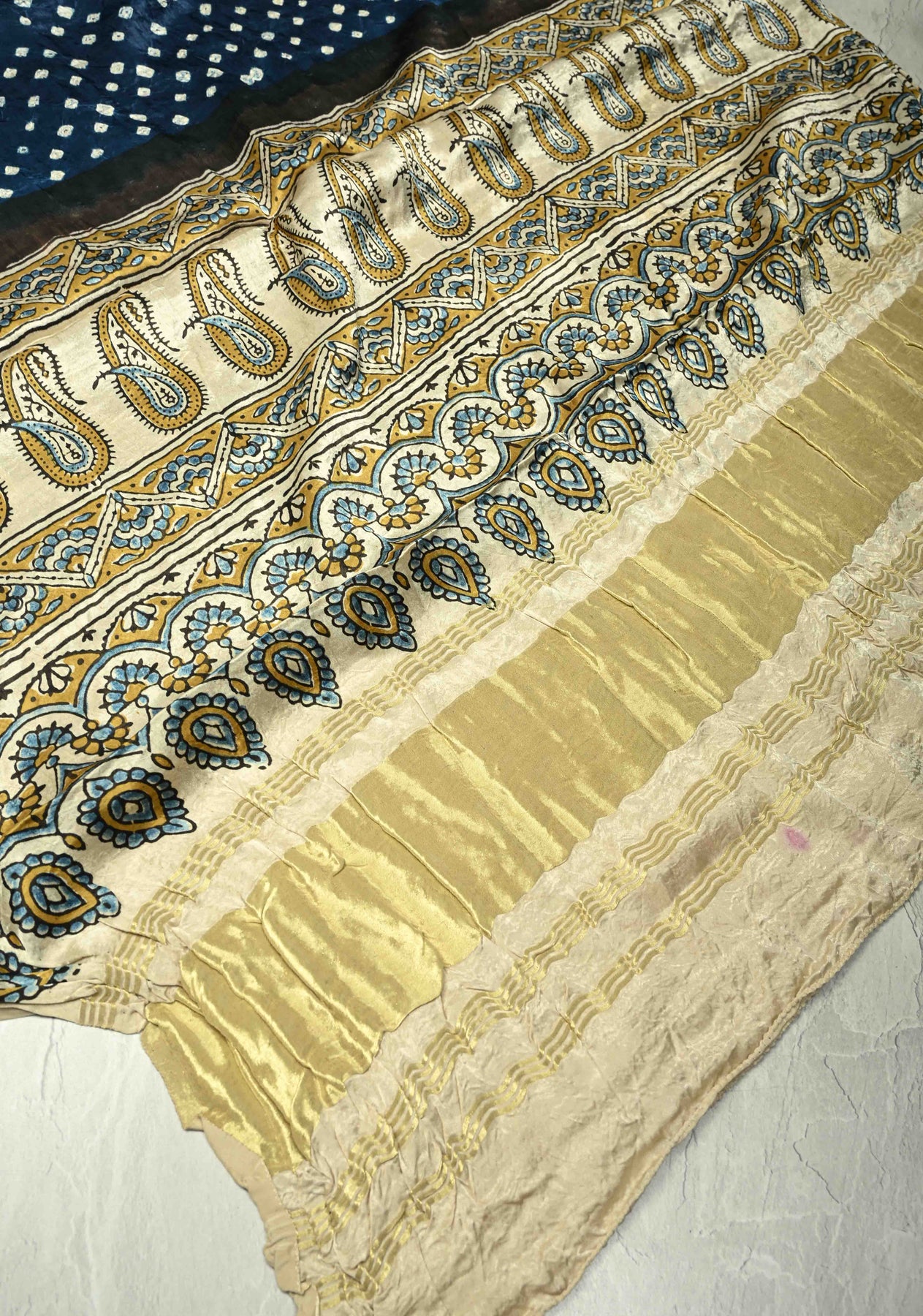 Add a touch of ethnic elegance with this Blue Modal Silk Dupatta, featuring a unique Ajrakh and Bandhni fusion design. Handwoven from soft, lightweight modal silk, it drapes gracefully while offering a subtle sheen.